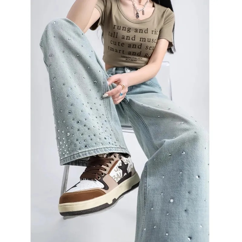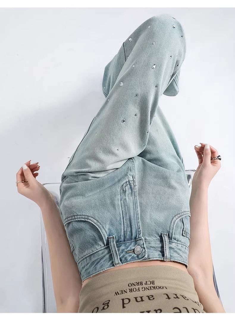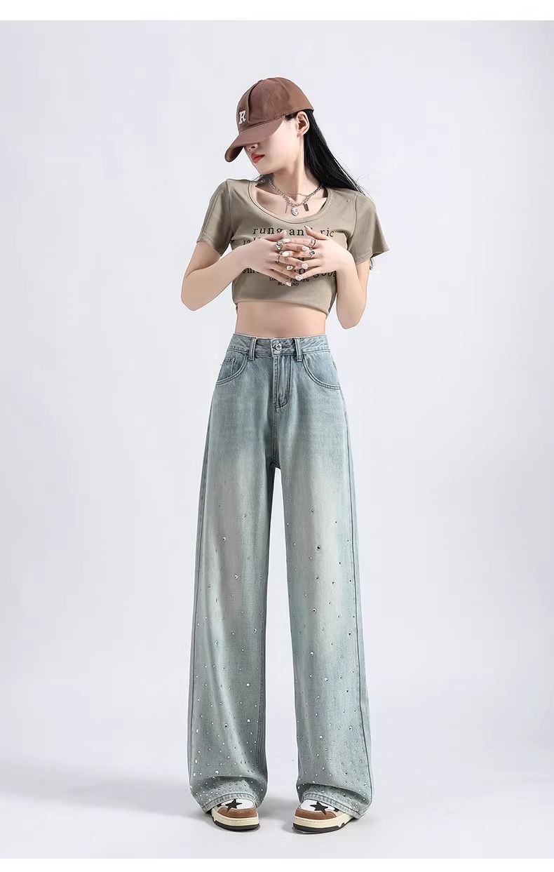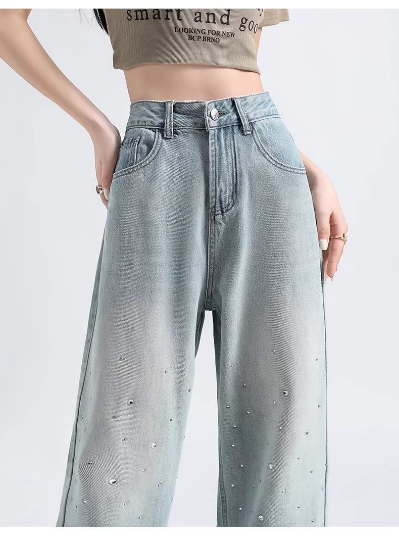 MY17689# 设计感烫钻牛仔裤春夏新款浅色欧货重工带钻高腰直筒拖地阔腿裤子女裝貨源服裝批發