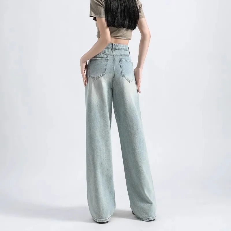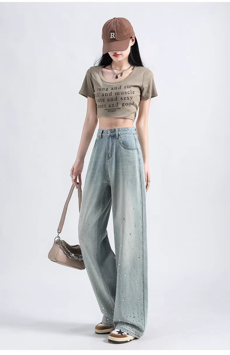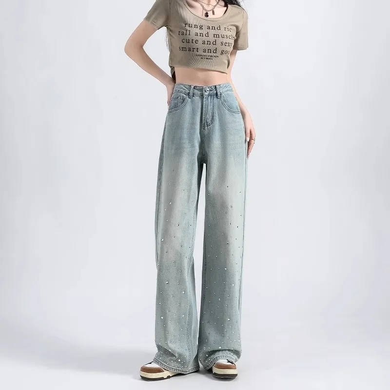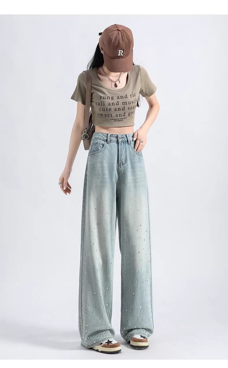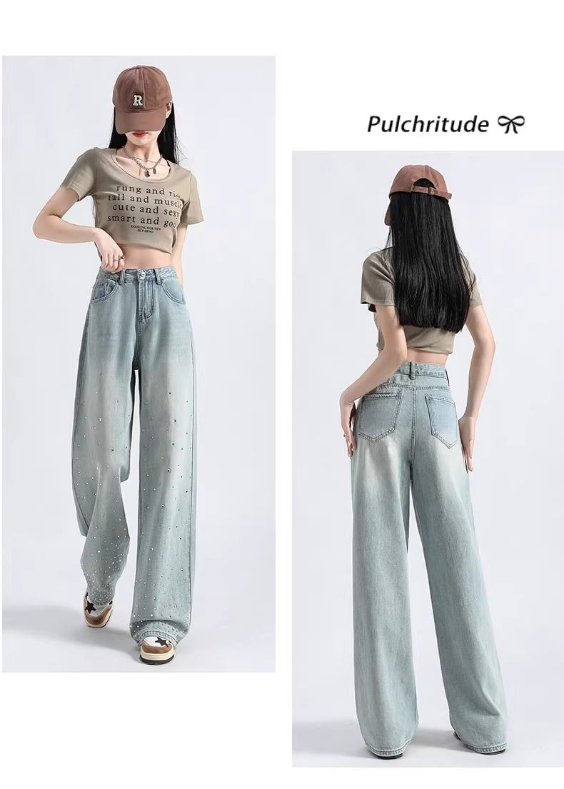 MY17689# 设计感烫钻牛仔裤春夏新款浅色欧货重工带钻高腰直筒拖地阔腿裤子女裝貨源服裝批發