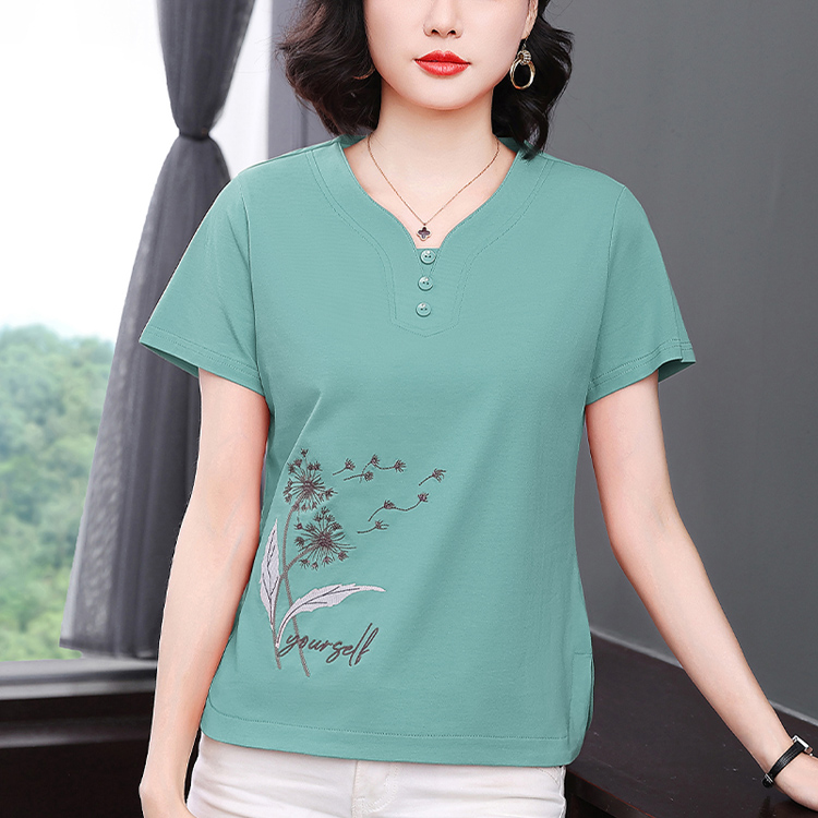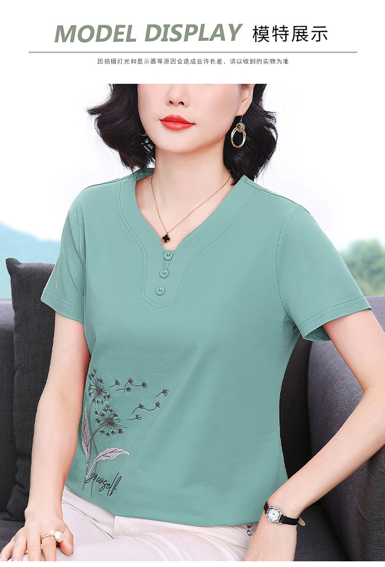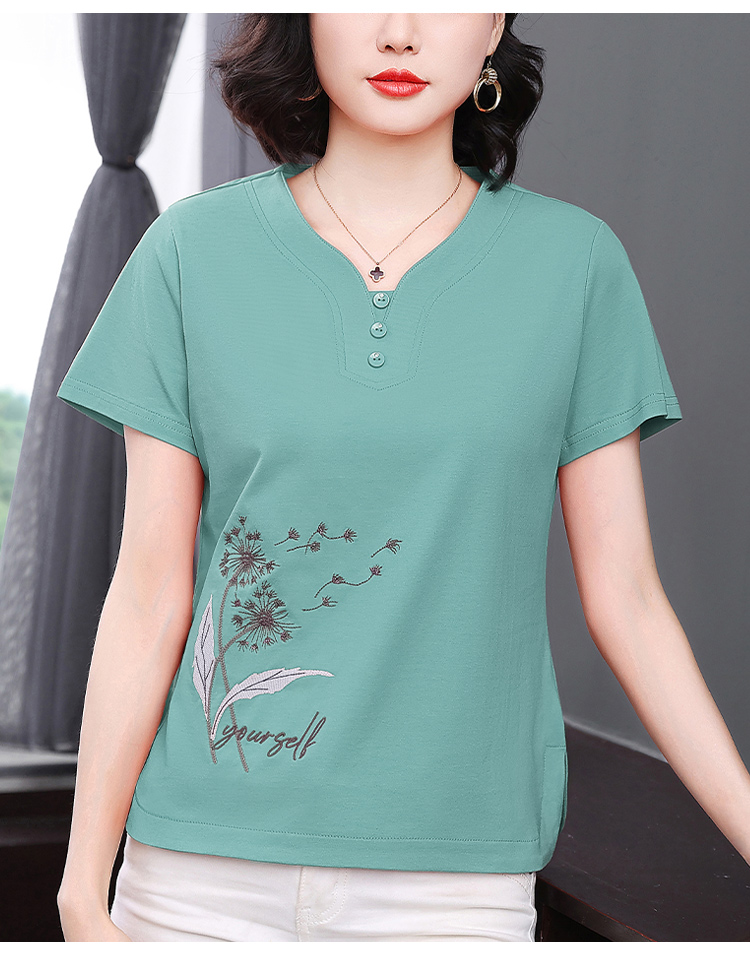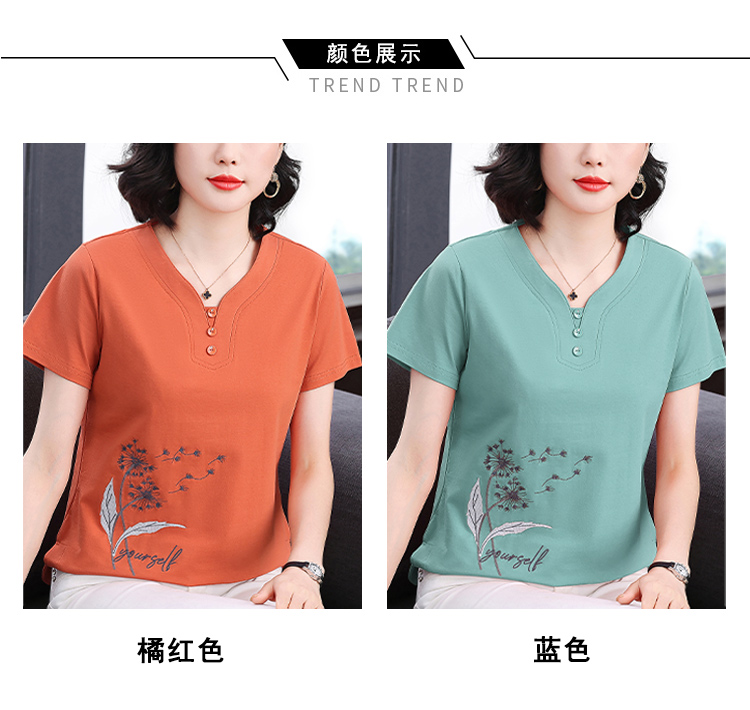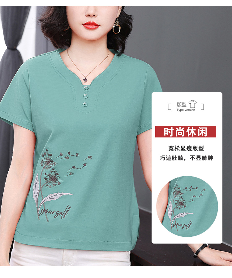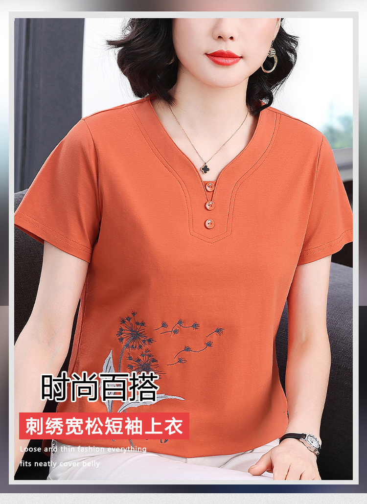 MY17714# 夏季新款套头V领休闲宽松大码妈妈装纯色刺绣棉短袖时尚女裝貨源服裝批發