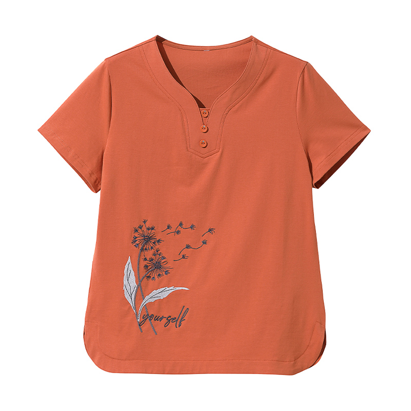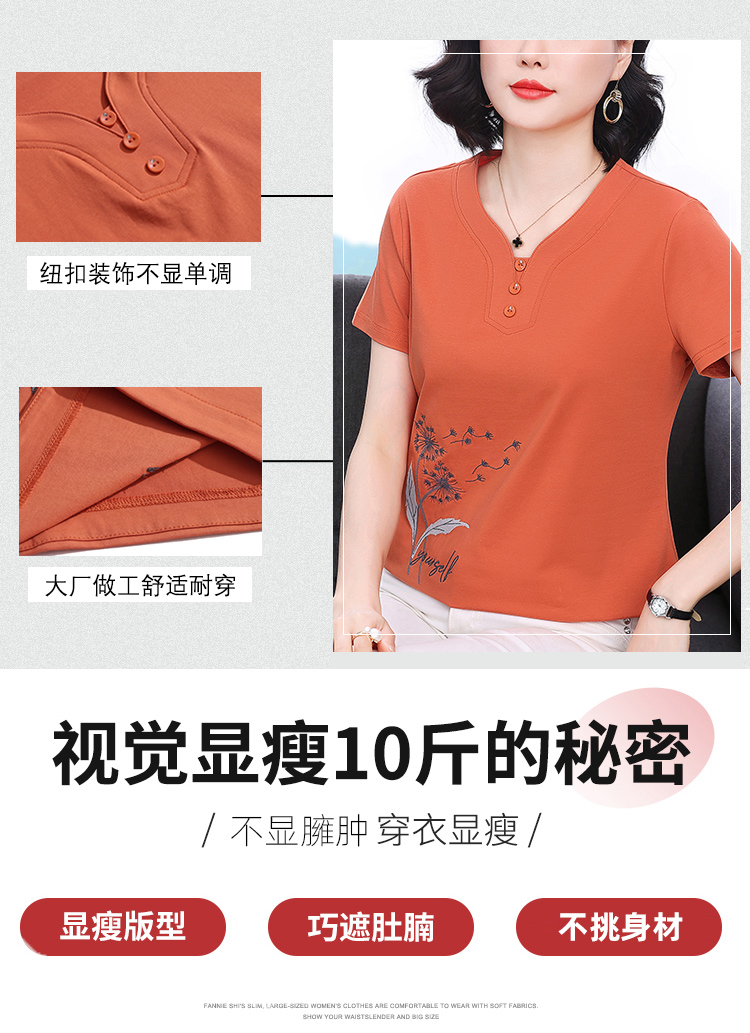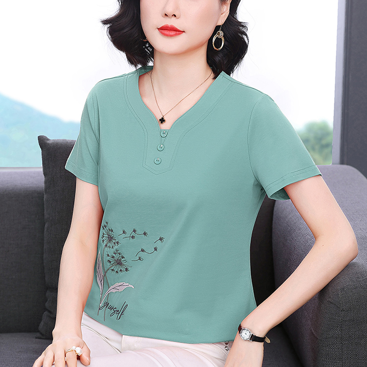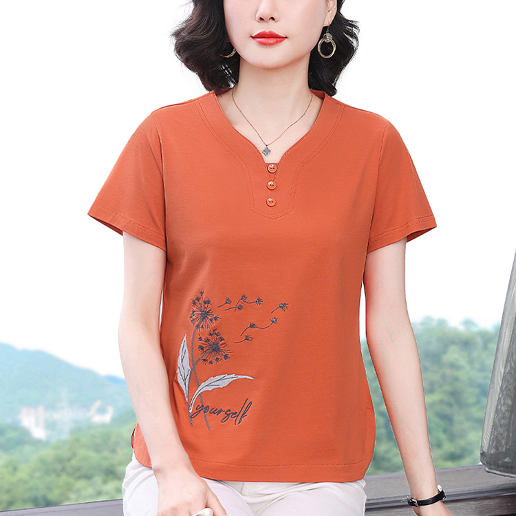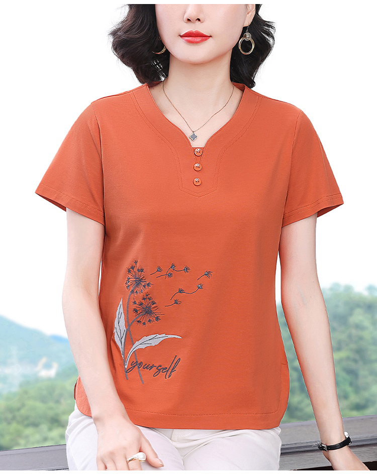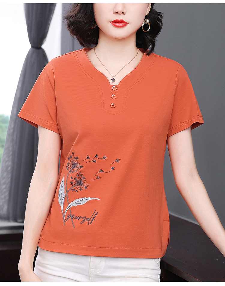 MY17714# 夏季新款套头V领休闲宽松大码妈妈装纯色刺绣棉短袖时尚女裝貨源服裝批發