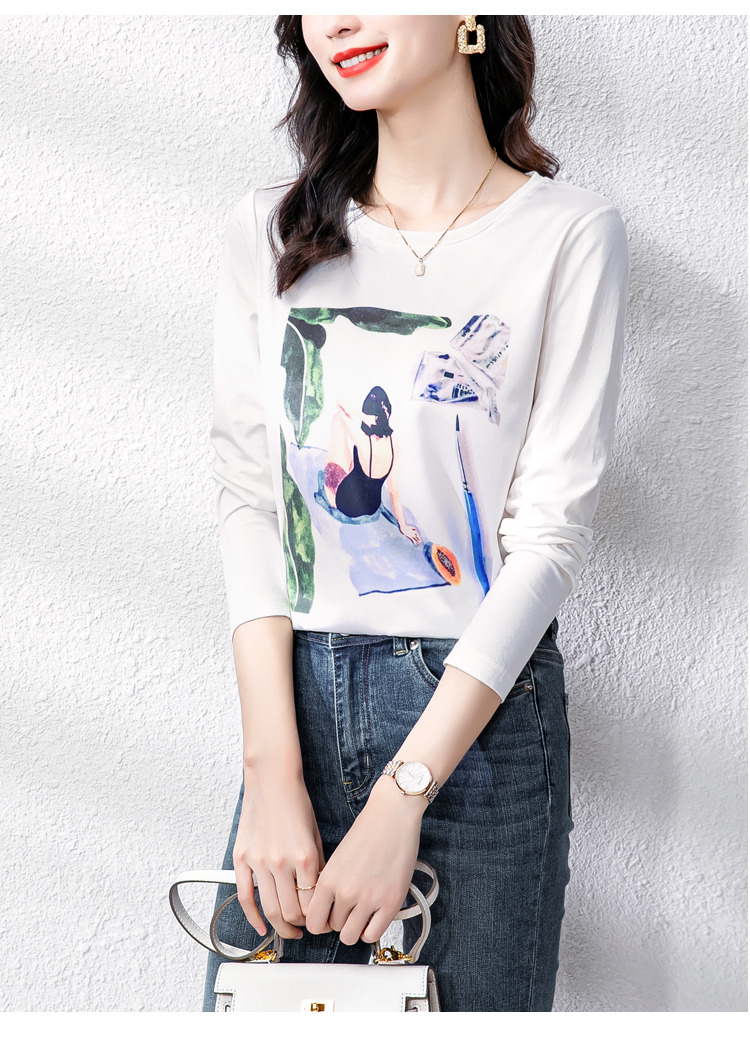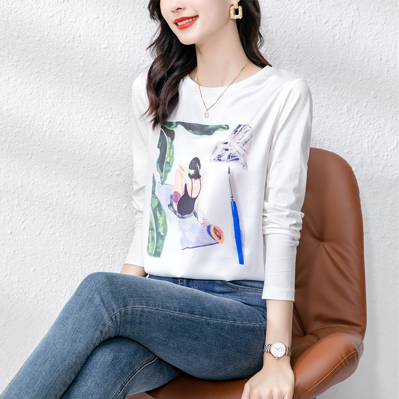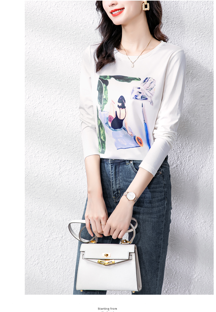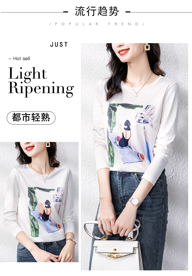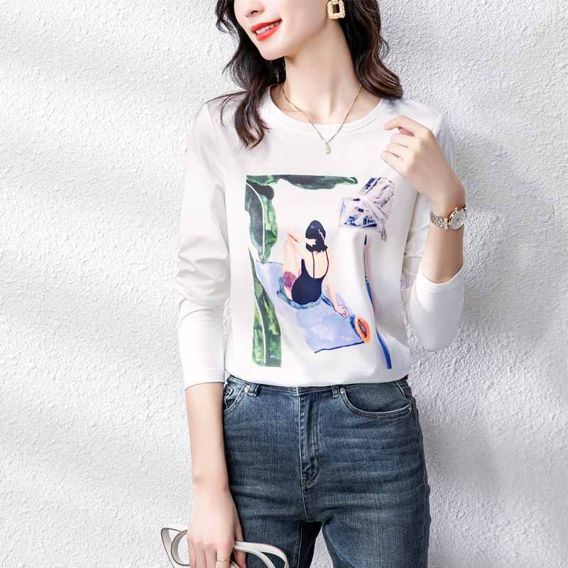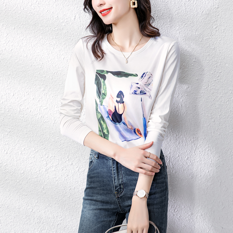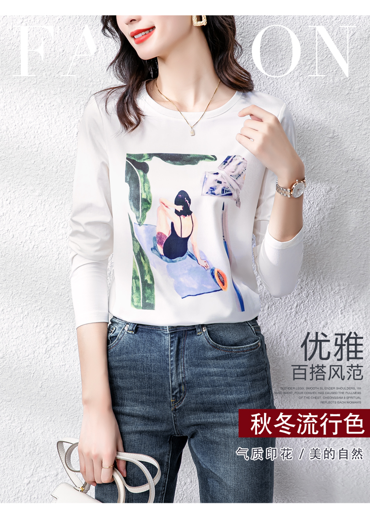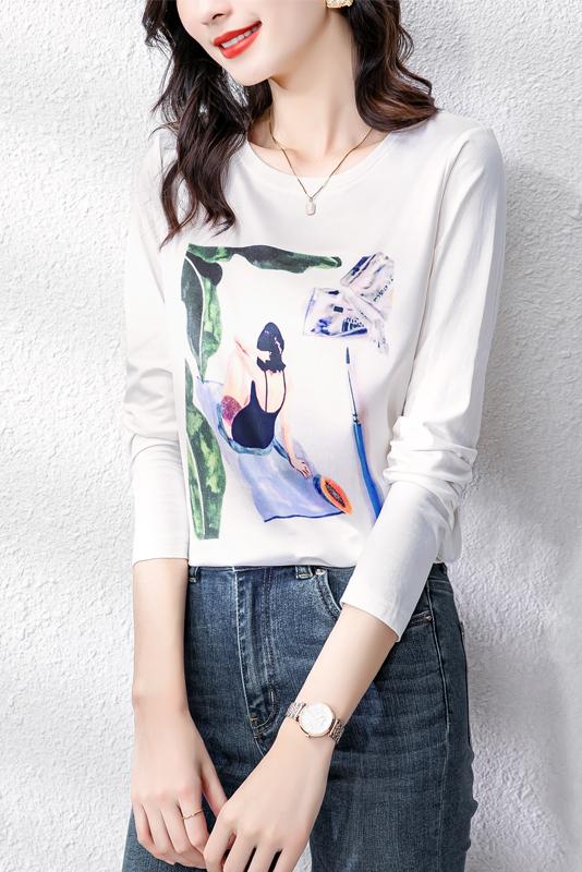 MY17726# 新款重磅仿真丝T恤宽松内搭长袖印花白色圆领打底上衣女裝貨源服裝批發