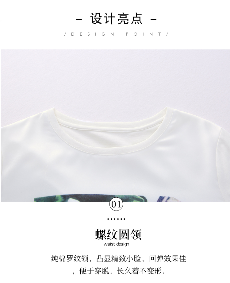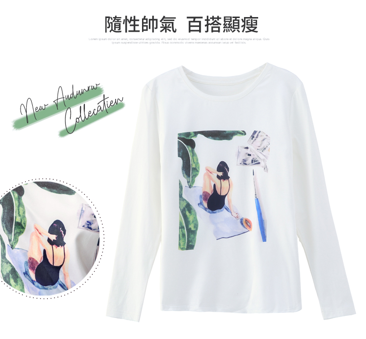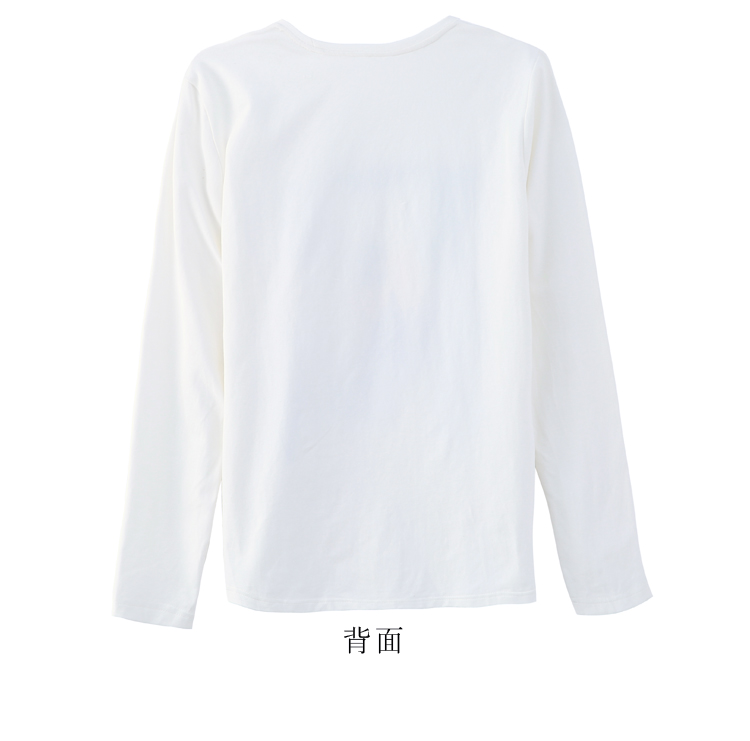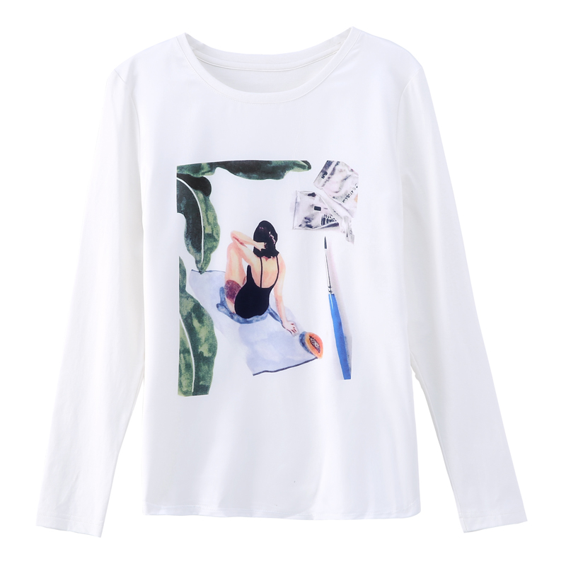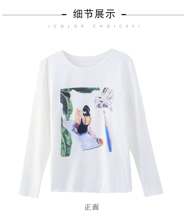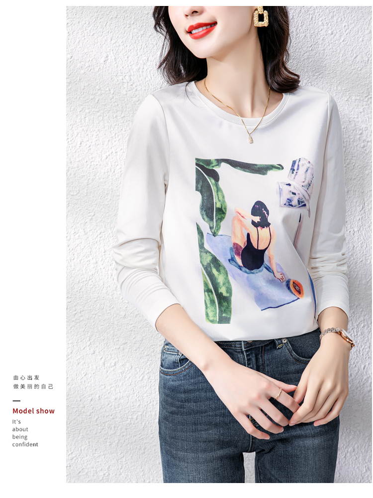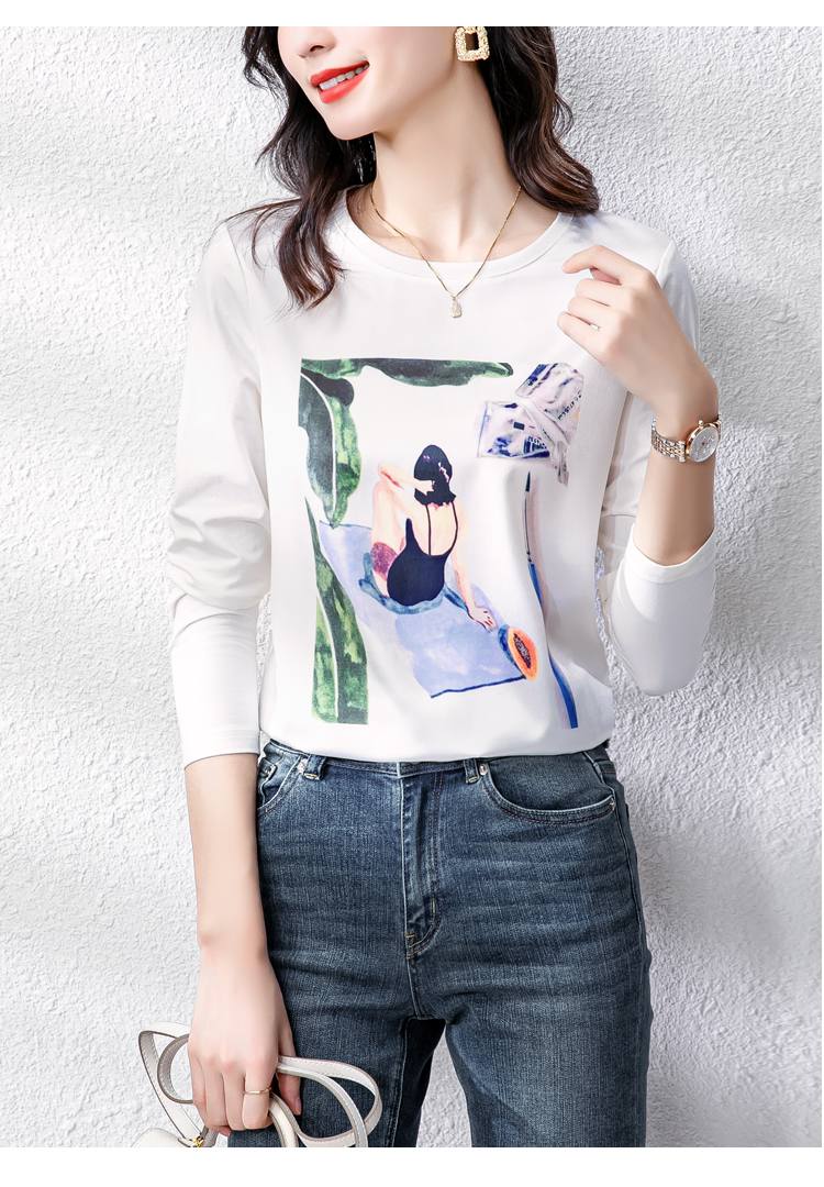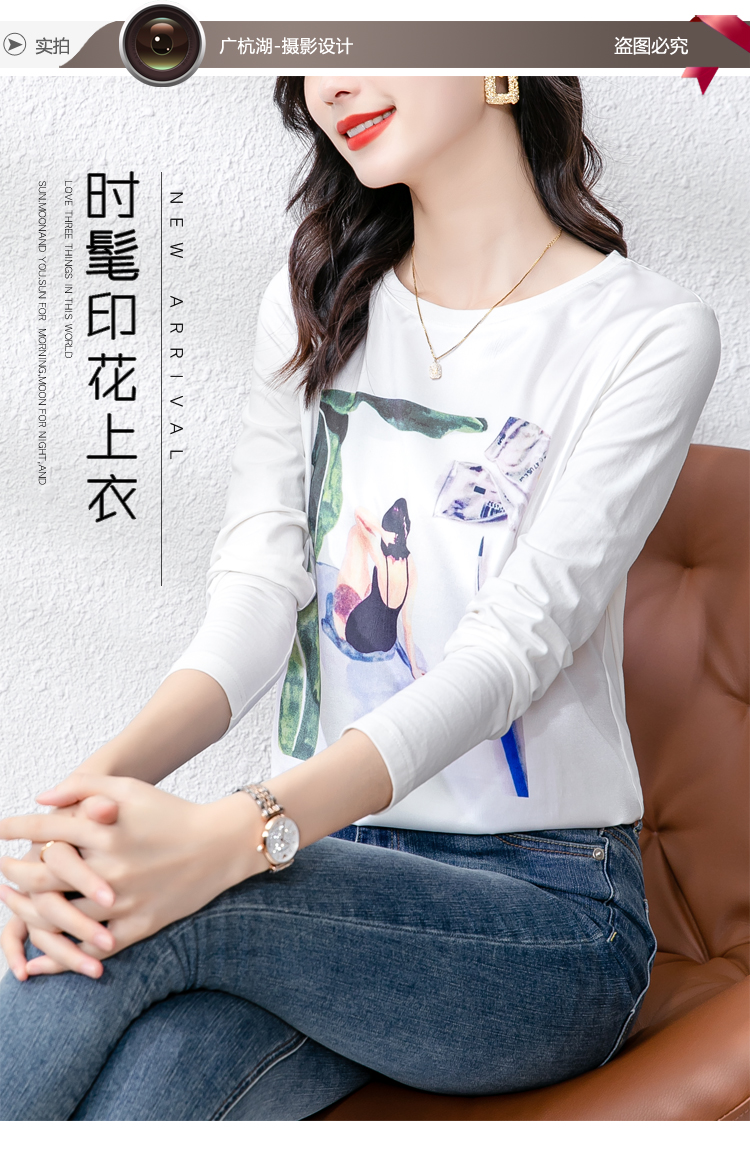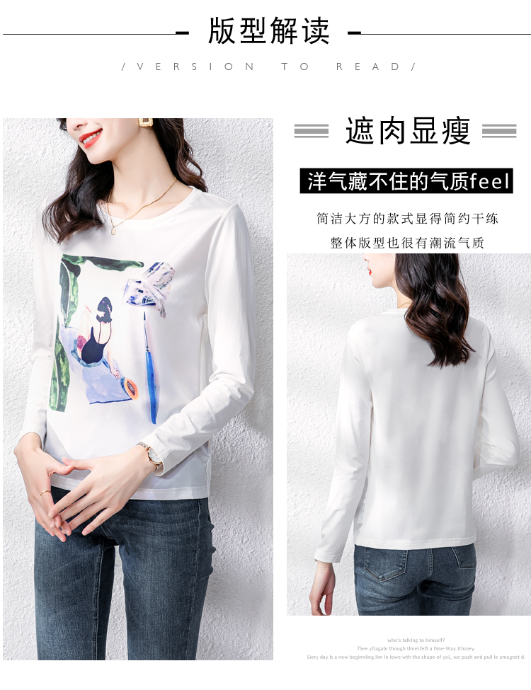 MY17726# 新款重磅仿真丝T恤宽松内搭长袖印花白色圆领打底上衣女裝貨源服裝批發