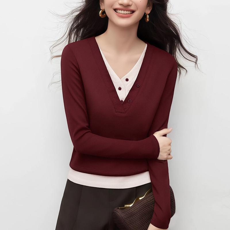 MY17730# 假两件拼色针织女长袖磨毛百搭打底衫显瘦上衣女裝貨源服裝批發