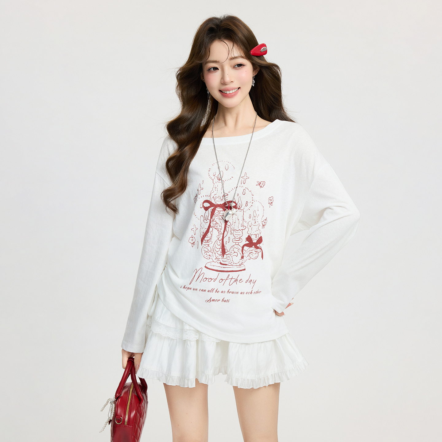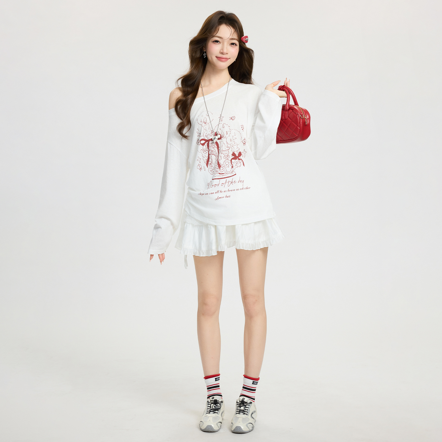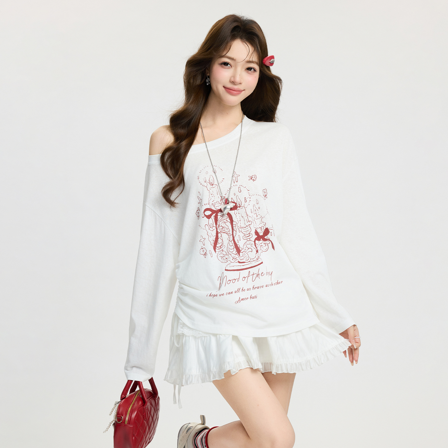 MY17737# 白色卡通印花斜肩长袖T恤宽松慵懒感气质上衣女裝貨源服裝批發