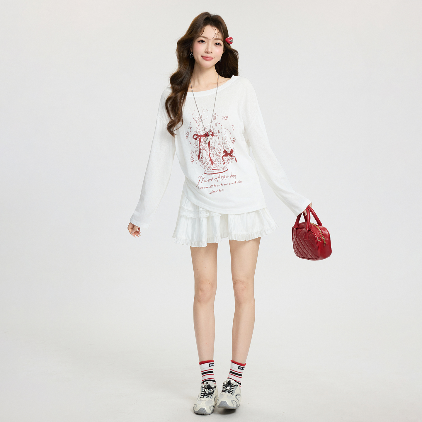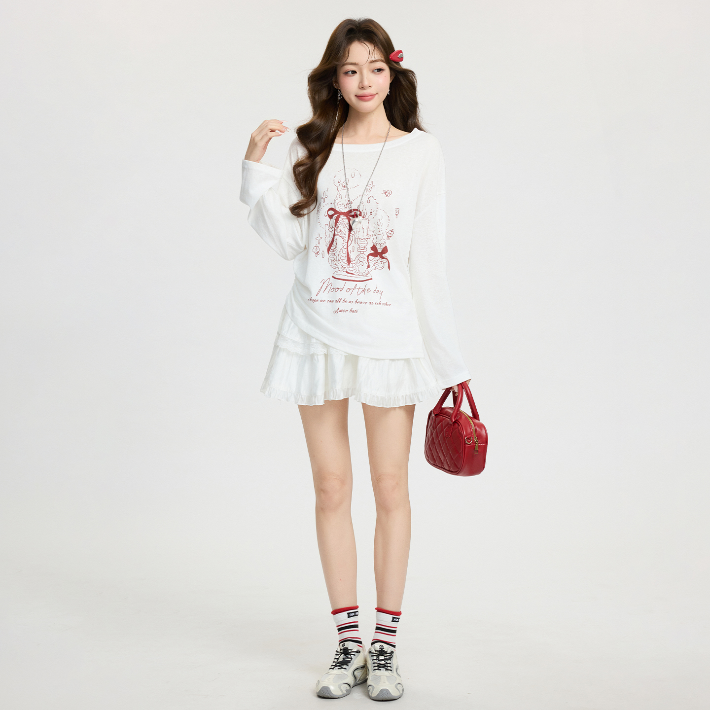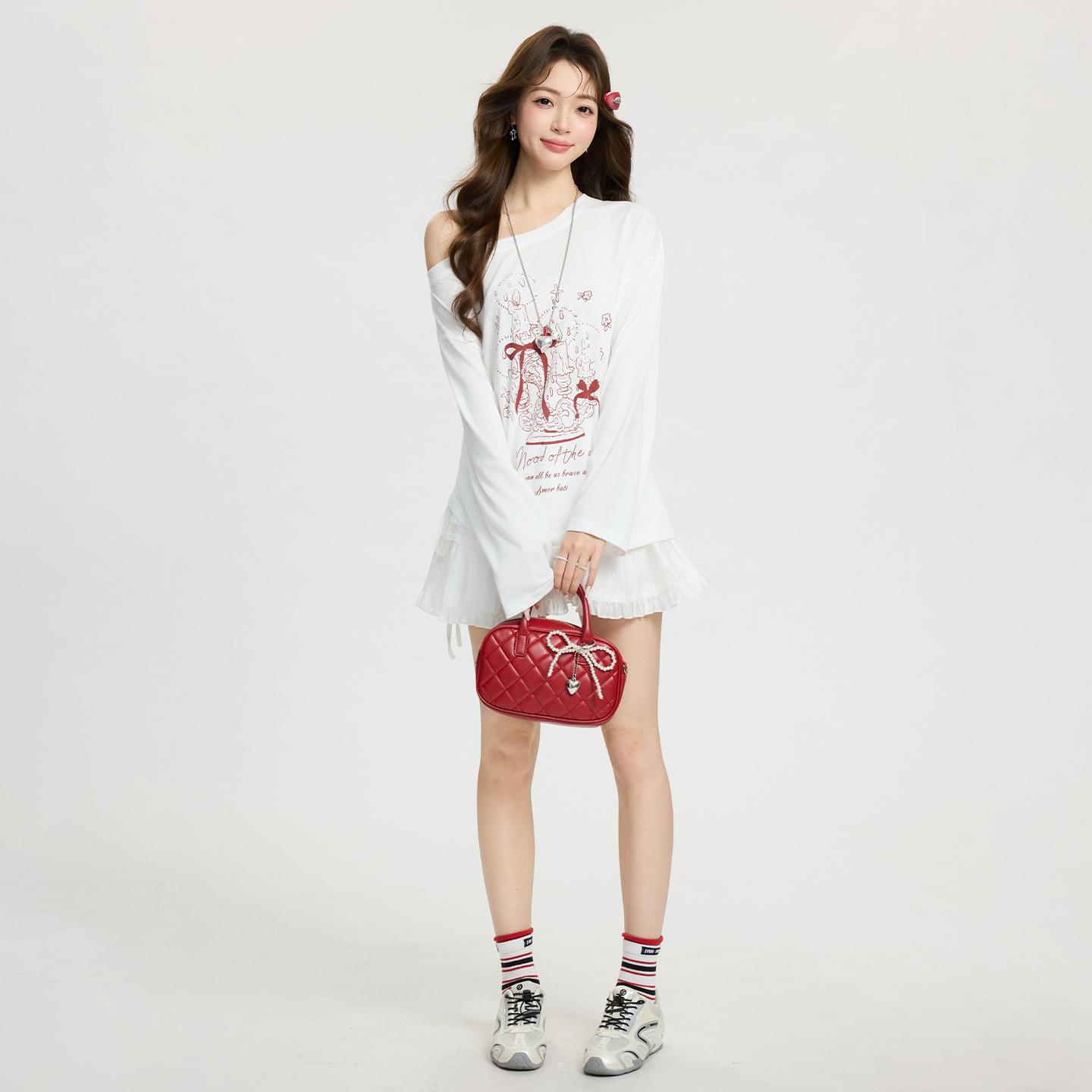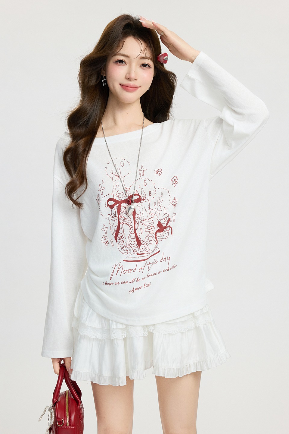 MY17737# 白色卡通印花斜肩长袖T恤宽松慵懒感气质上衣女裝貨源服裝批發