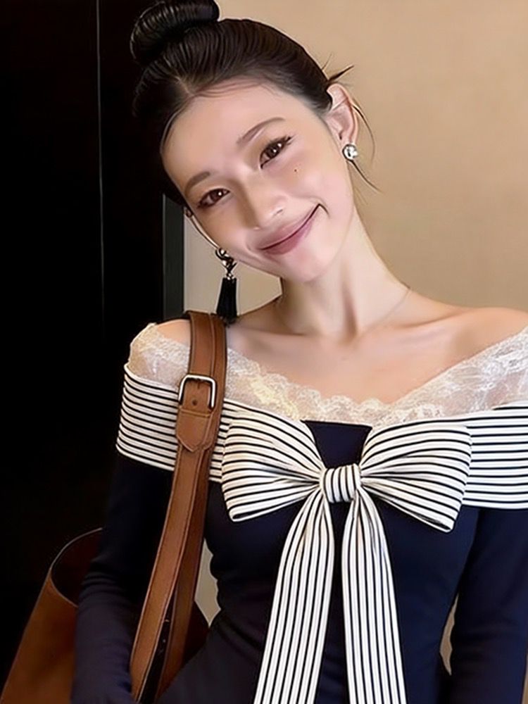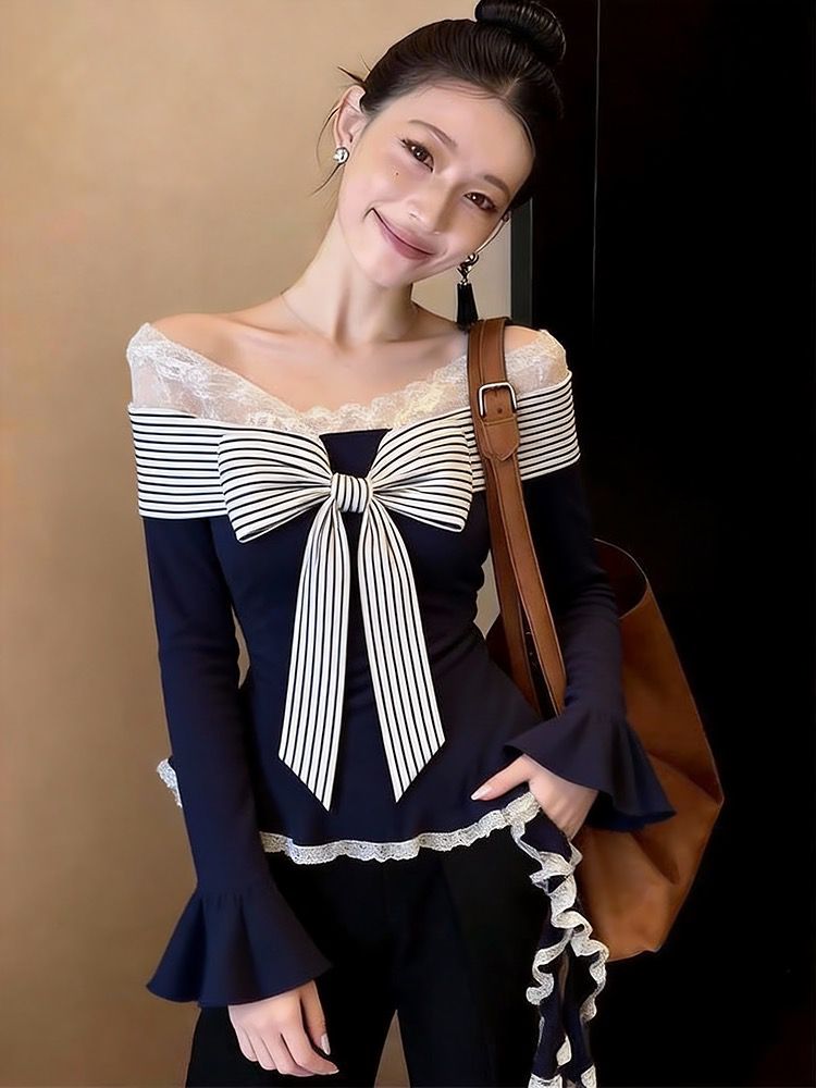 MY17742# 独特条纹绑带不规则打底衫女蕾丝拼接收腰长袖上衣女裝貨源服裝批發