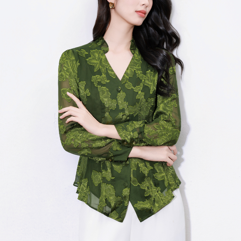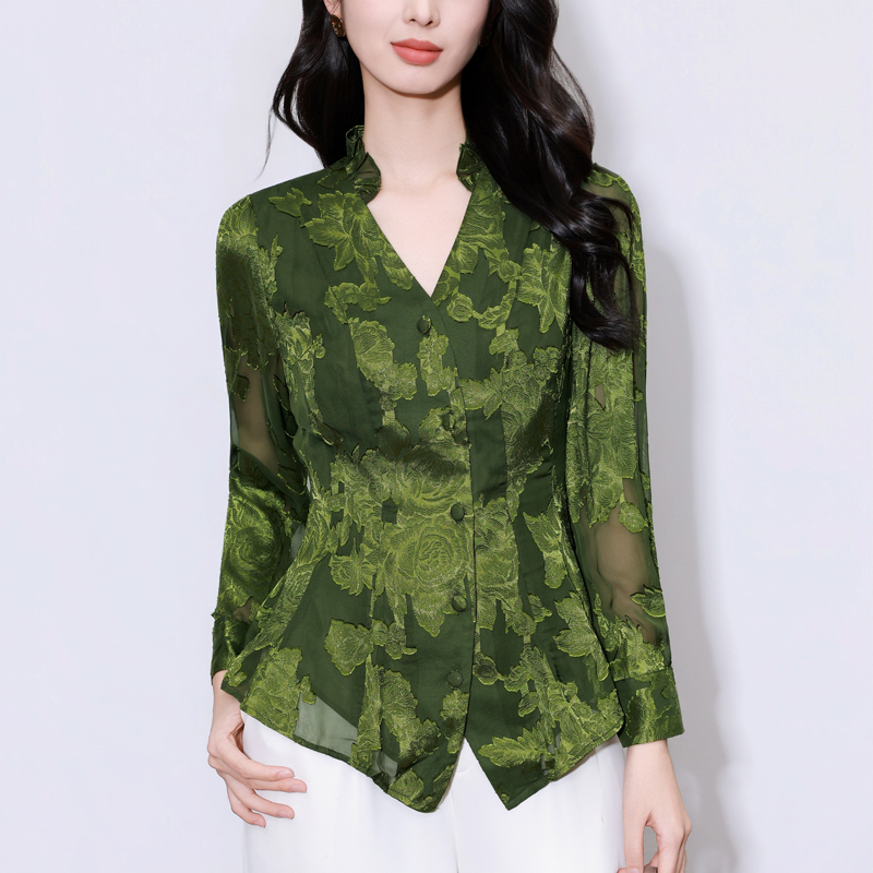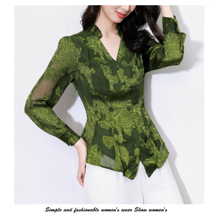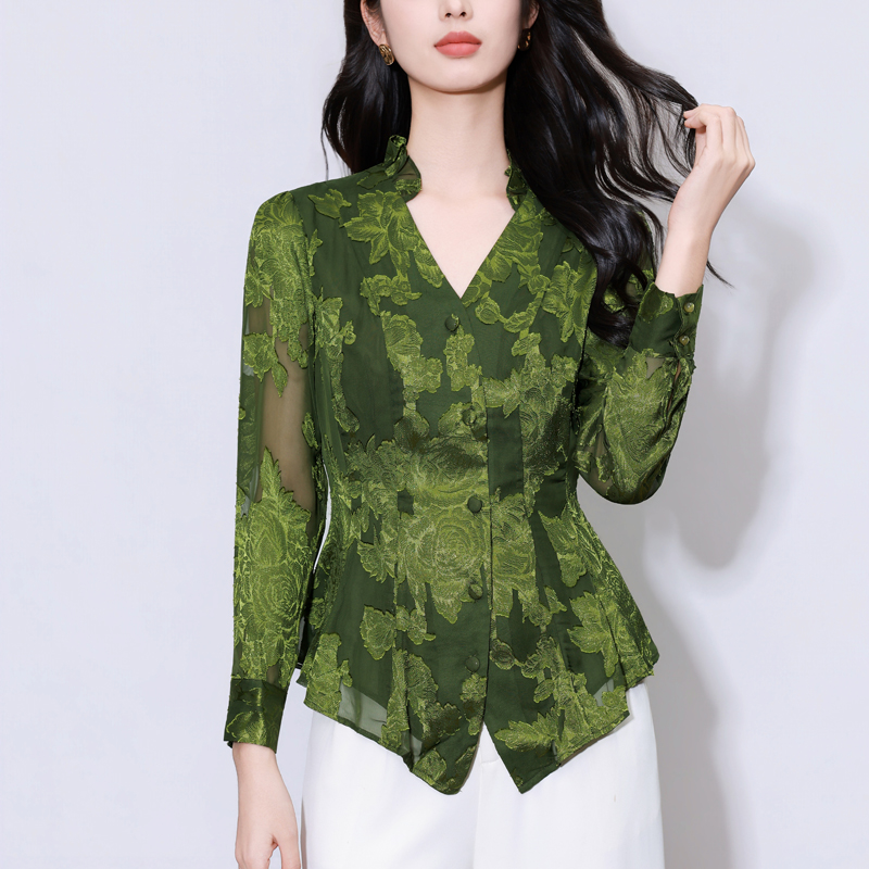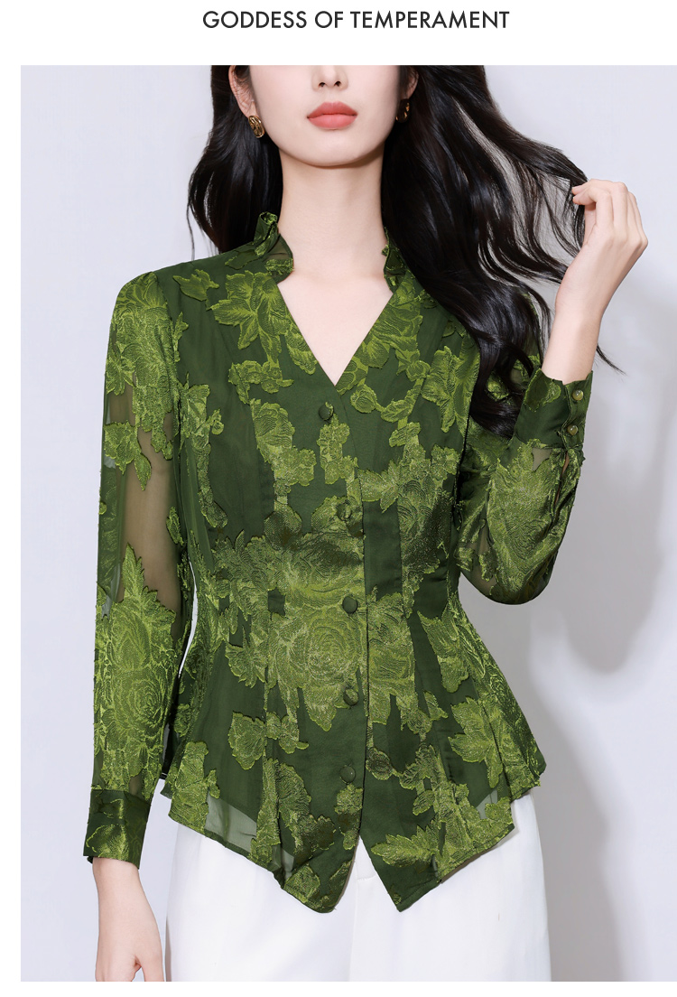 MY17757# 女长袖上衣气质v领显瘦衬衫设计感剪花修身衬衣气质女裝貨源服裝批發