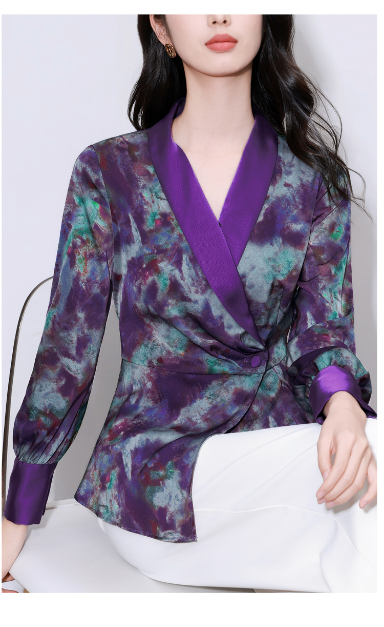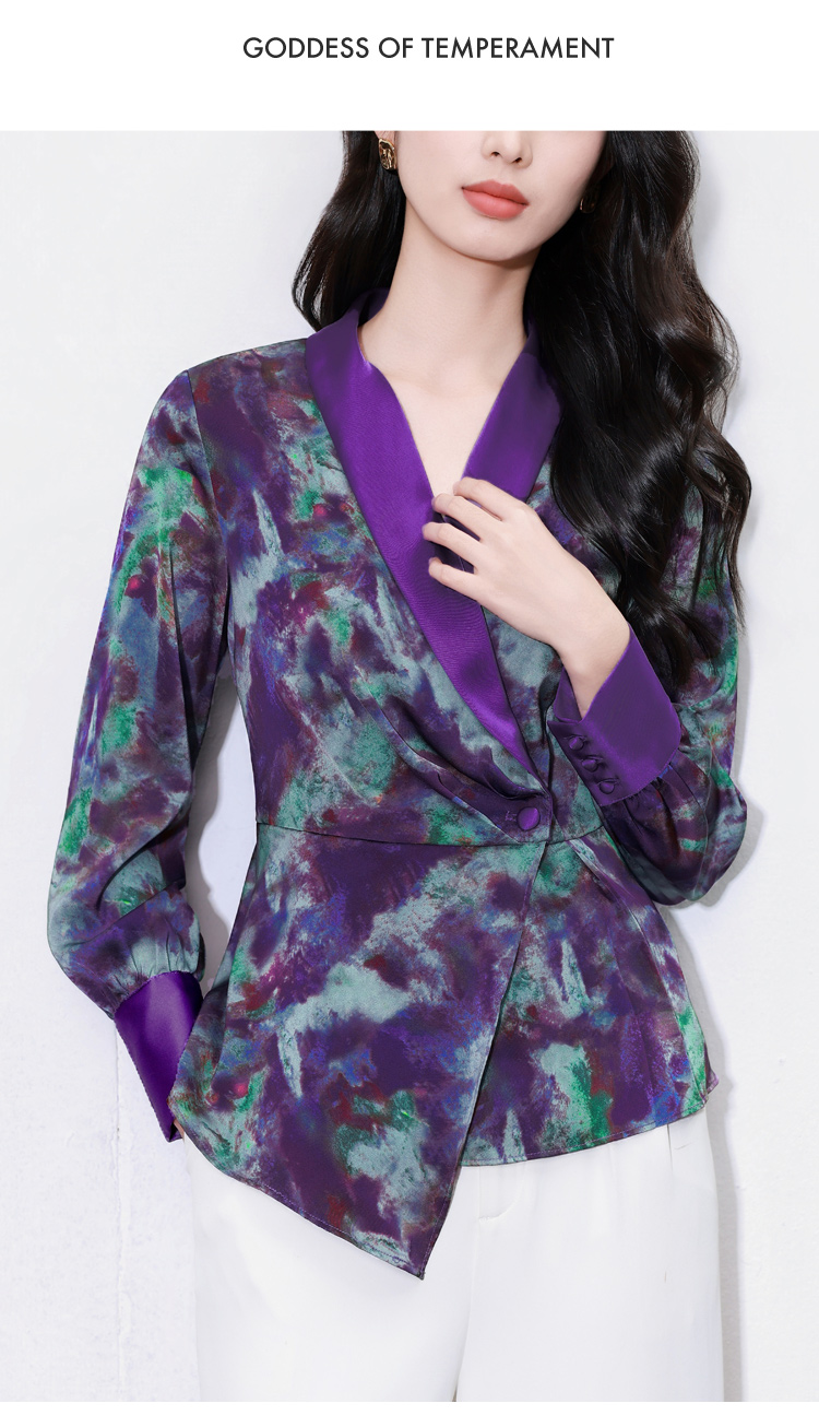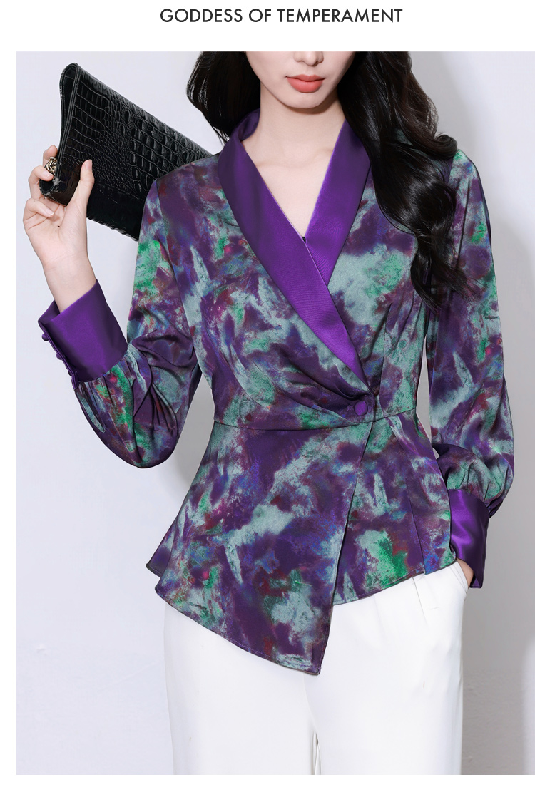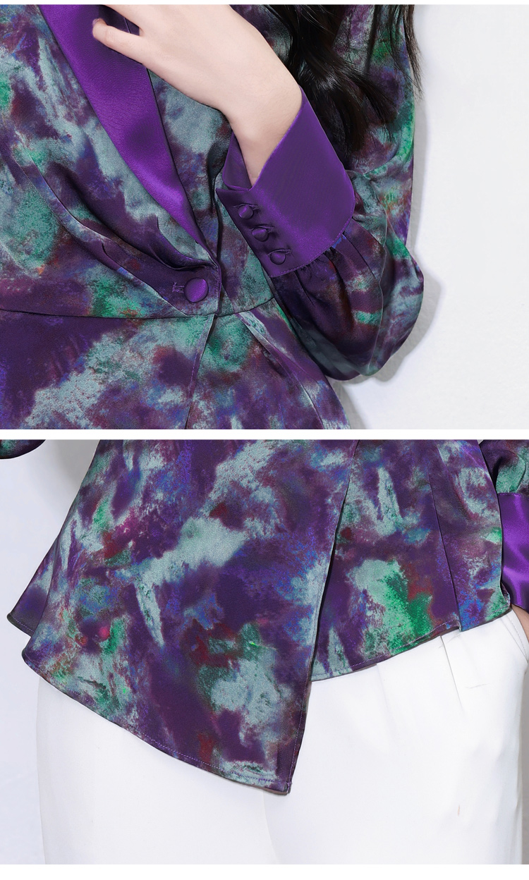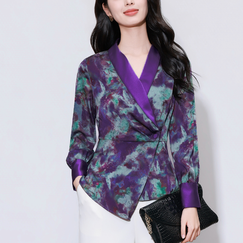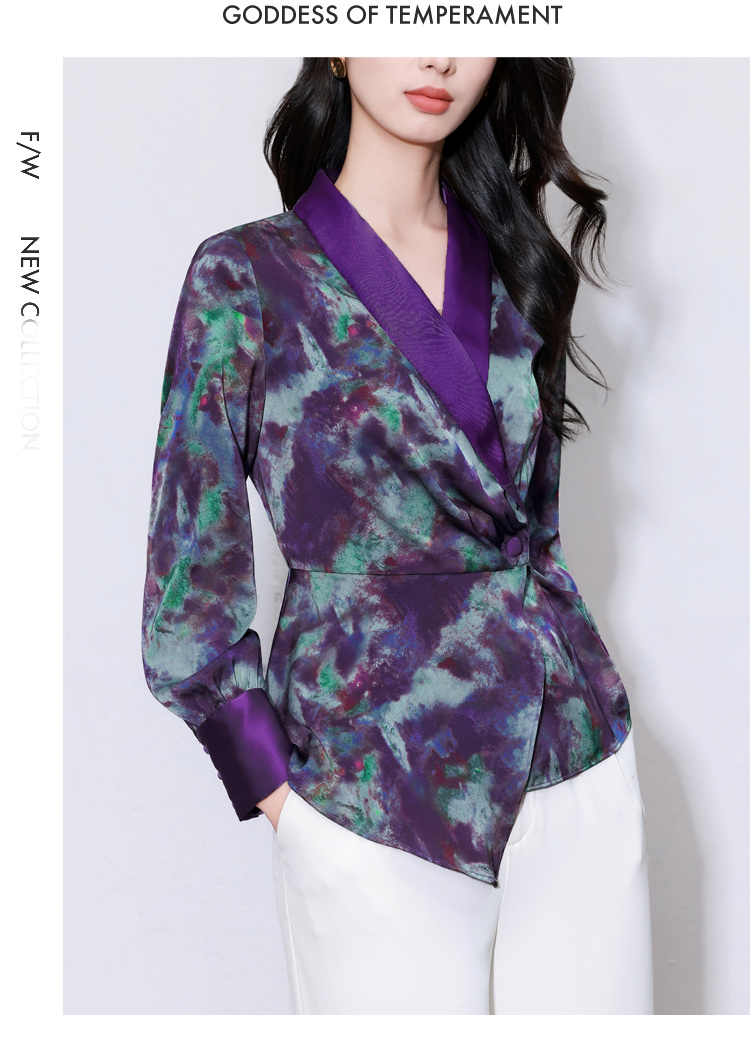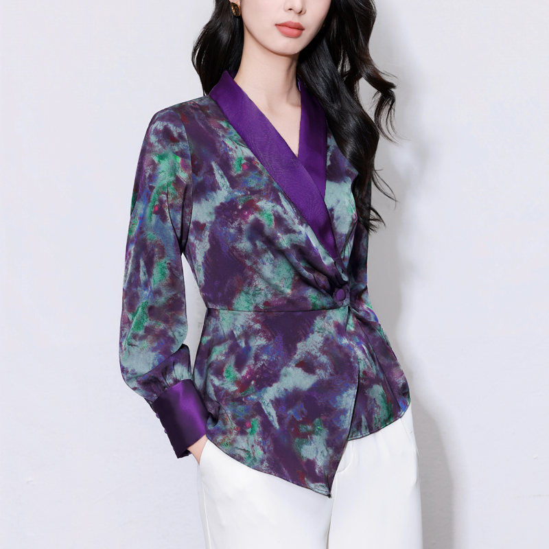 MY17758# 可定制轻奢缎面衬衫法式扎染印花西装领气质收腰女裝貨源服裝批發