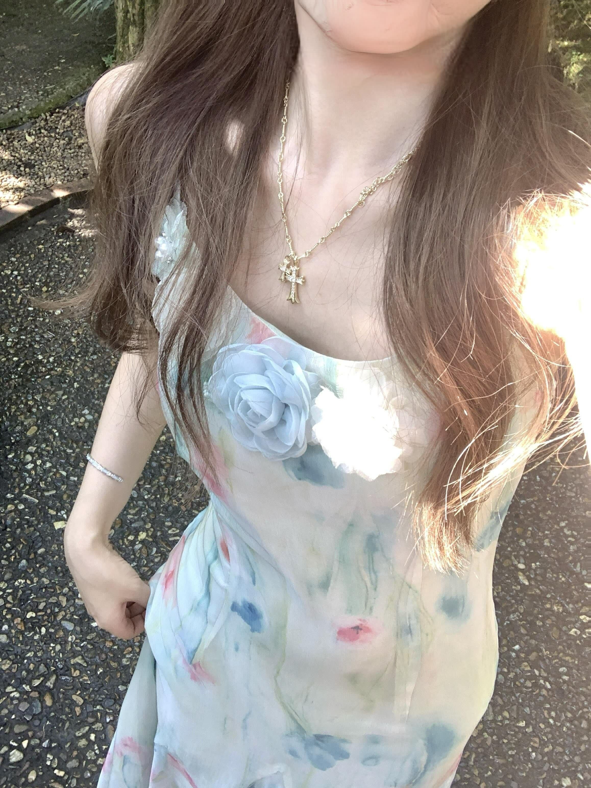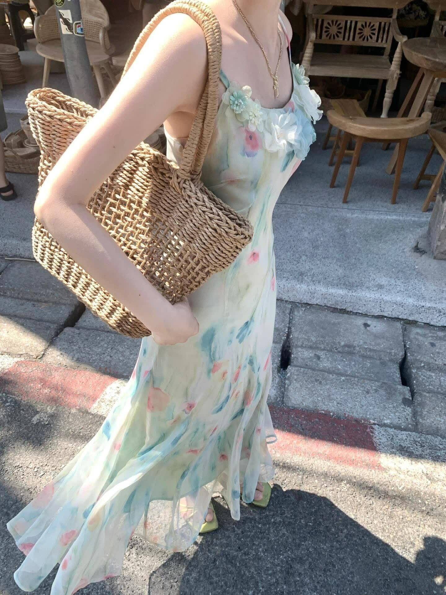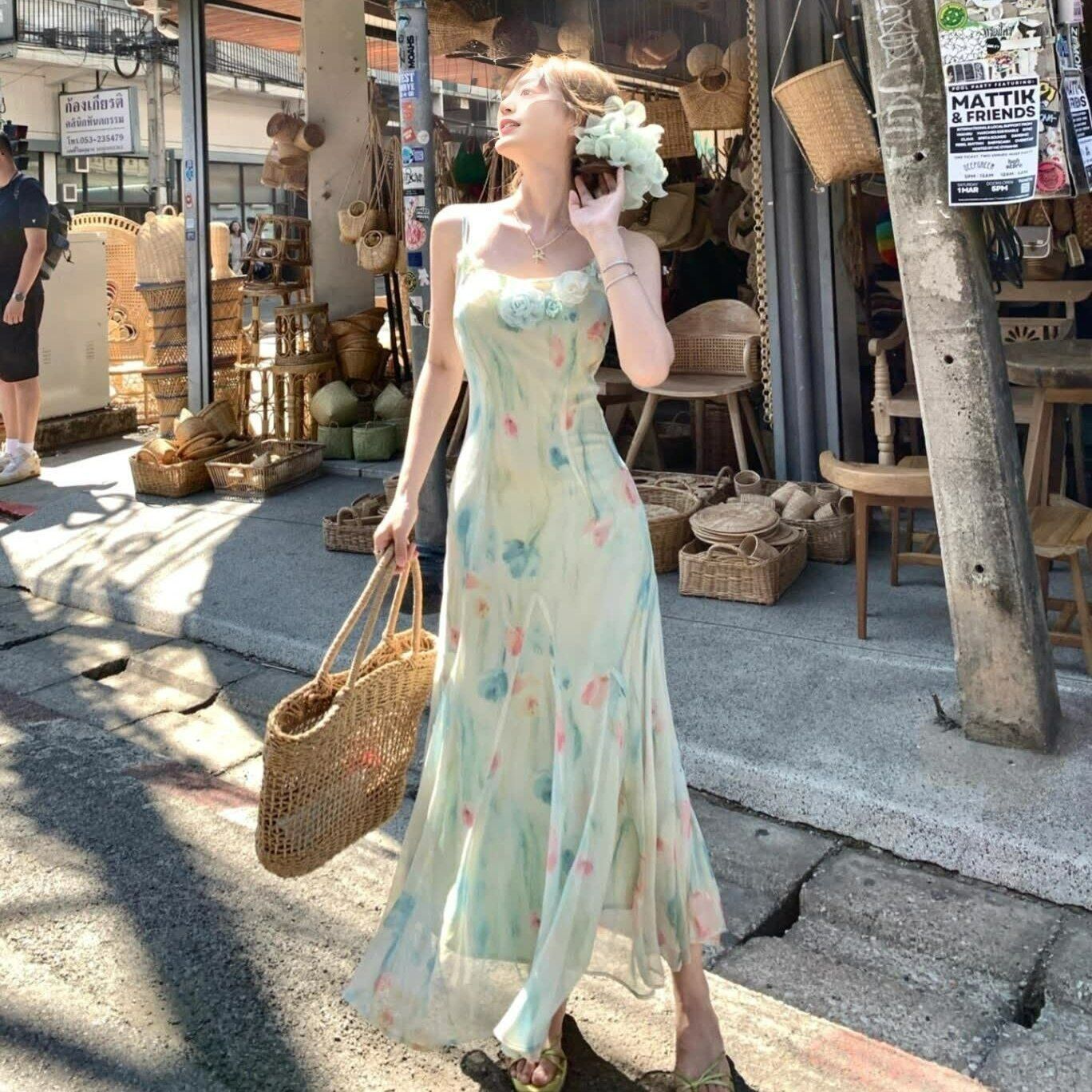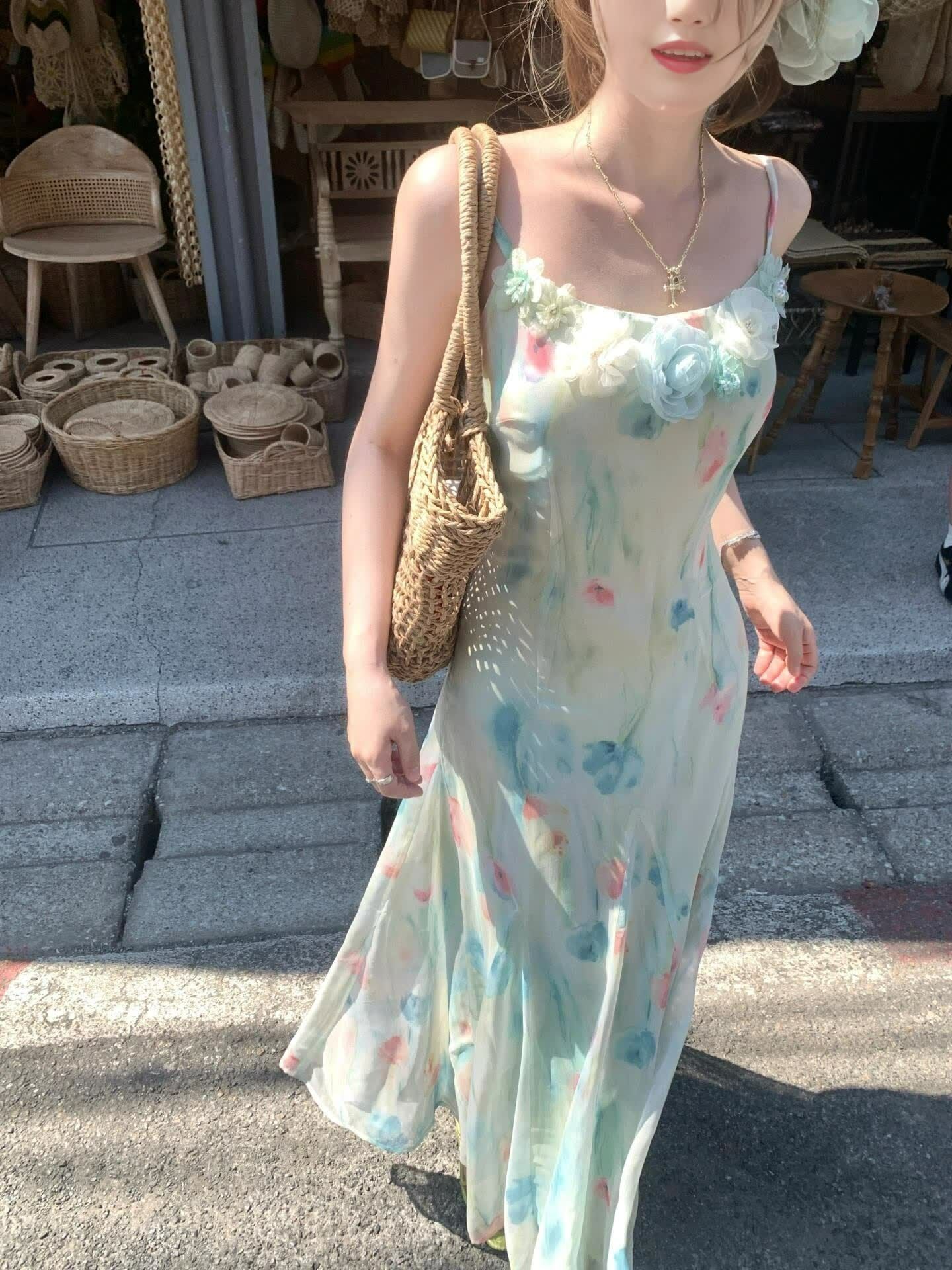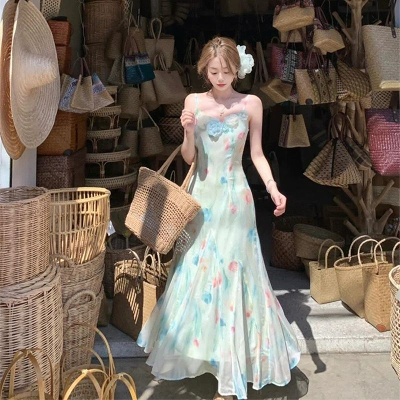 RY70051# 度假碎花吊带连衣裙女夏多巴胺大理洱海海边步步生莲鱼尾
