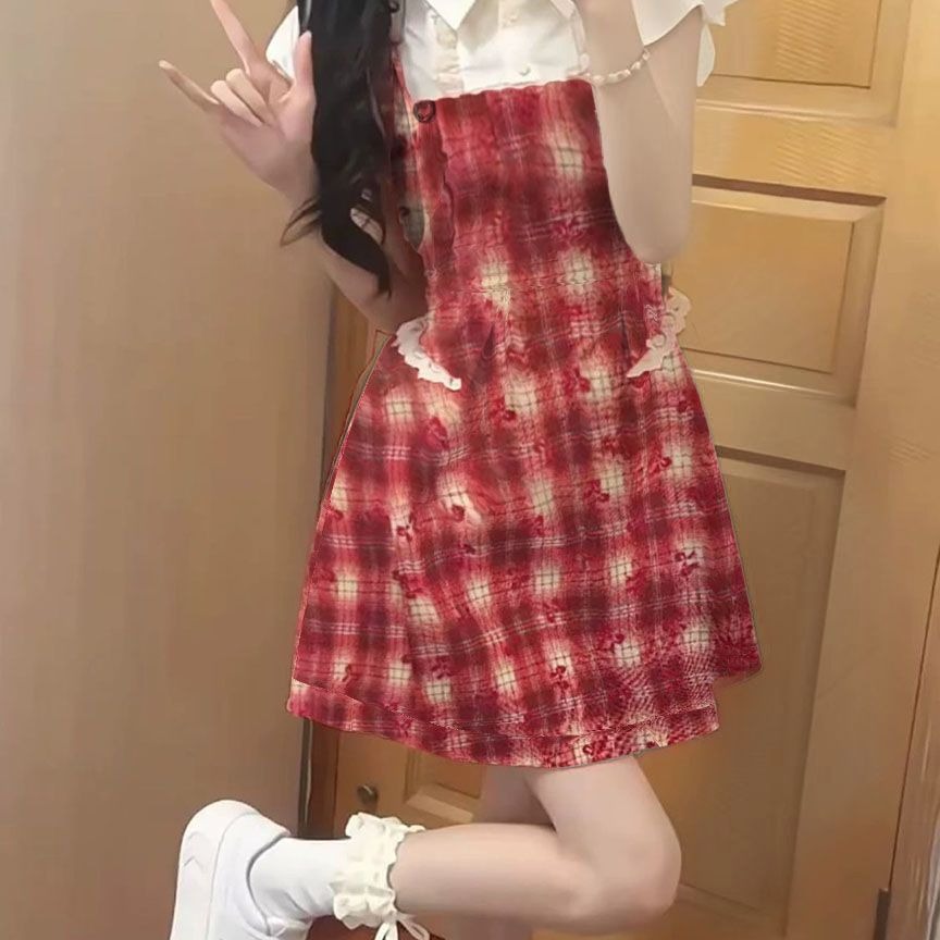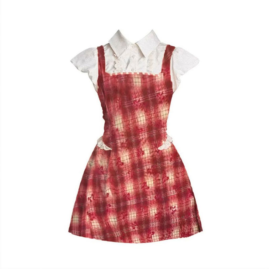 RY70052# 假两件格子连衣裙子女夏季2025新款小个子学院风收腰短裙