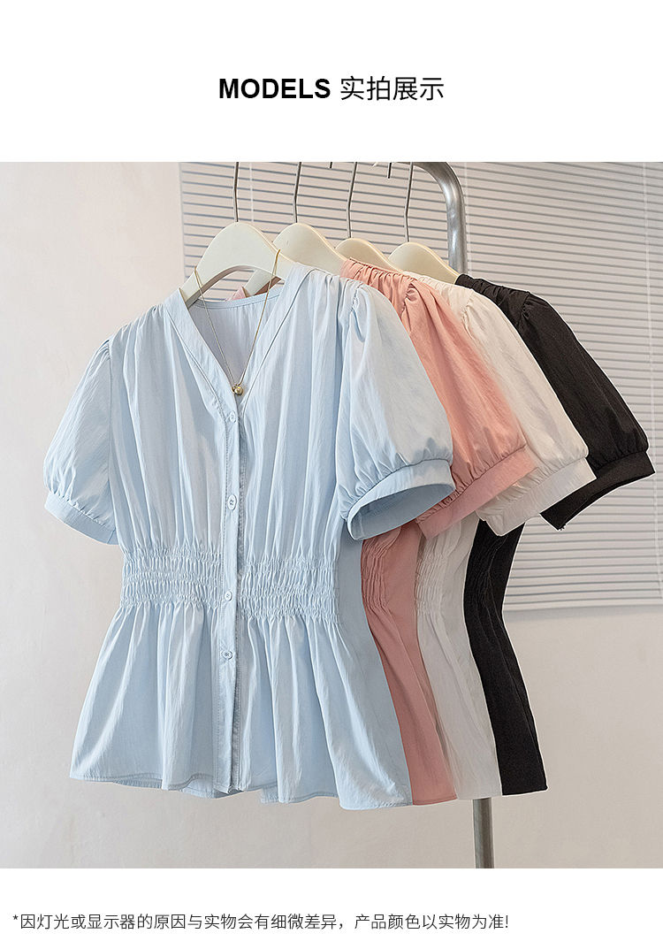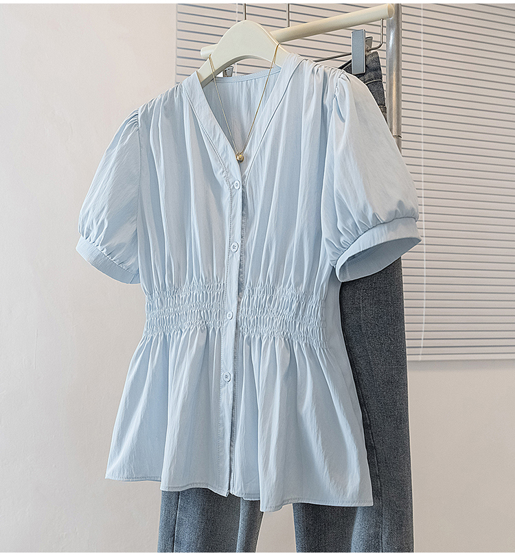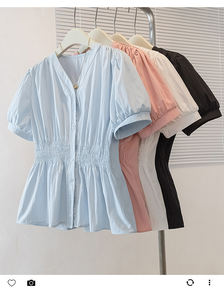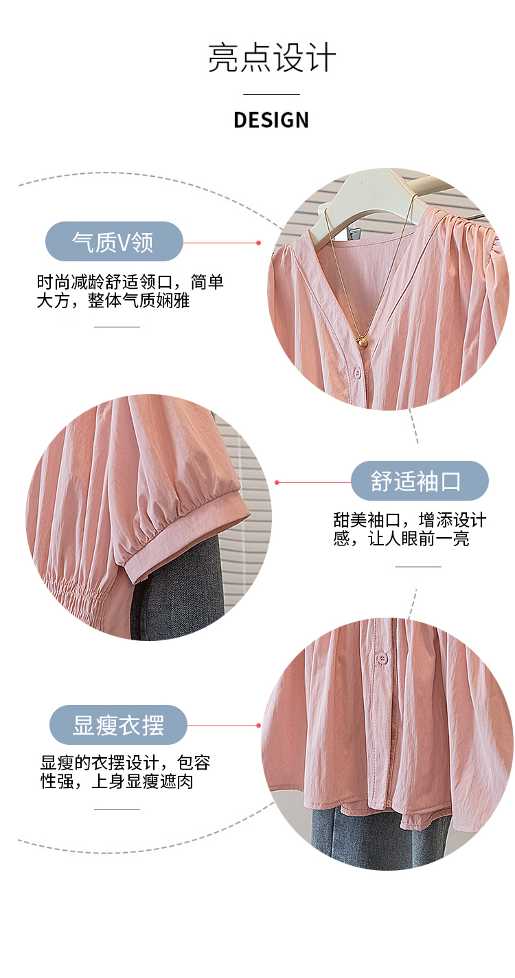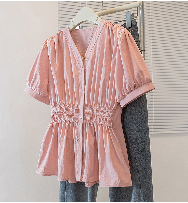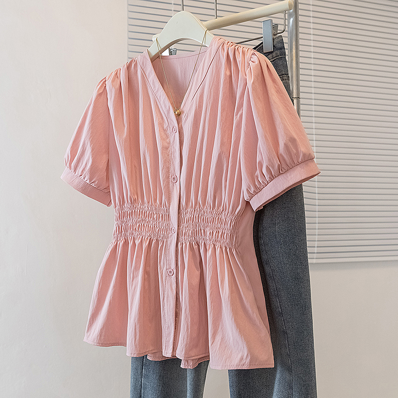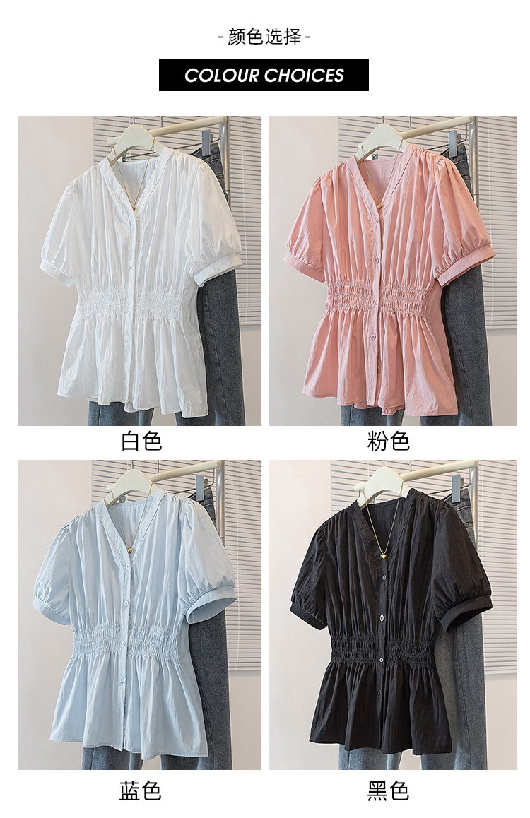 RY70096# 实拍大码女装韩版流行V领洋气衬衫胖妹妹宽松收腰遮肉百搭上衣夏