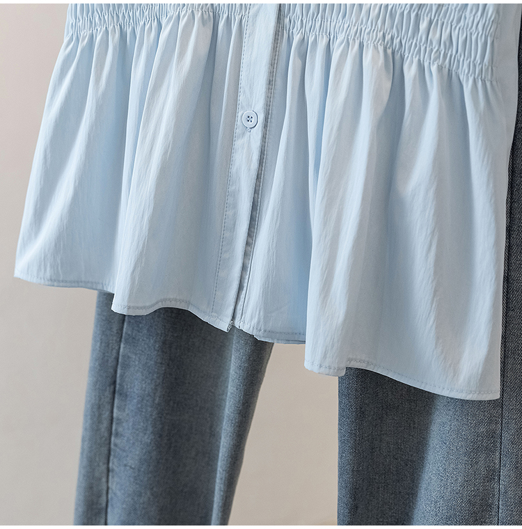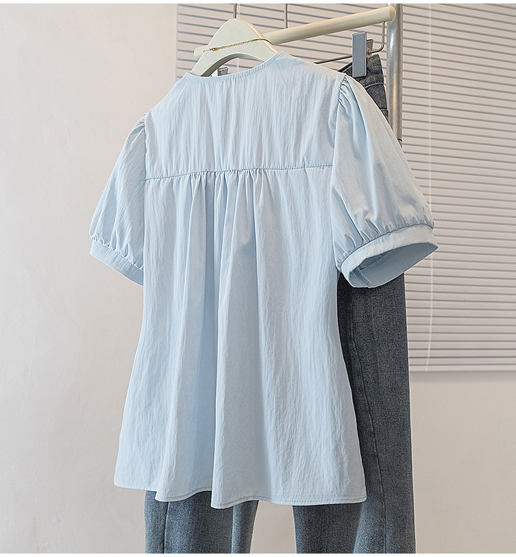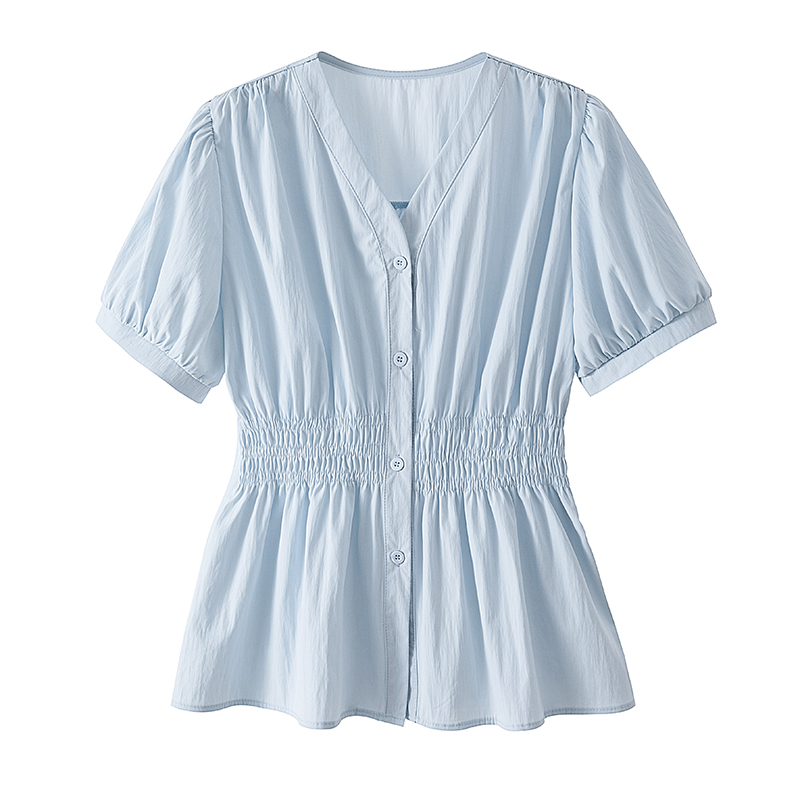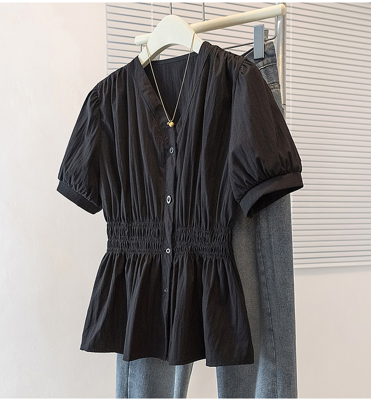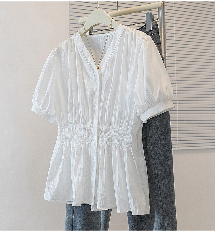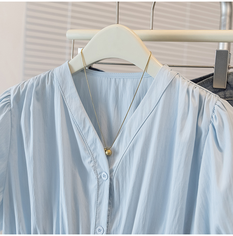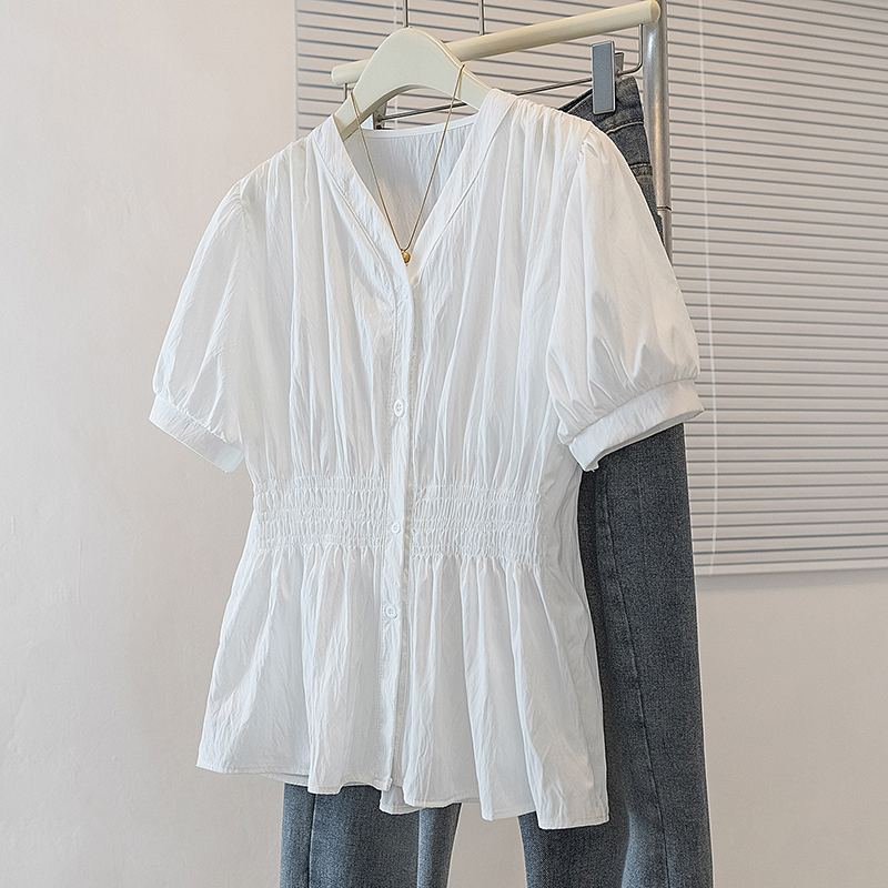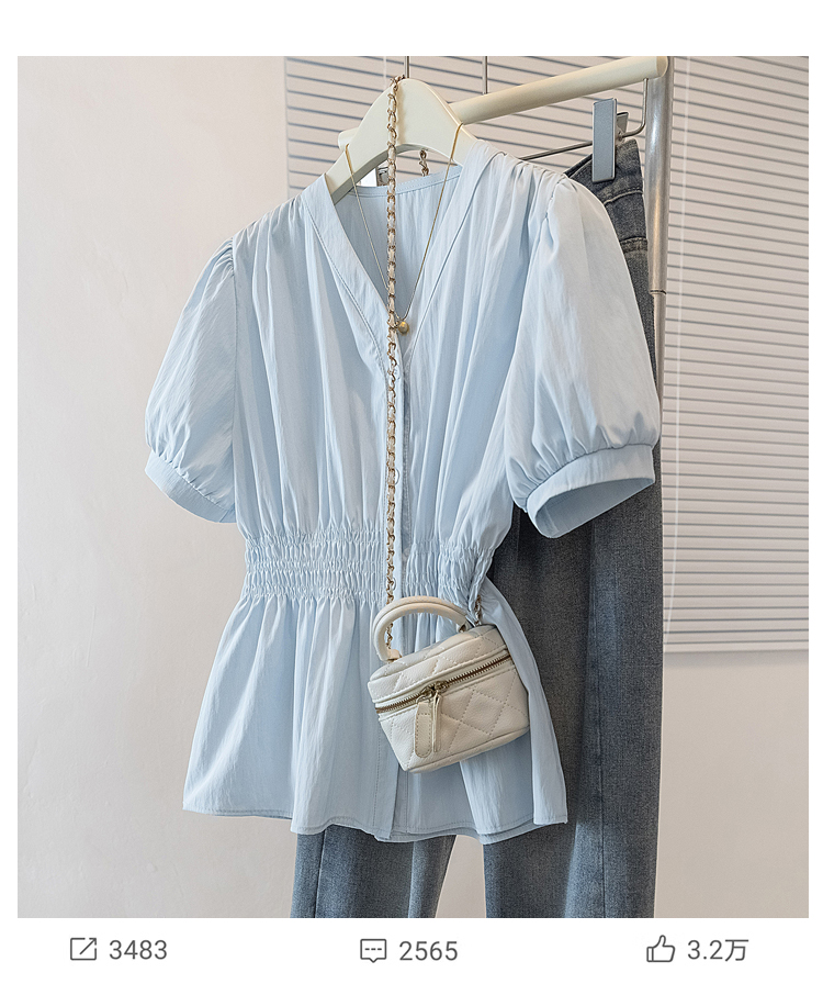 RY70096# 实拍大码女装韩版流行V领洋气衬衫胖妹妹宽松收腰遮肉百搭上衣夏