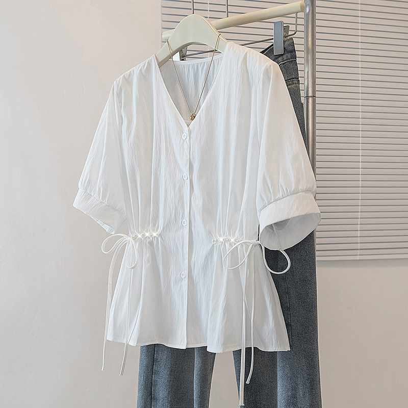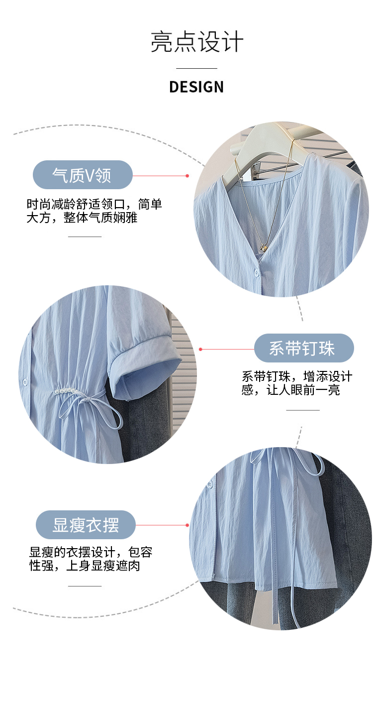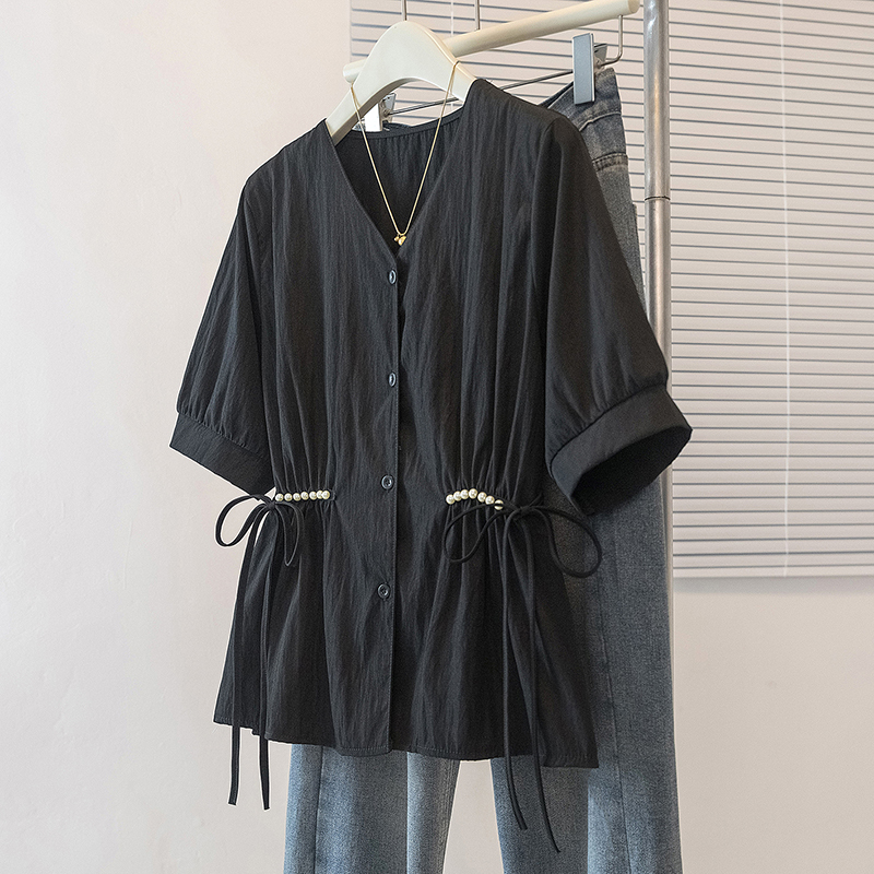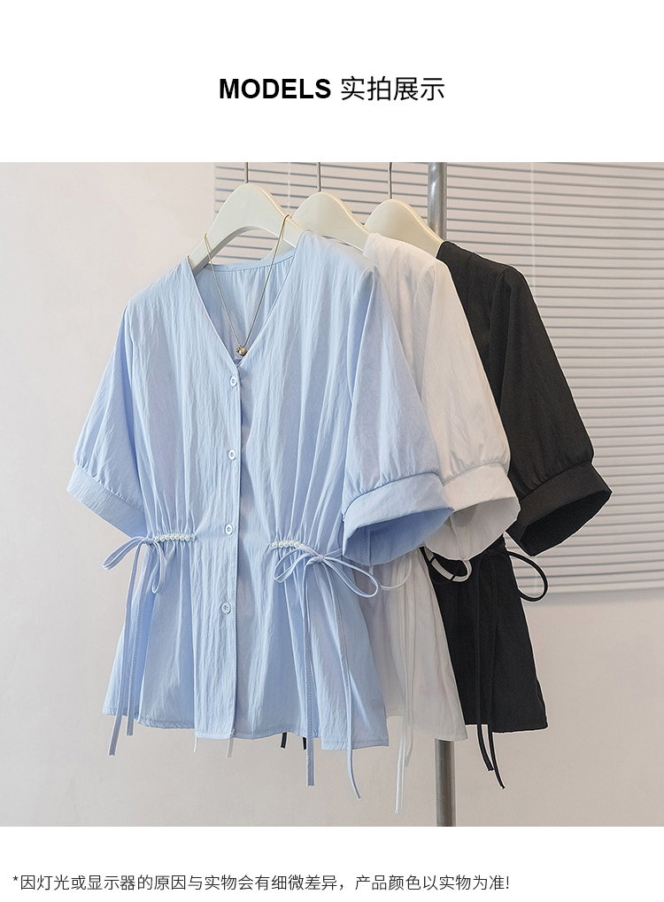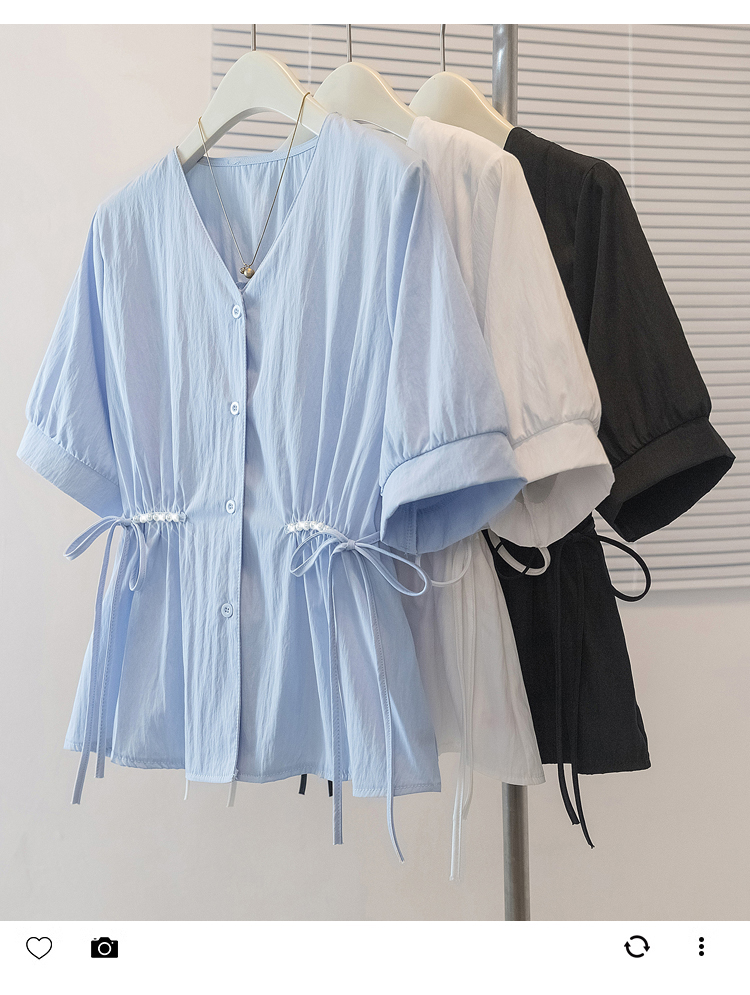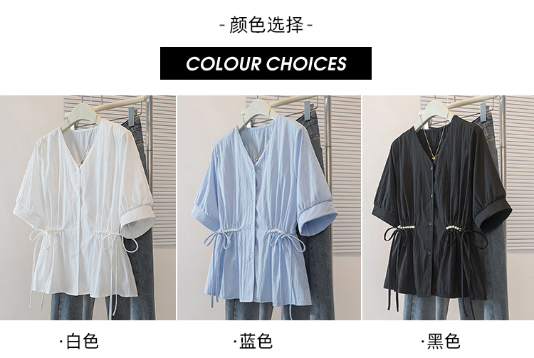 RY70098# 实拍大码女装韩版流行V领短袖衬衫胖妹妹收腰遮肉通勤时尚上衣夏