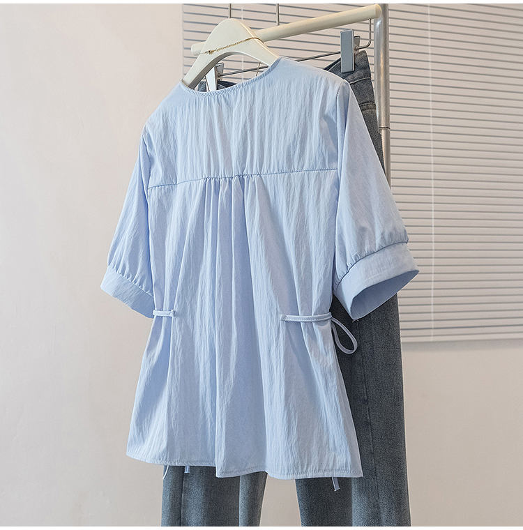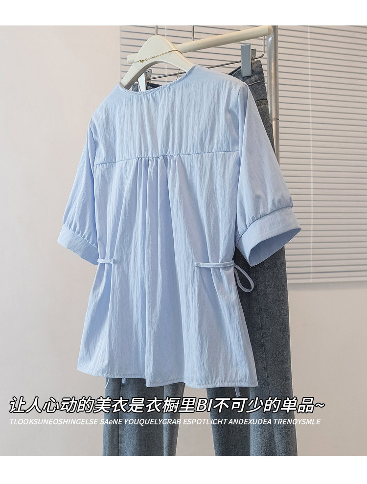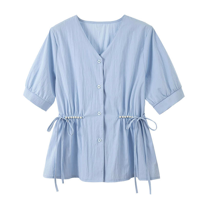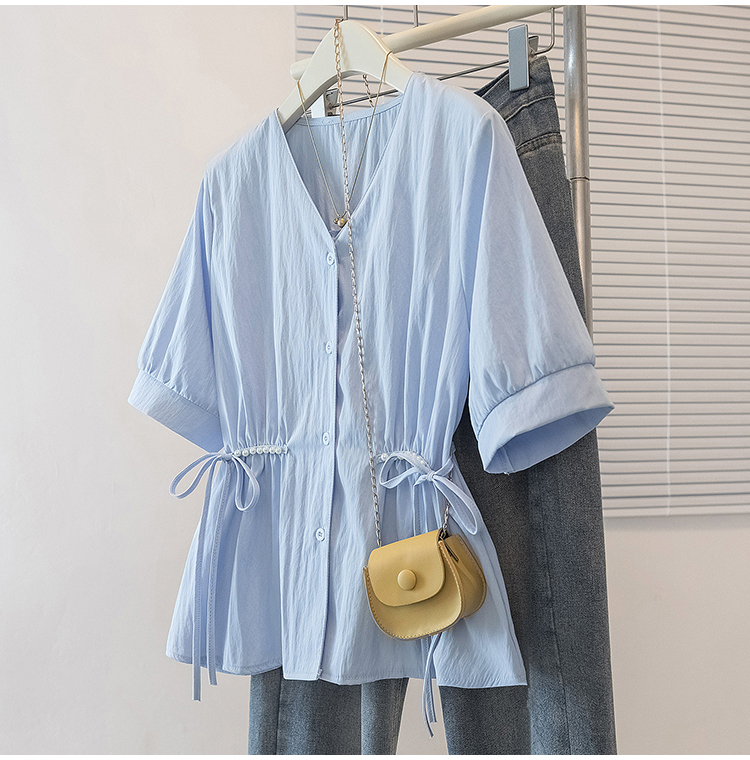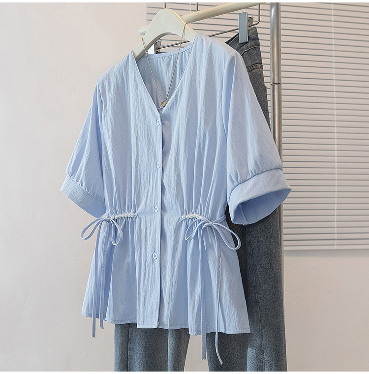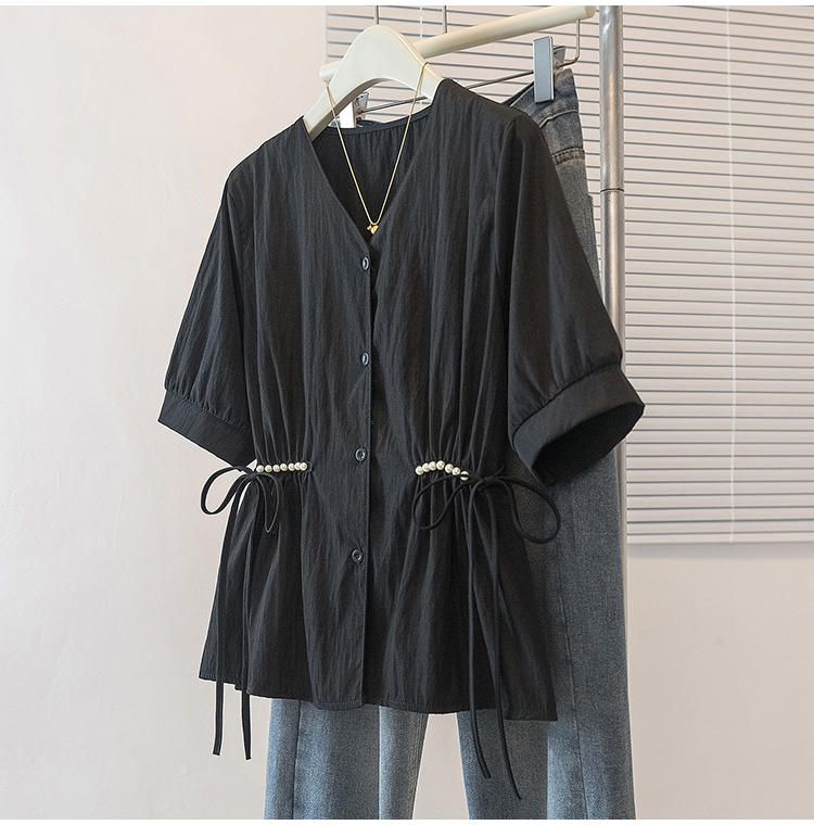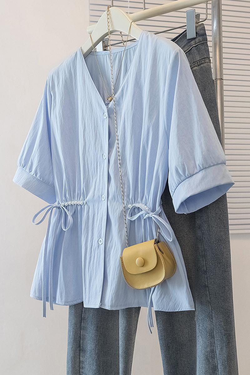 RY70098# 实拍大码女装韩版流行V领短袖衬衫胖妹妹收腰遮肉通勤时尚上衣夏