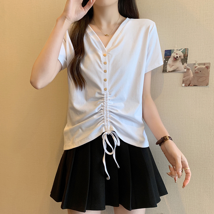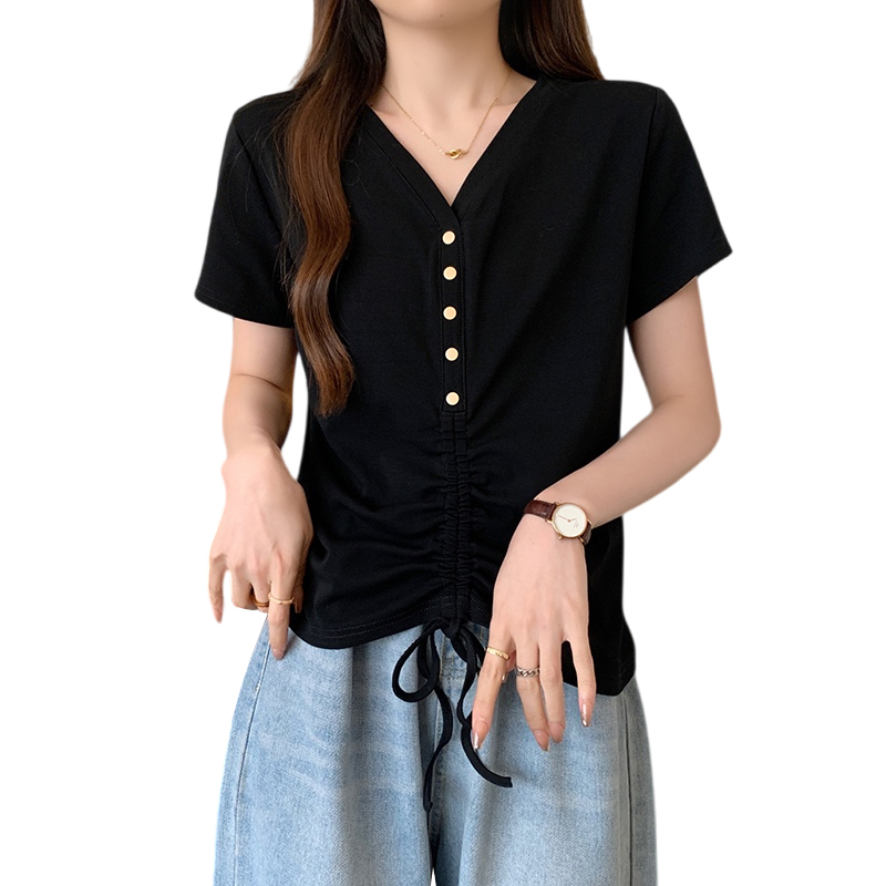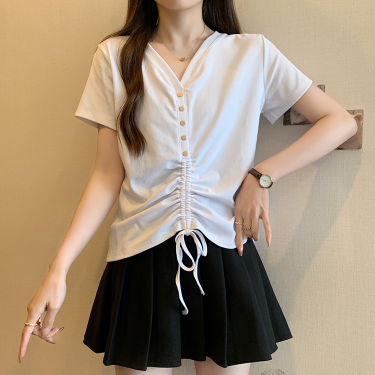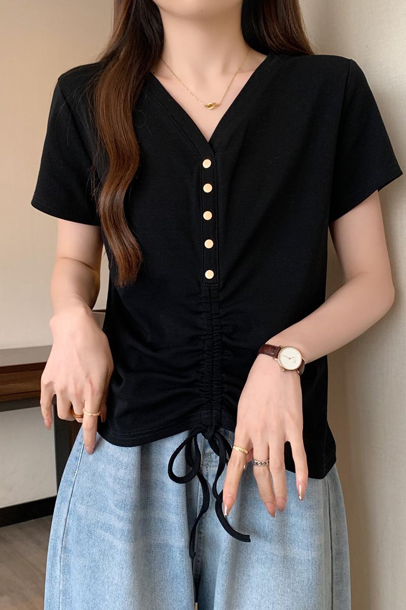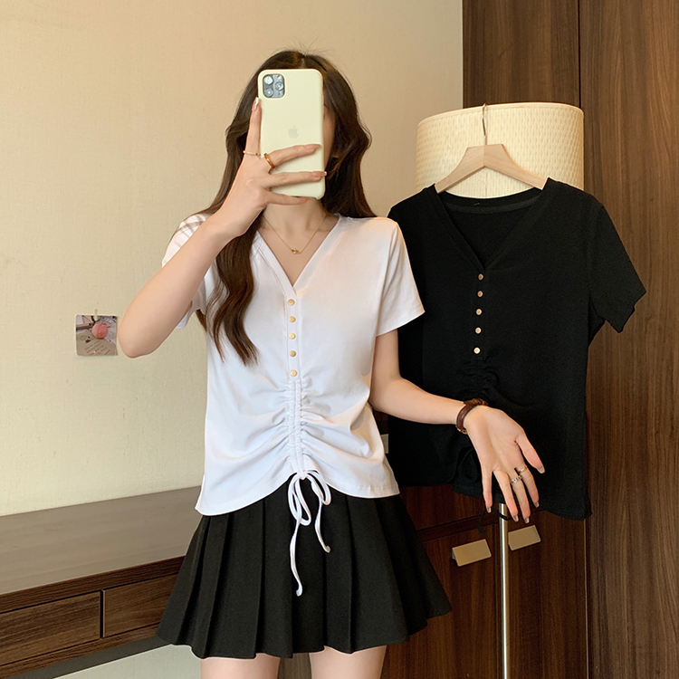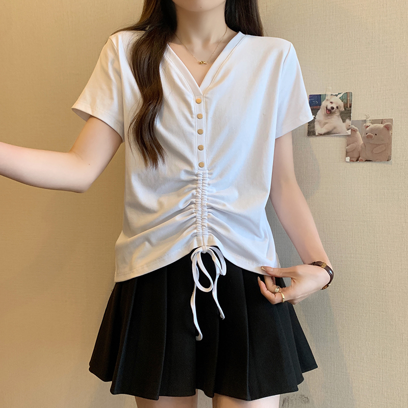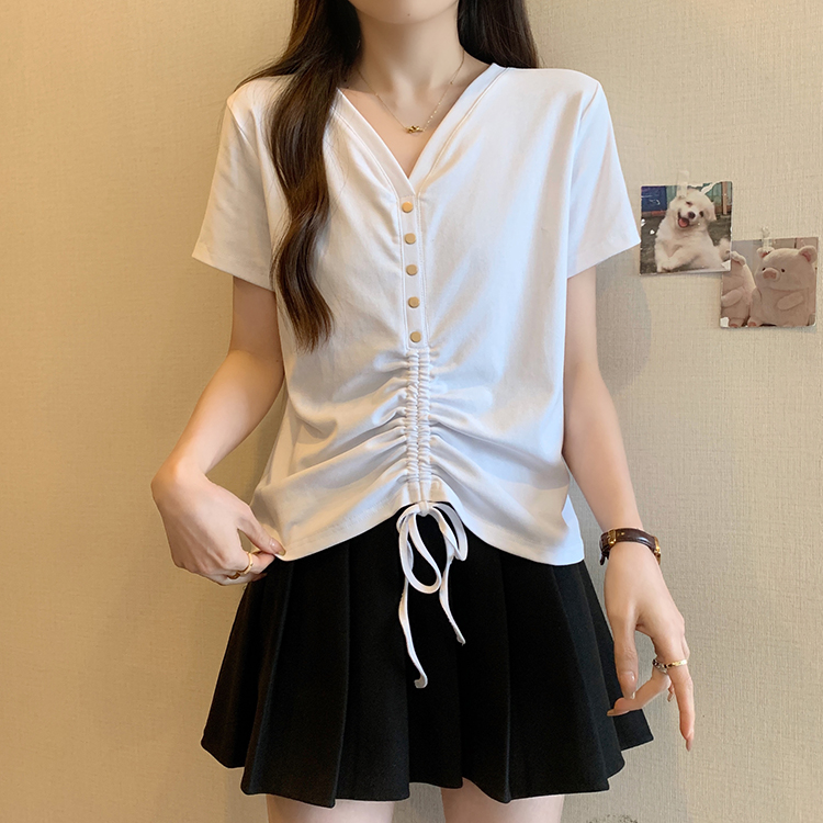 RY70111# 实拍大码不规则褶皱短袖t恤女夏胖MM宽松遮肉设计感小众辣妹上衣