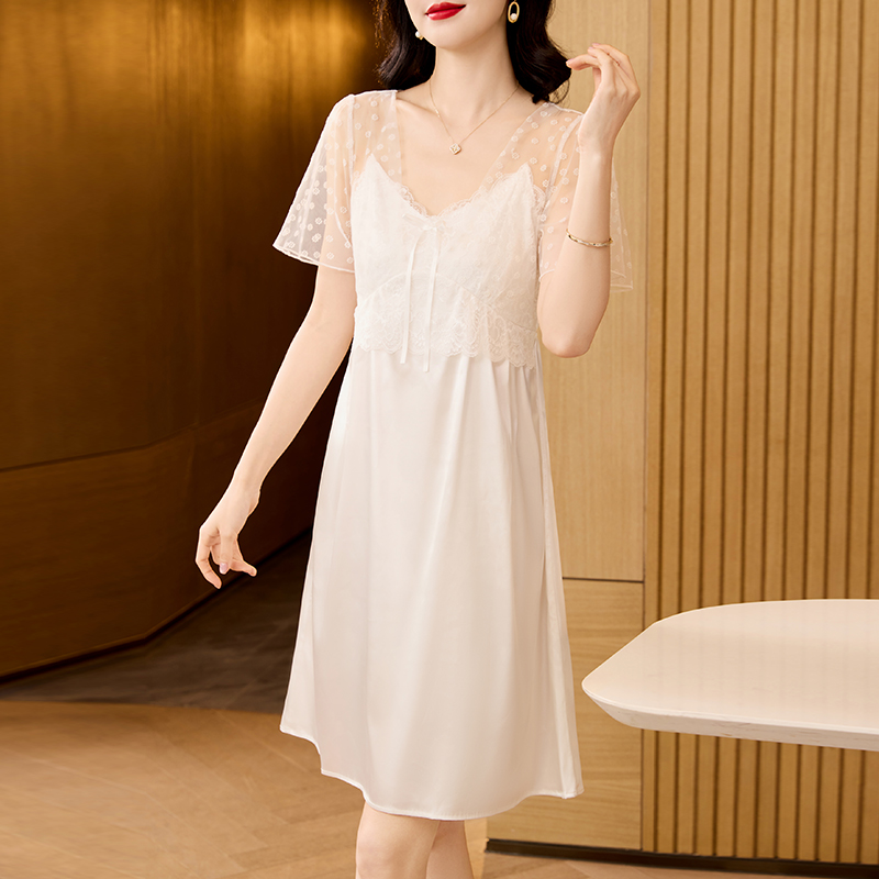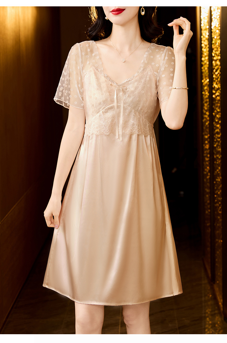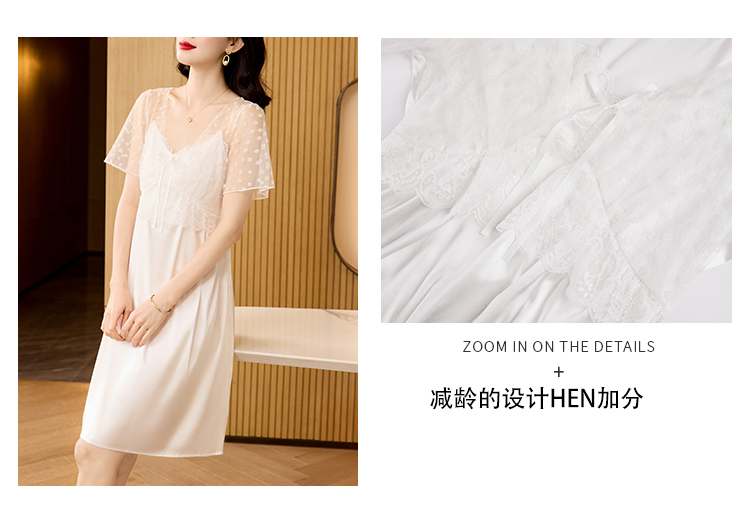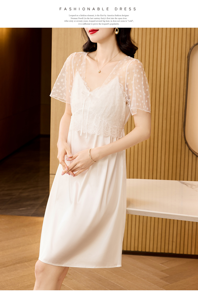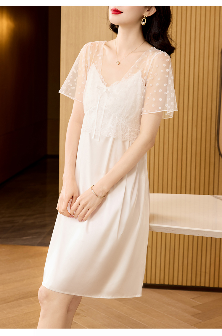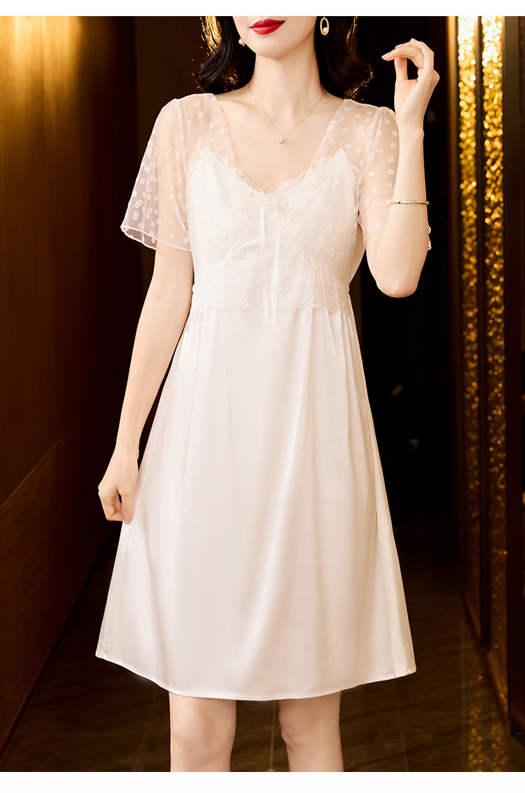 RY70112# 实拍2026新款夏甜美V领蕾丝刺绣网纱飞飞袖带胸垫短袖冰丝睡裙女