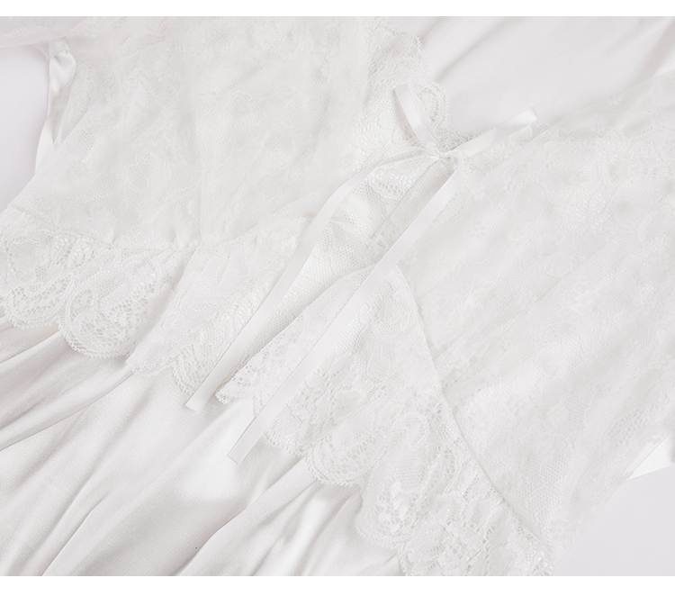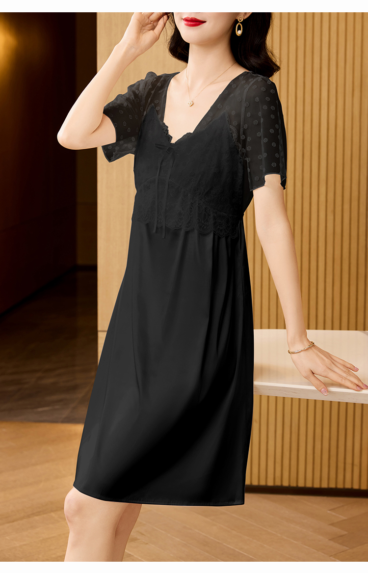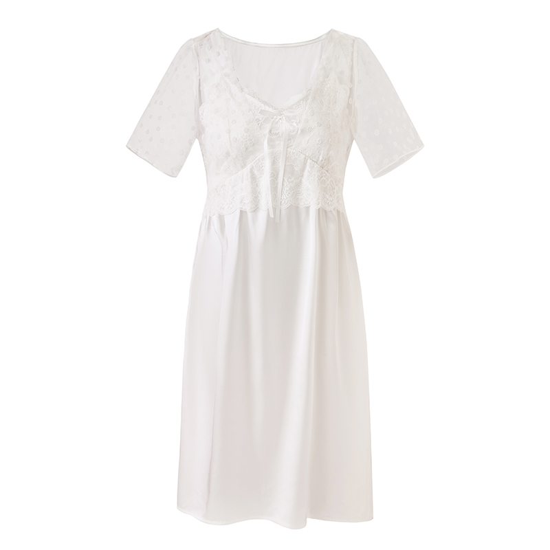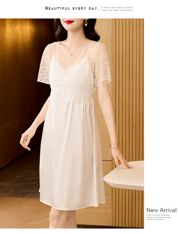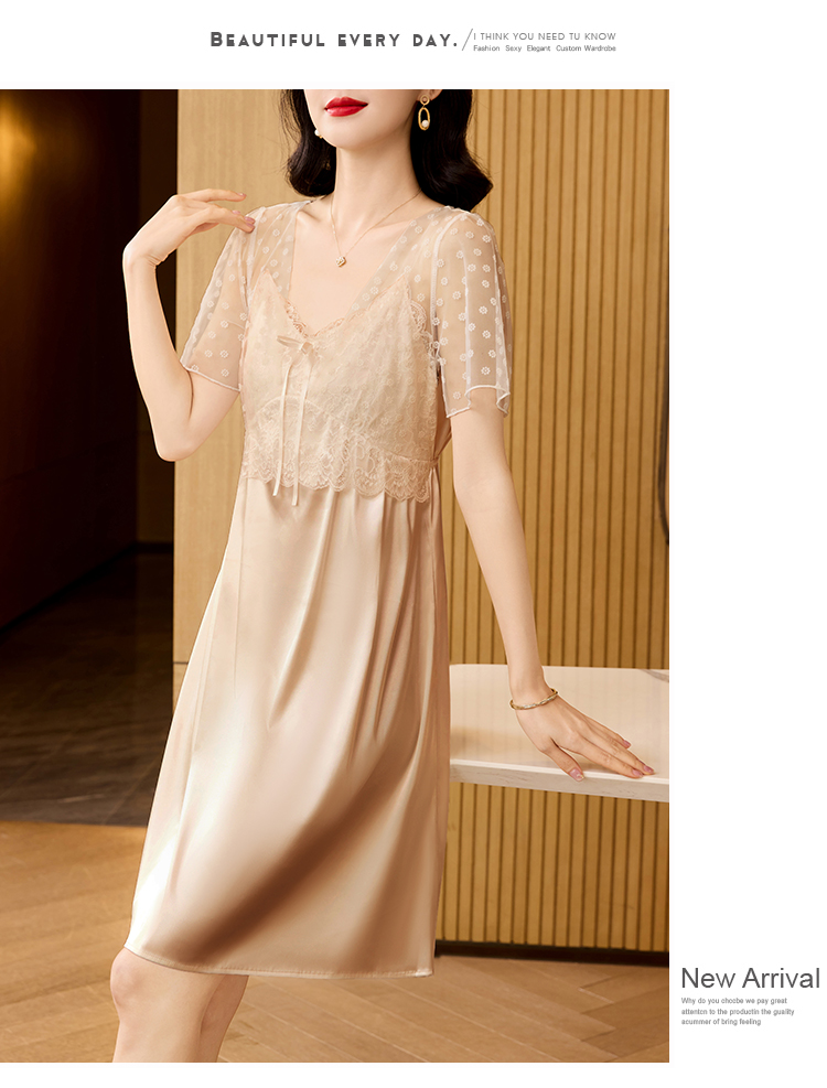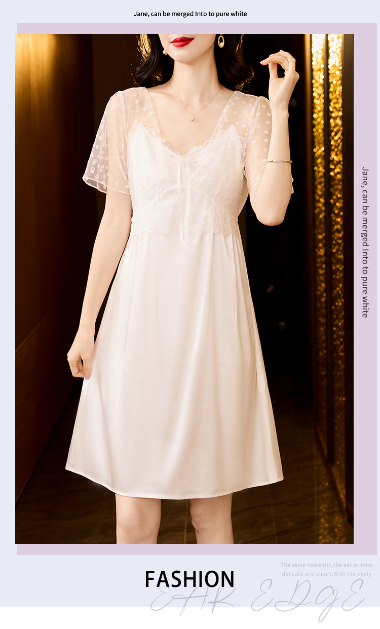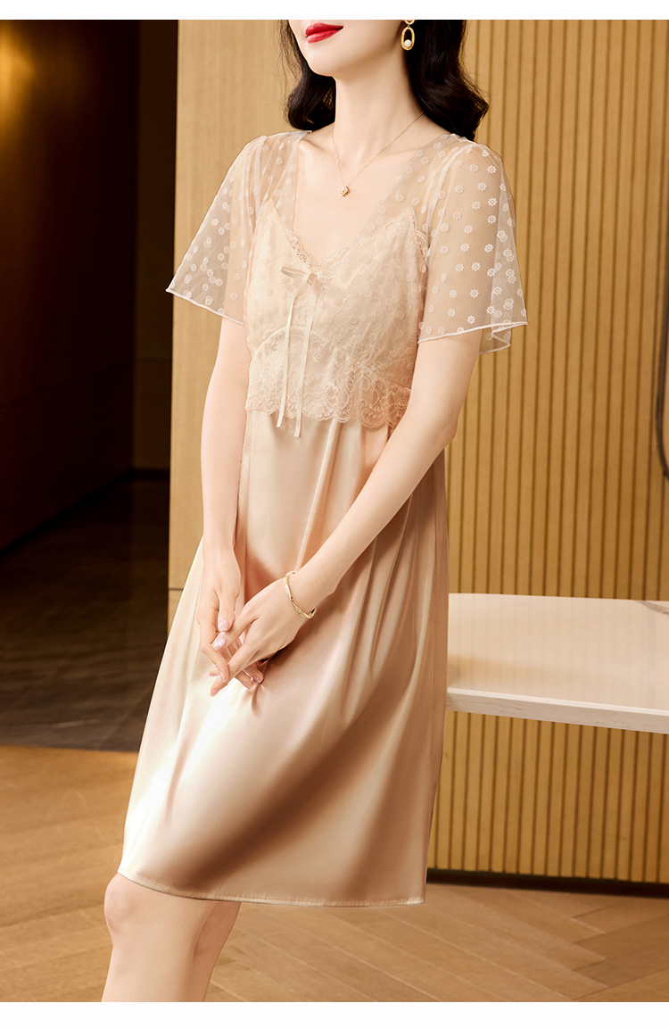 RY70112# 实拍2026新款夏甜美V领蕾丝刺绣网纱飞飞袖带胸垫短袖冰丝睡裙女