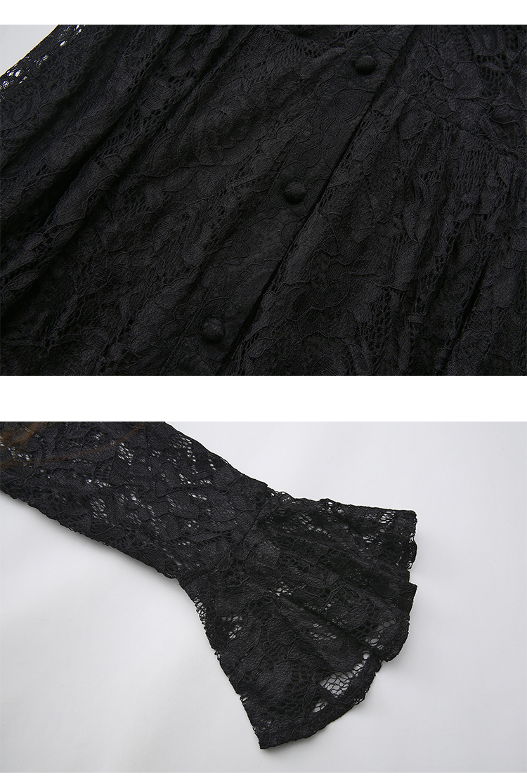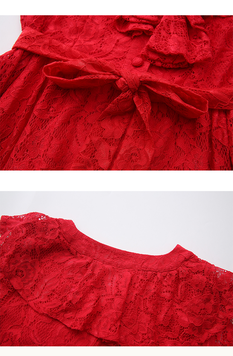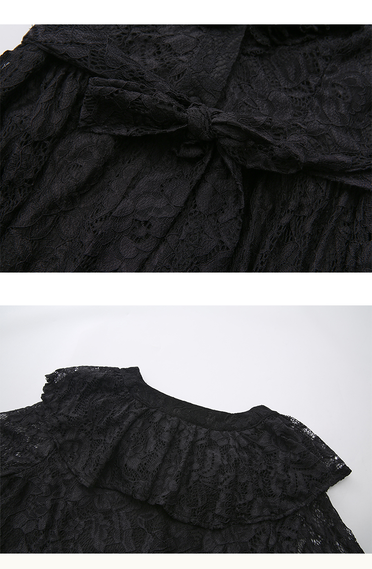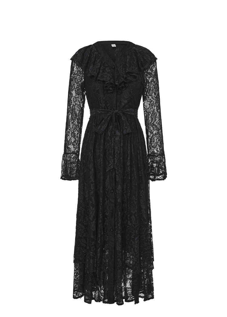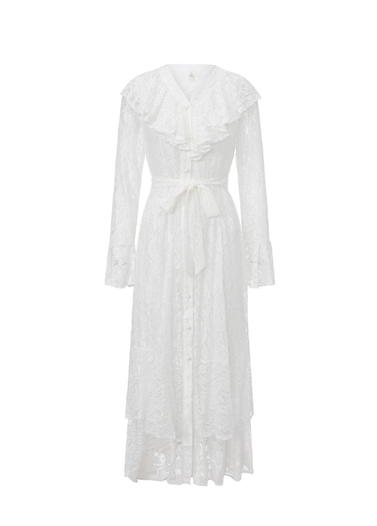 RY70120# 春新款复古蕾丝荷叶边喇叭袖长款连衣裙