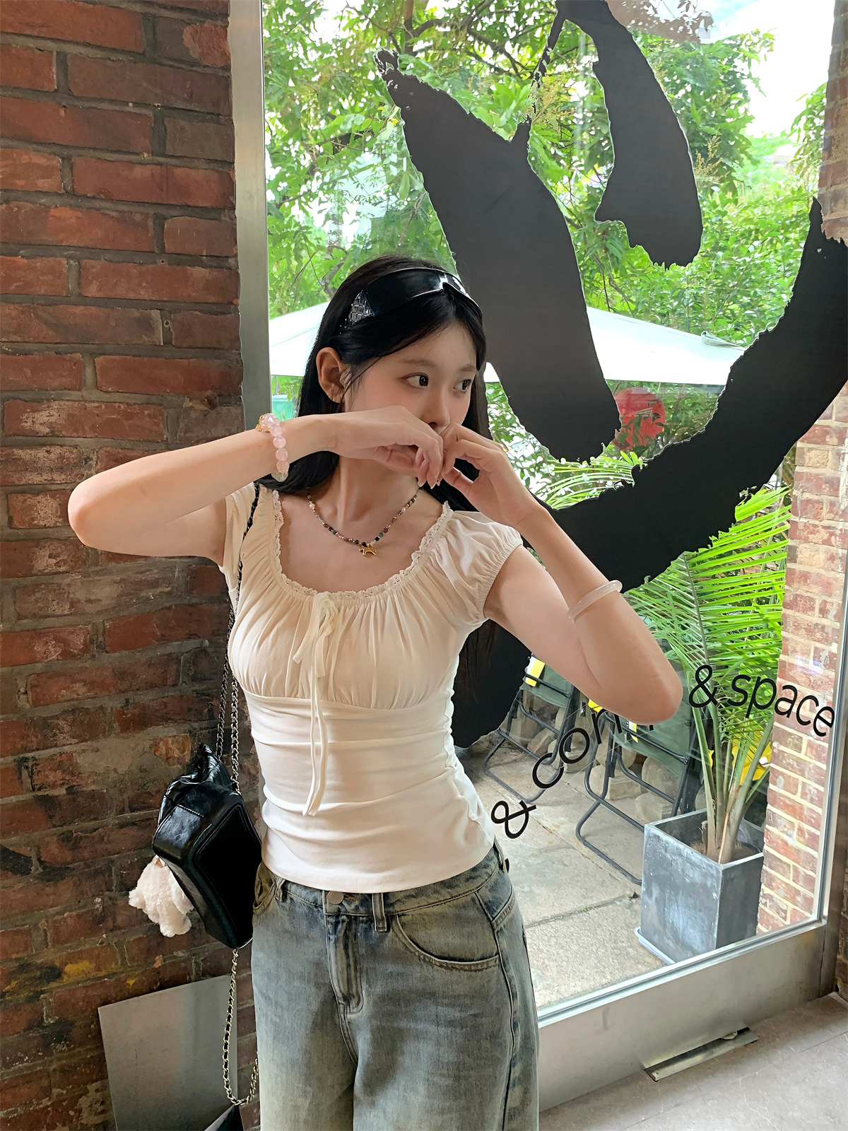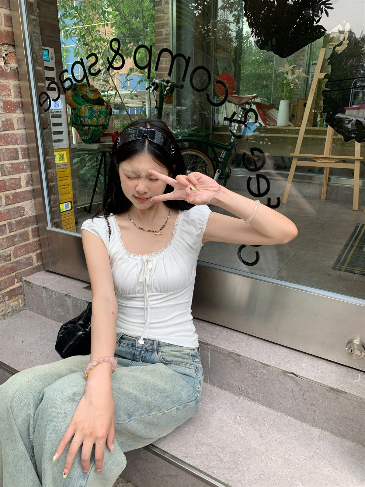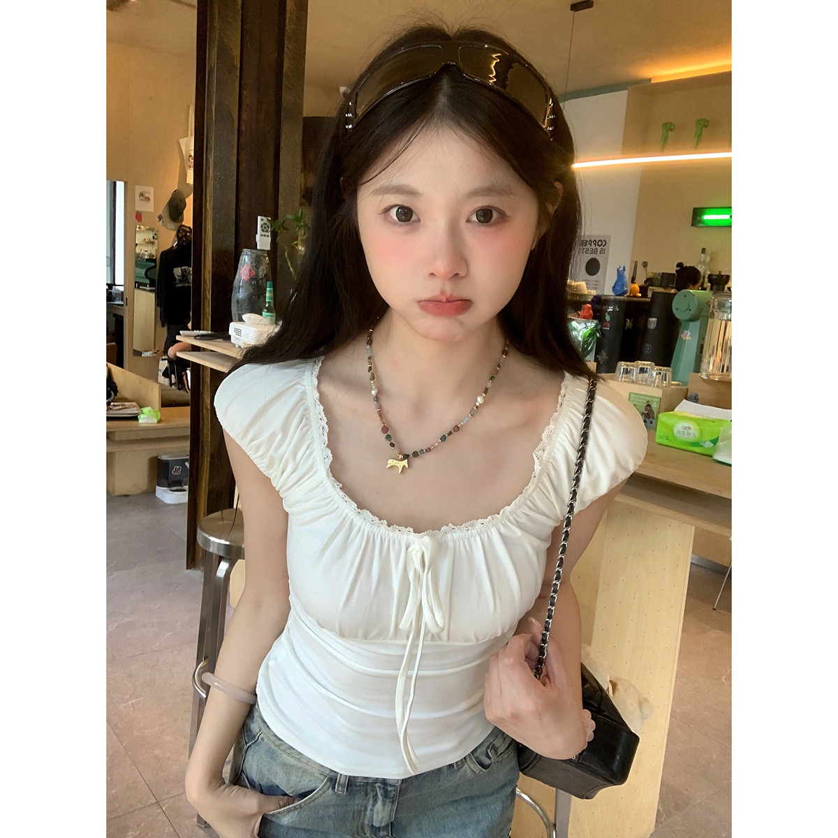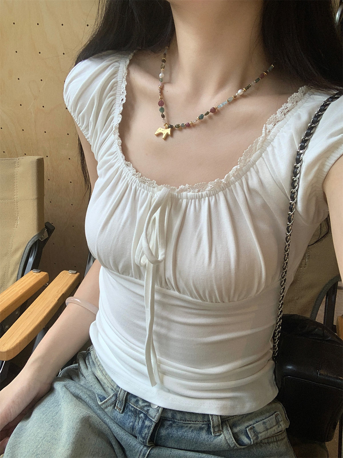RY70135# 春夏韩版纯欲蕾丝花边系带方领褶皱设计短袖T恤打底上衣
