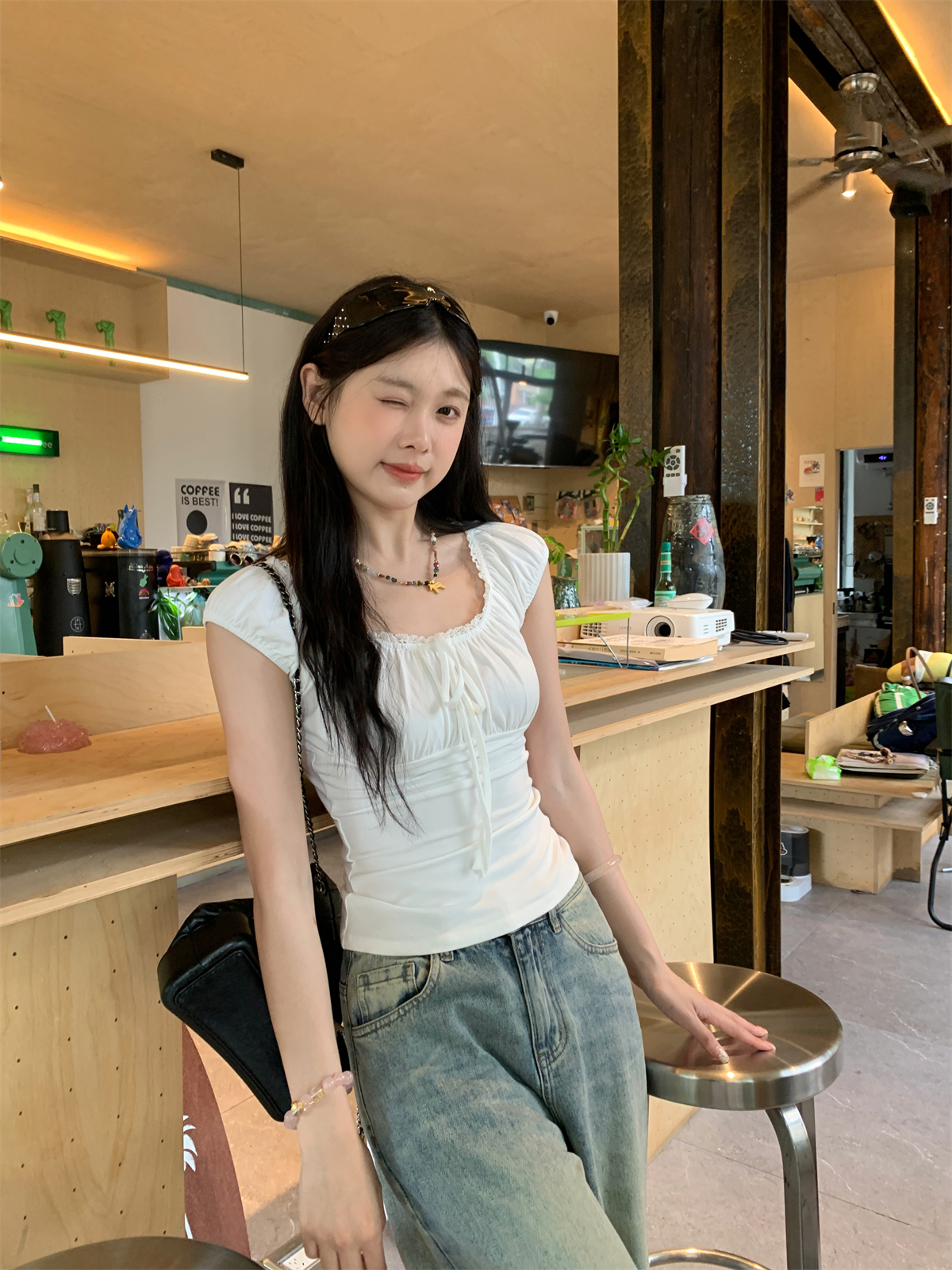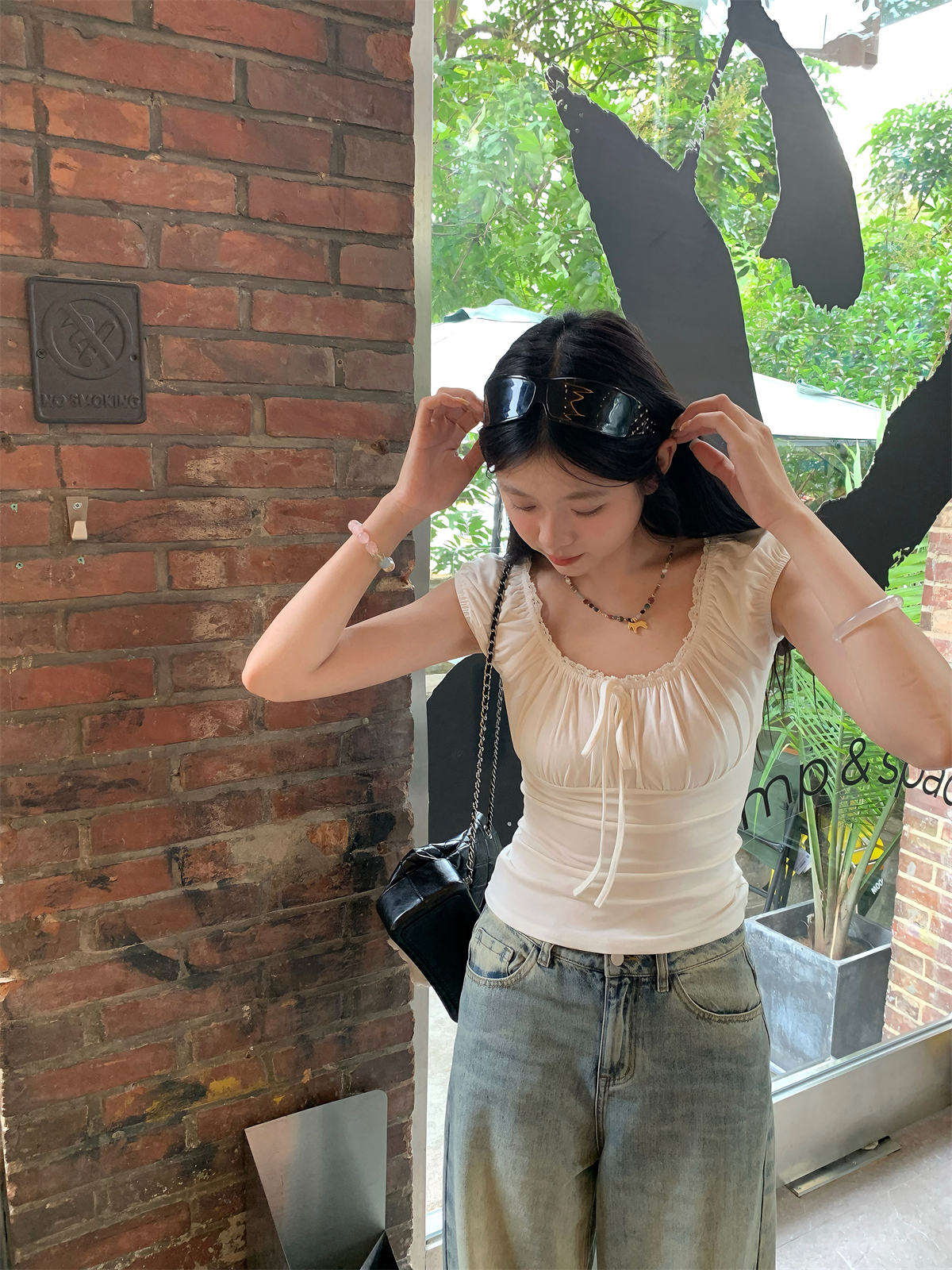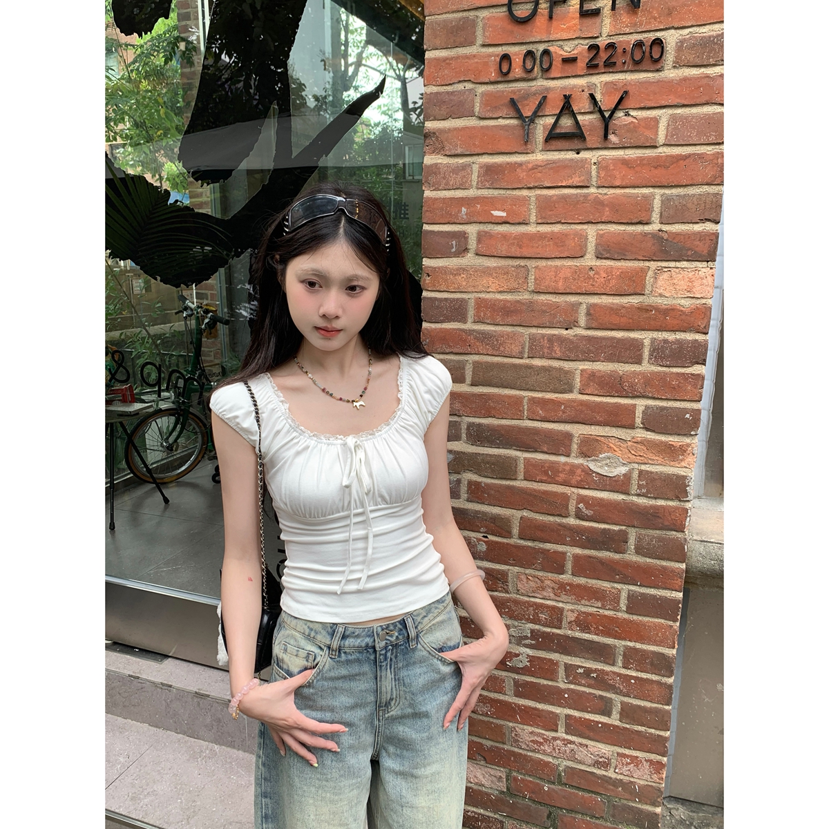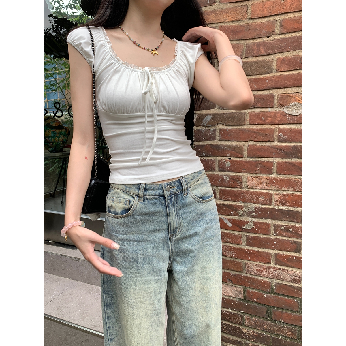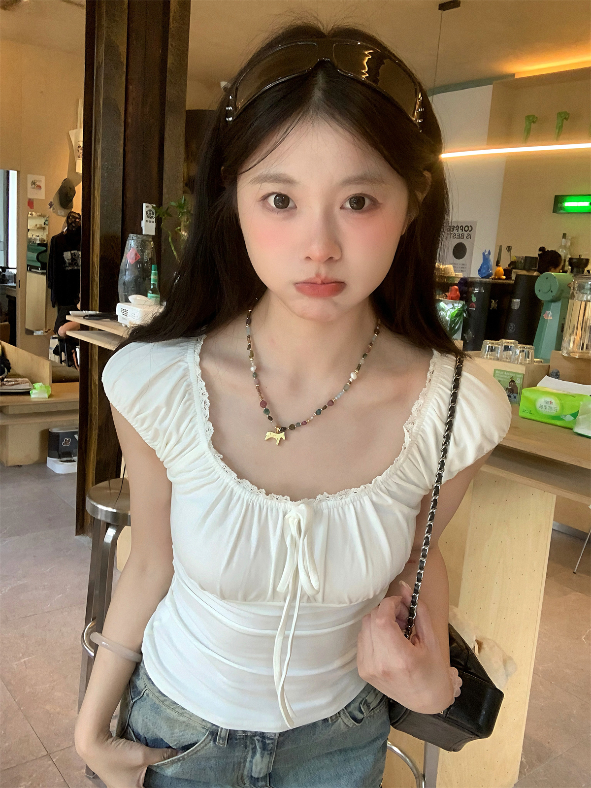 RY70135# 春夏韩版纯欲蕾丝花边系带方领褶皱设计短袖T恤打底上衣