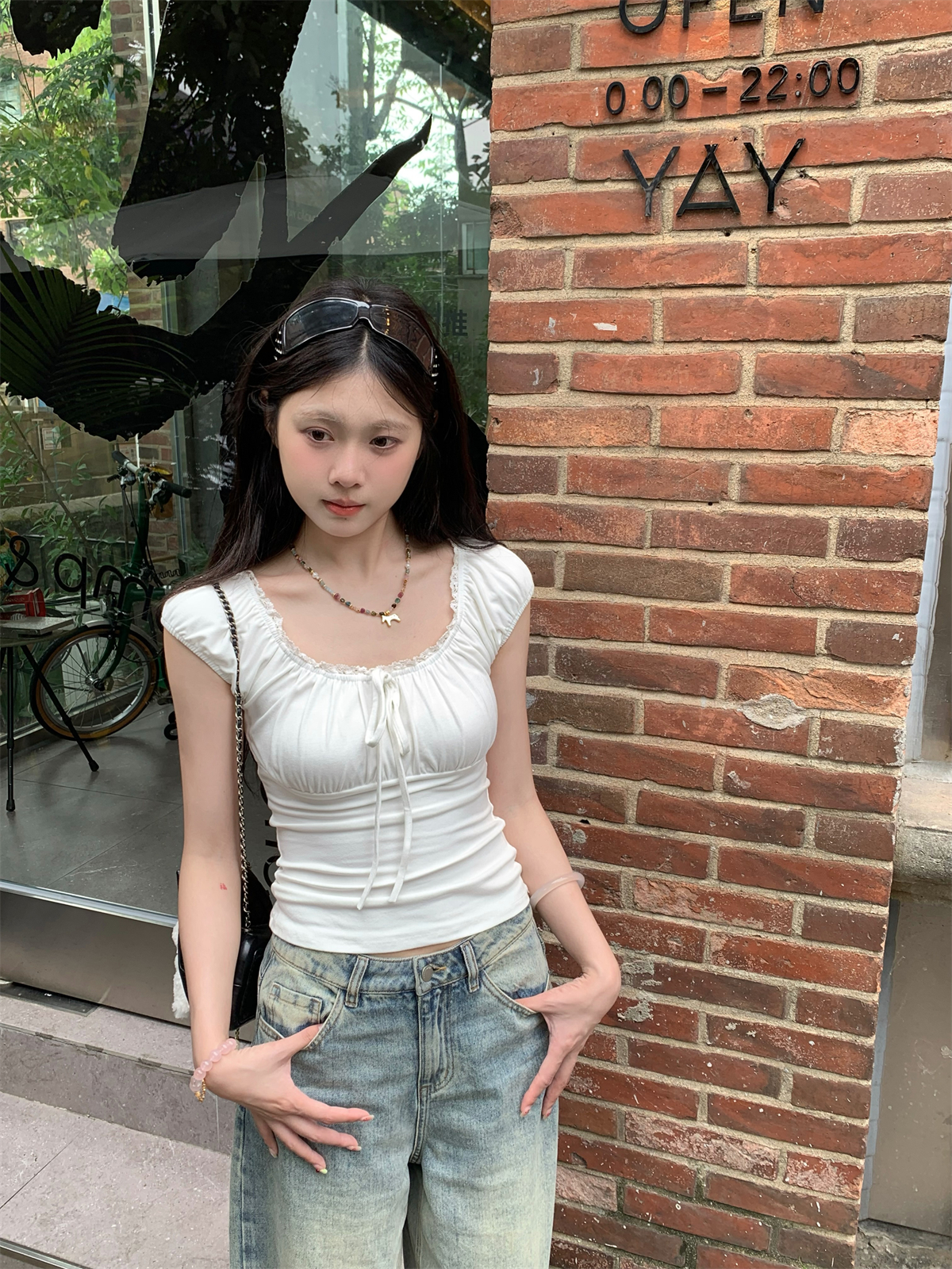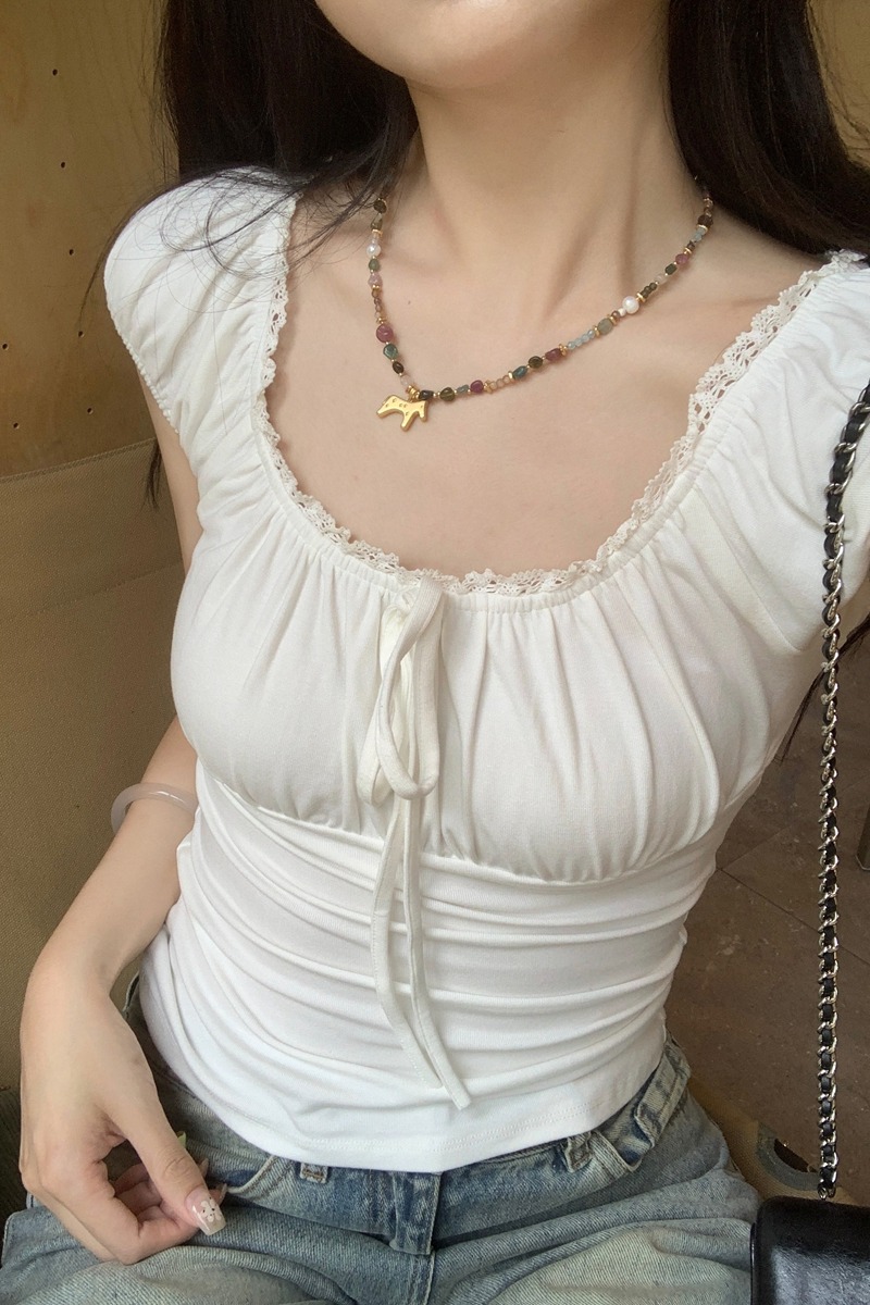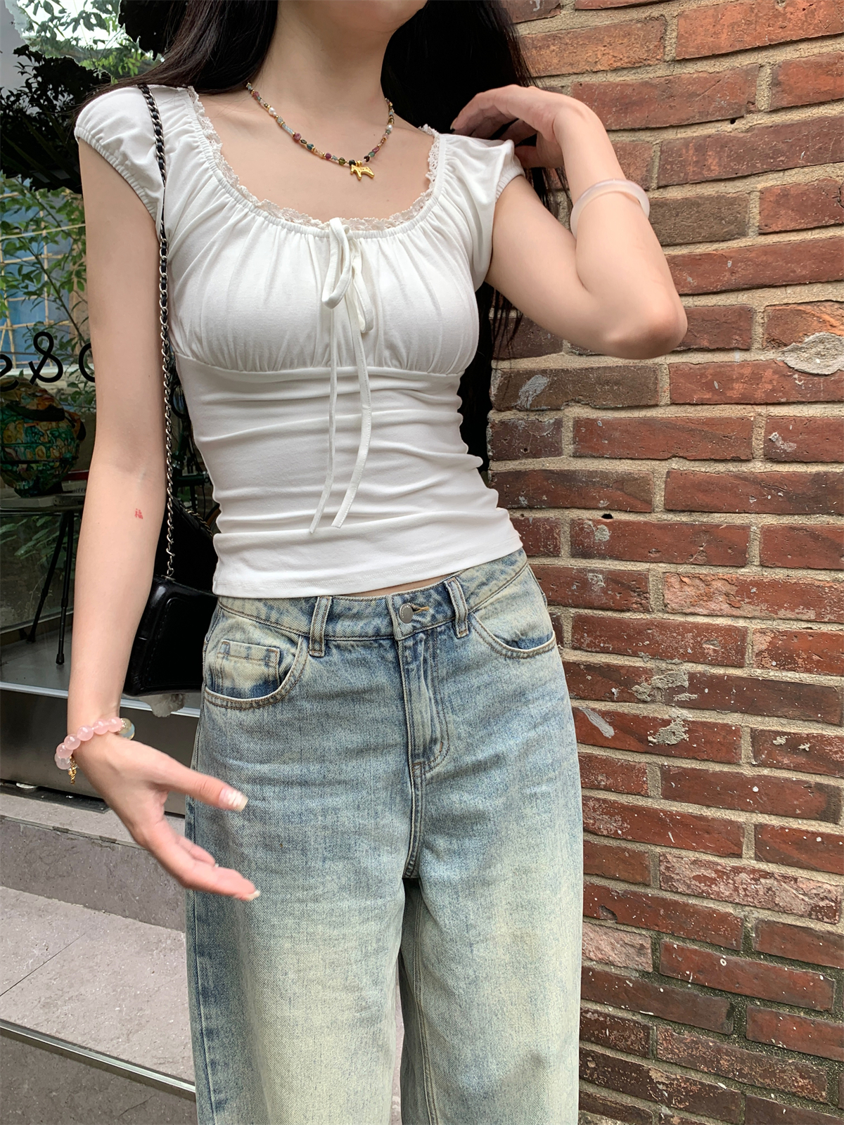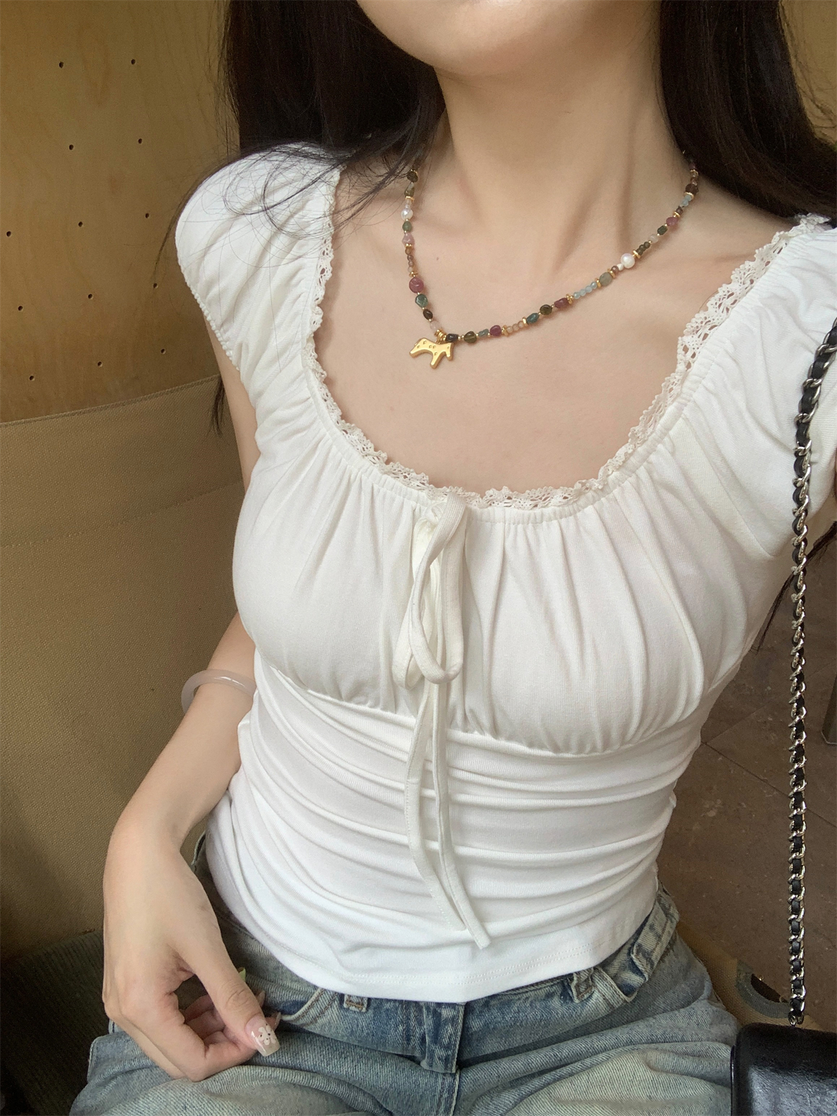 RY70135# 春夏韩版纯欲蕾丝花边系带方领褶皱设计短袖T恤打底上衣