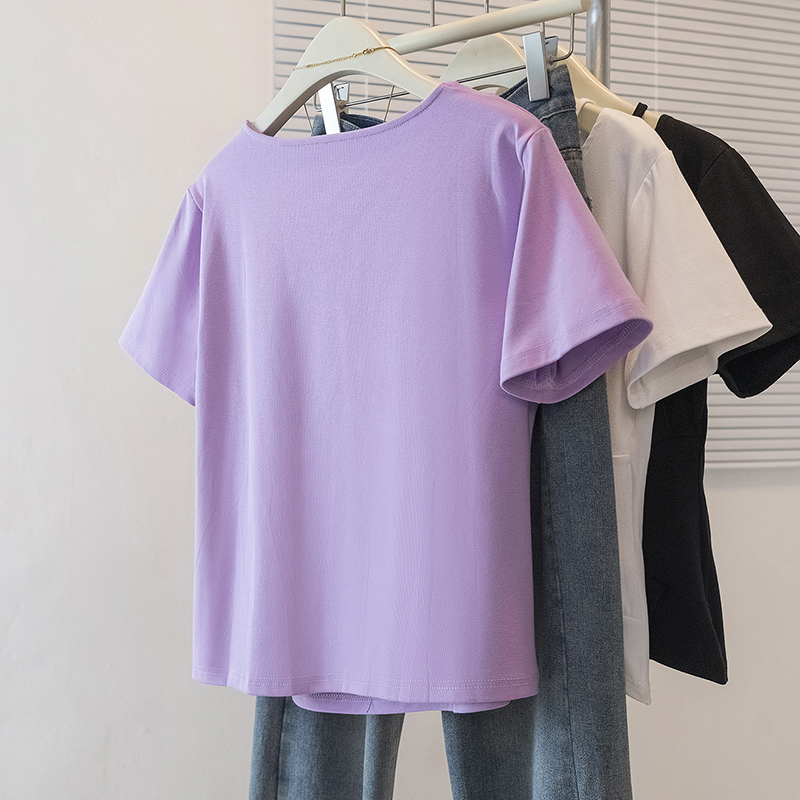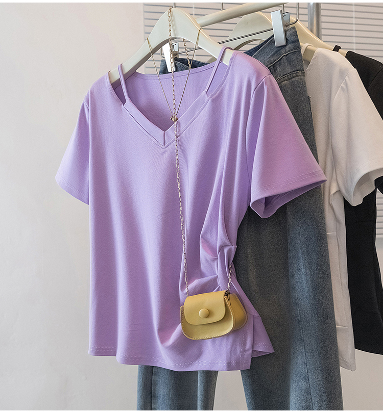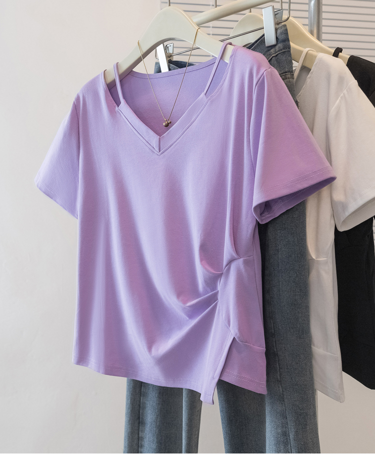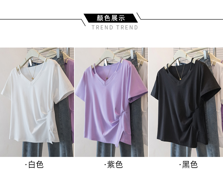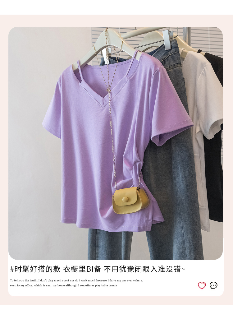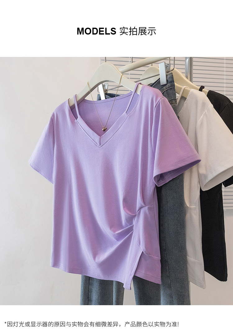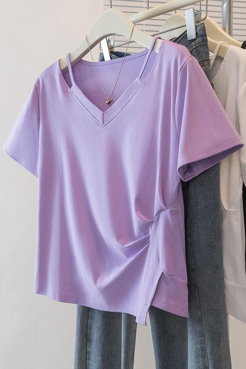 RY70142# 实拍大码女装韩版流行紫色V领短袖t恤夏胖妹妹宽松显瘦休闲上衣潮