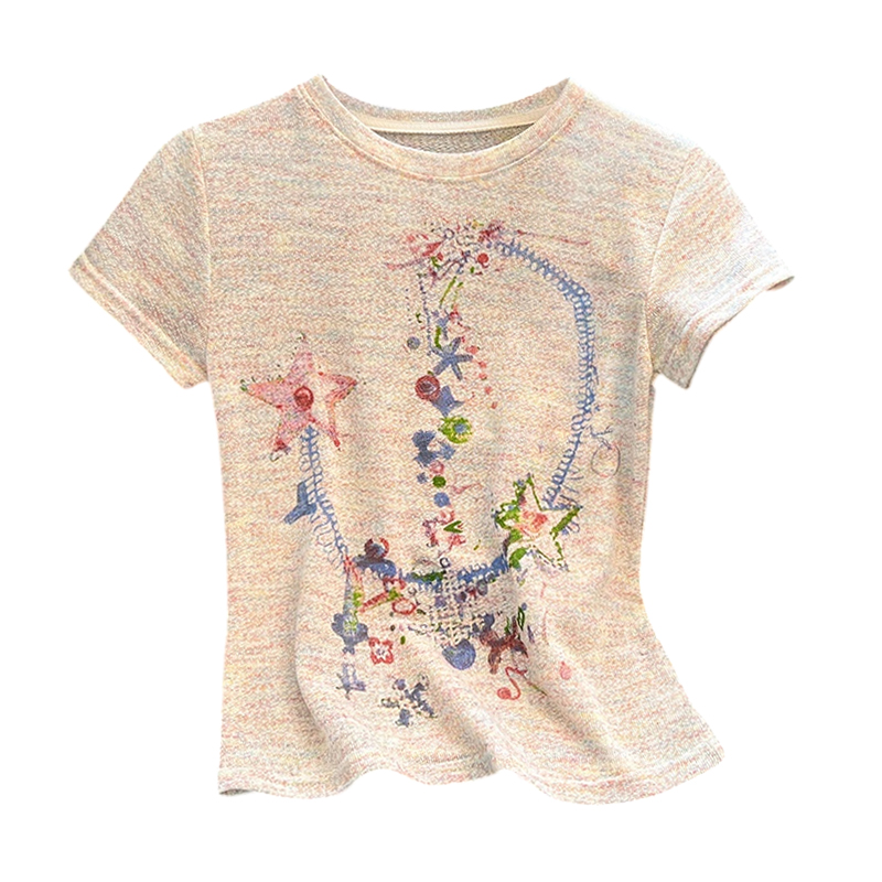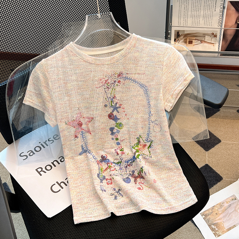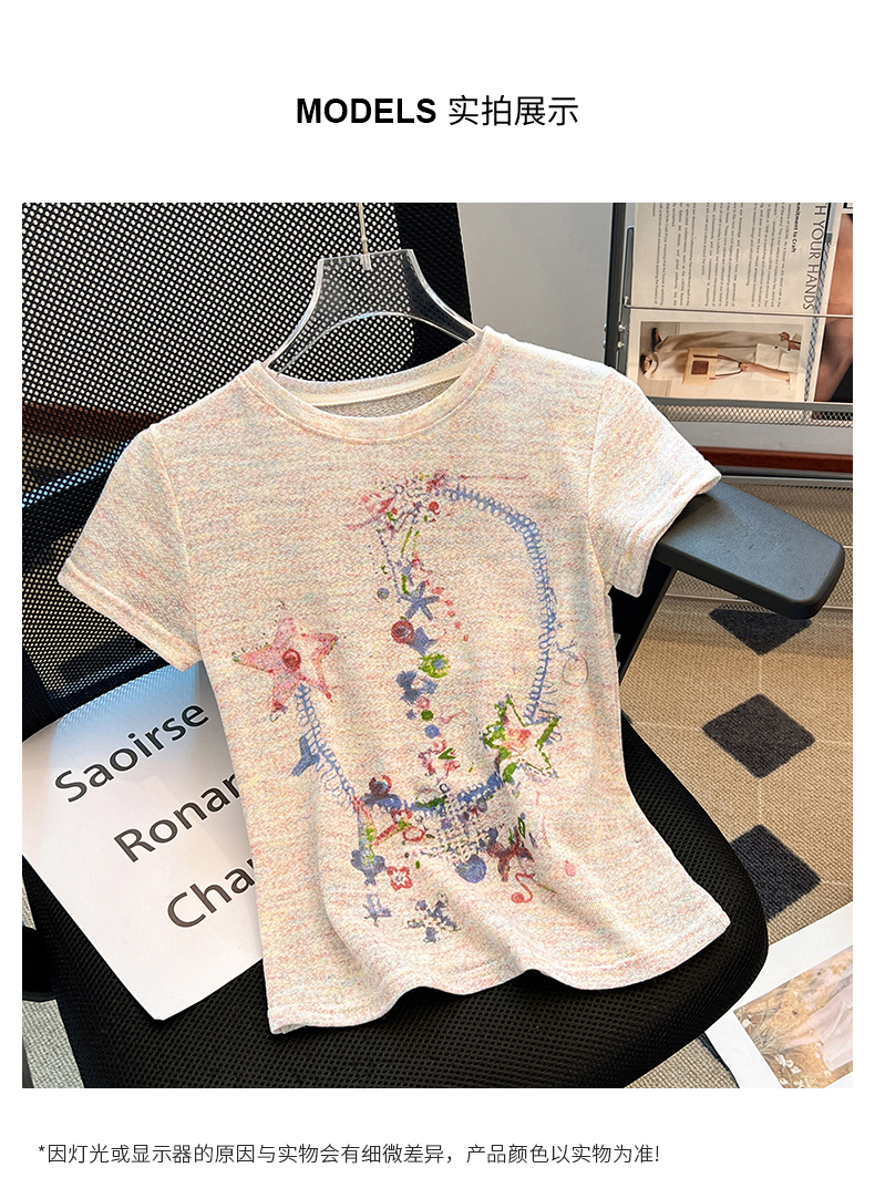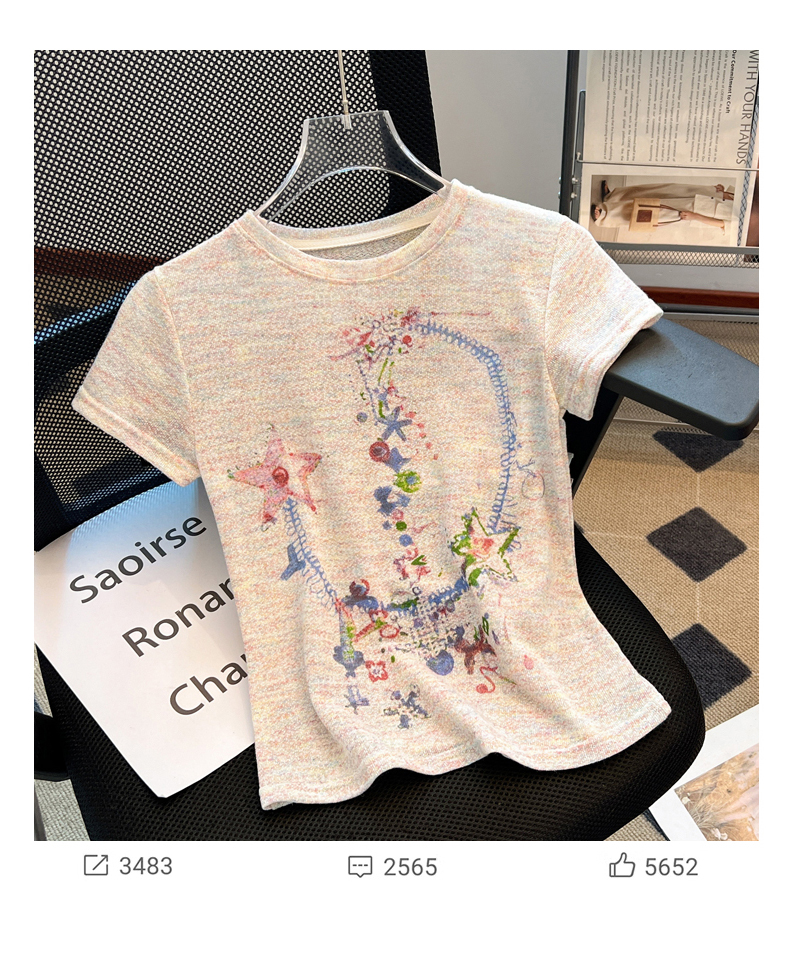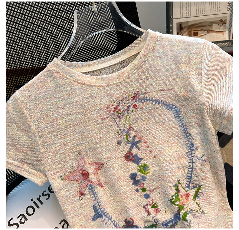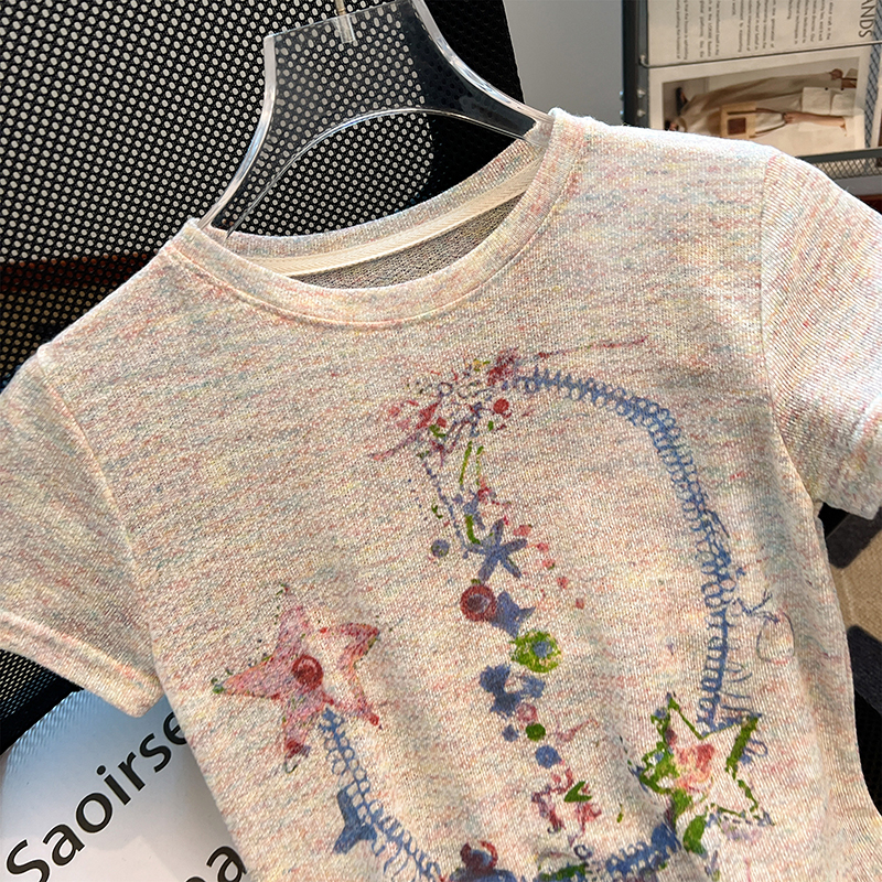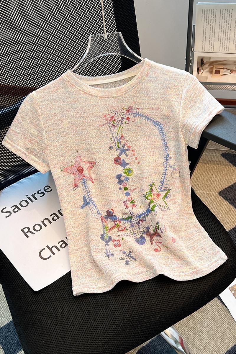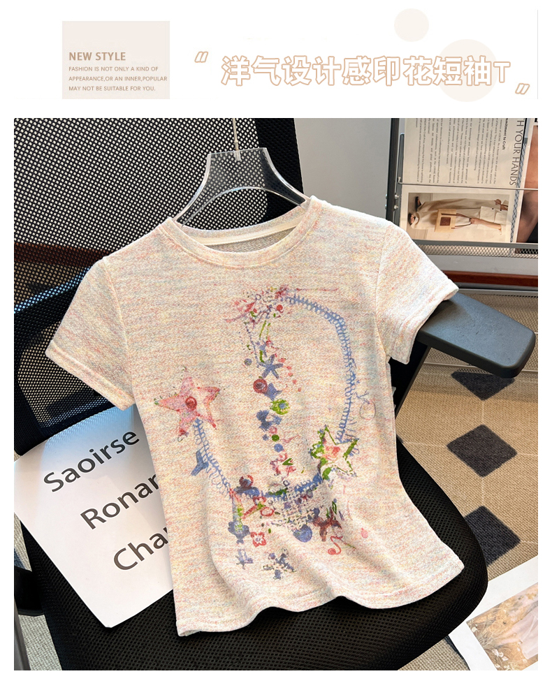 RY70144# 设计感涂鸦印花正肩短袖T恤女夏季小众修身显瘦圆领短款针织上衣