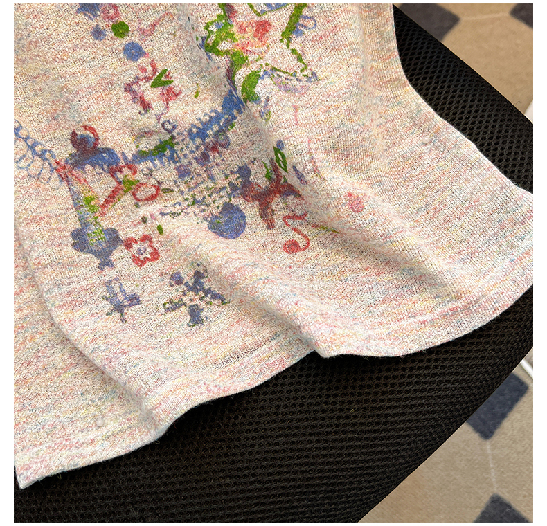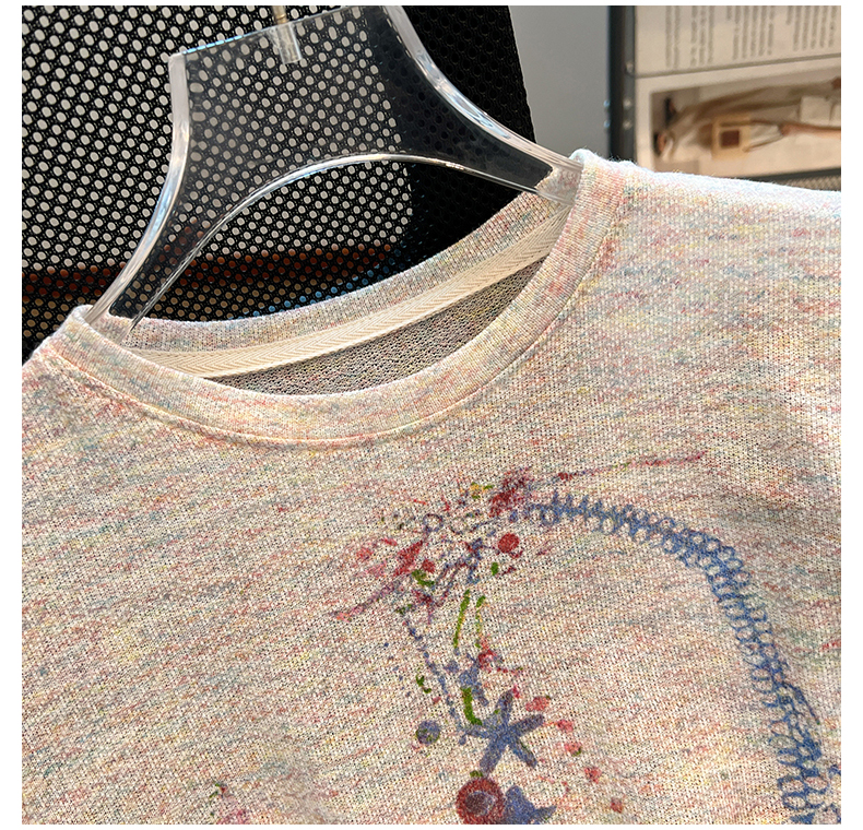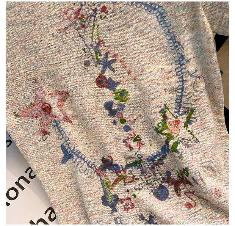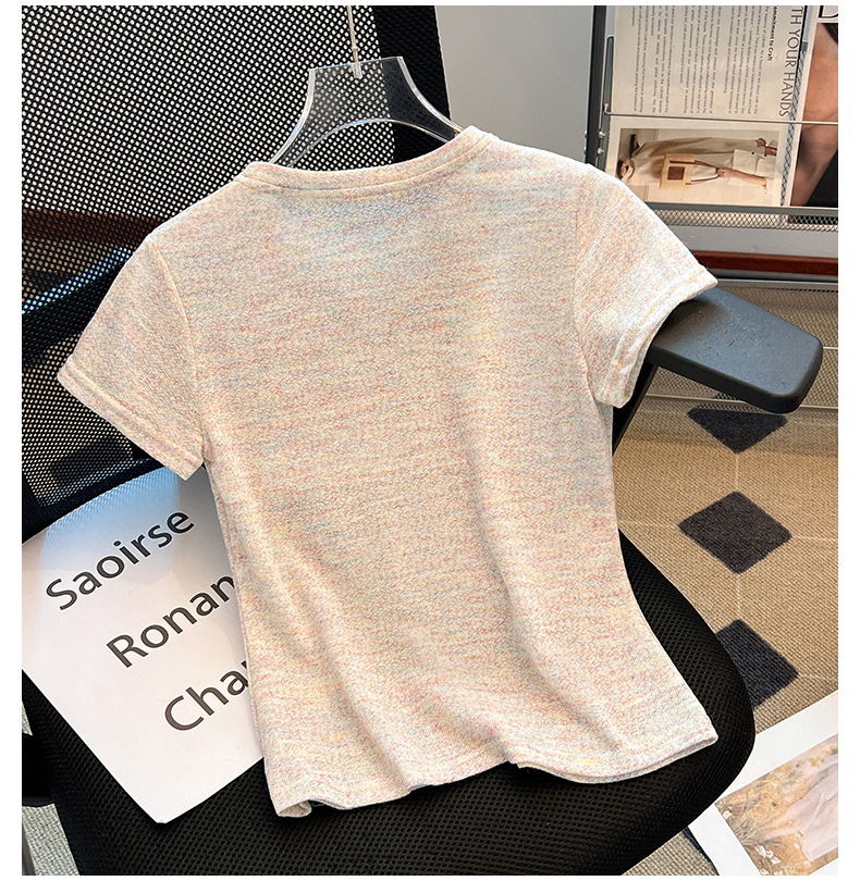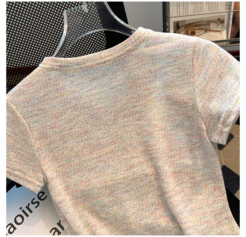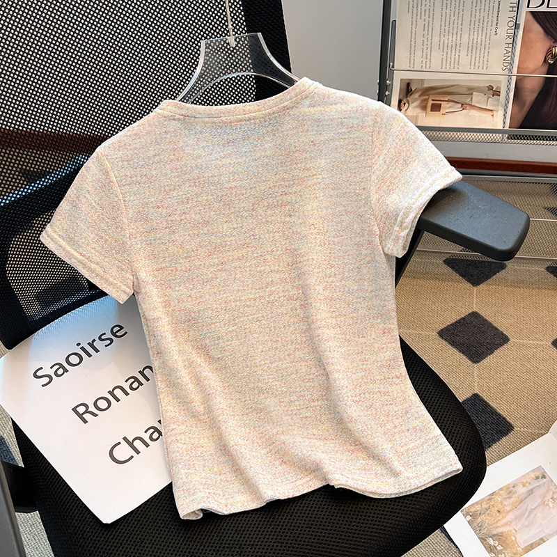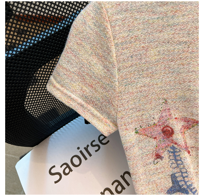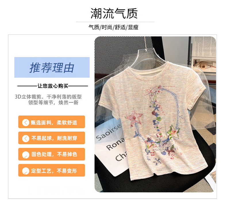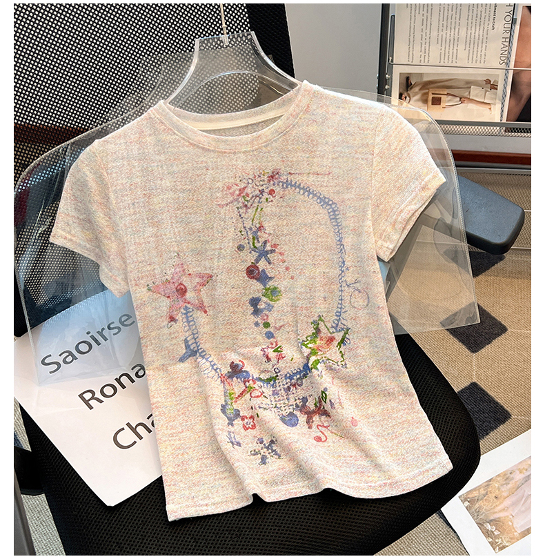 RY70144# 设计感涂鸦印花正肩短袖T恤女夏季小众修身显瘦圆领短款针织上衣