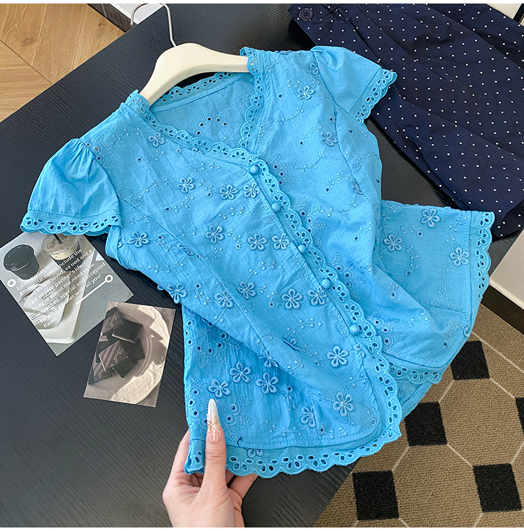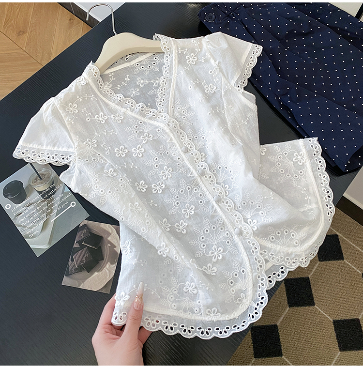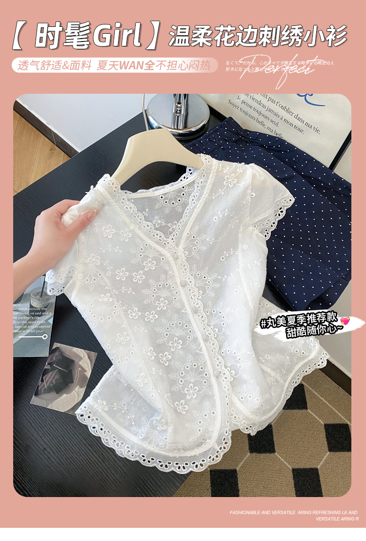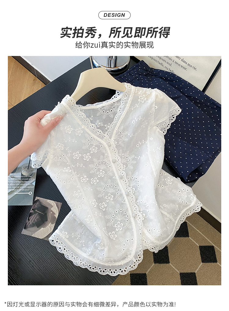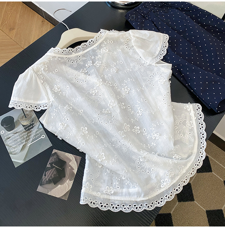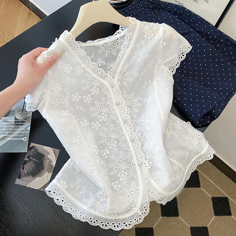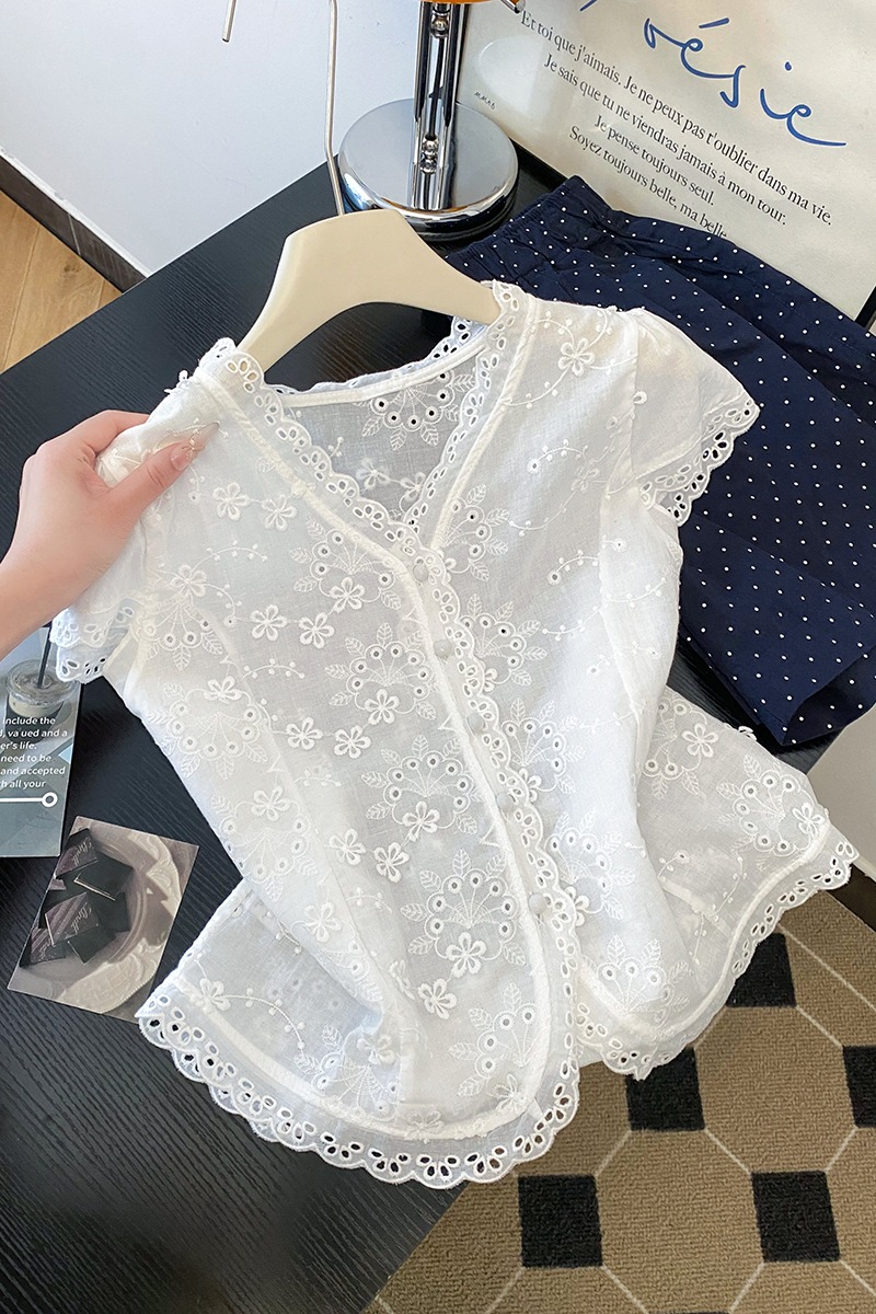 RY70148# 韩系蕾丝碎花刺绣短袖衬衫女夏季新款小众设计感减龄短款上衣2025