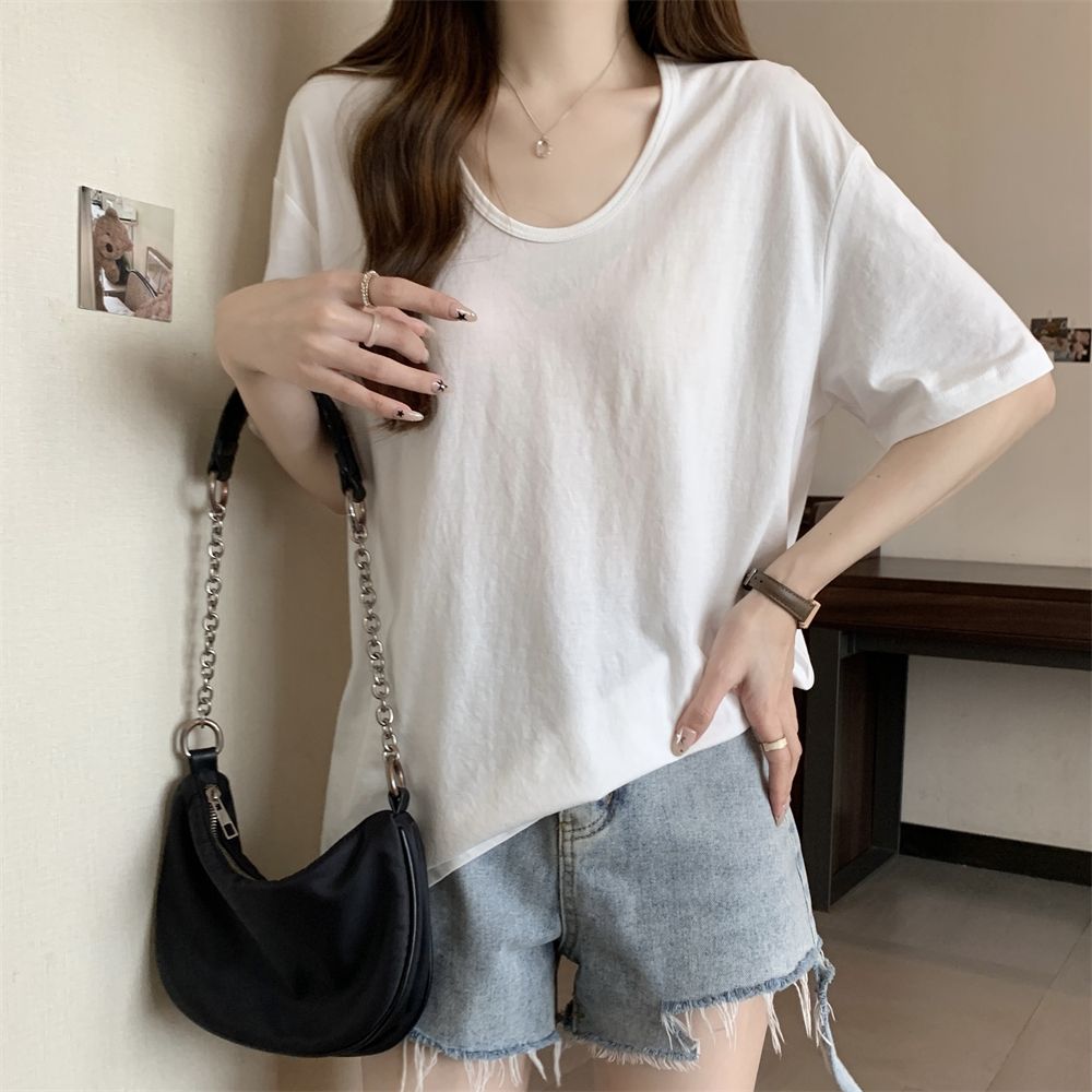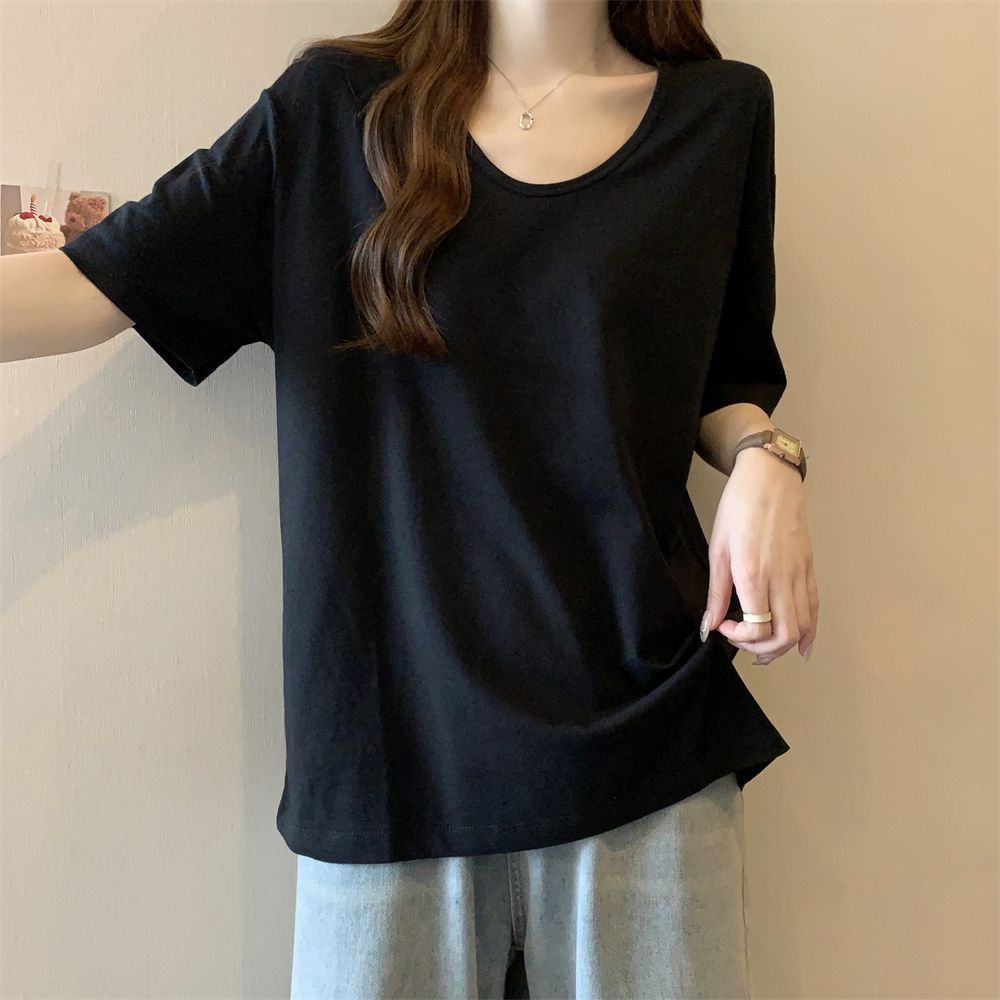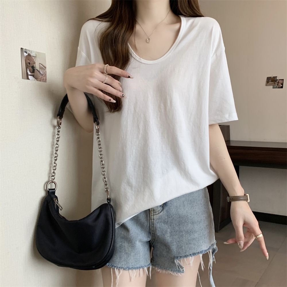 RY70158# 纯棉U领宽松短袖T恤女薄款