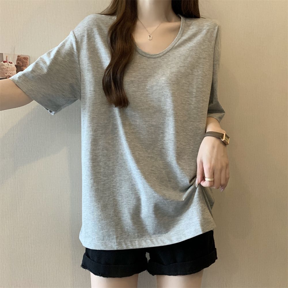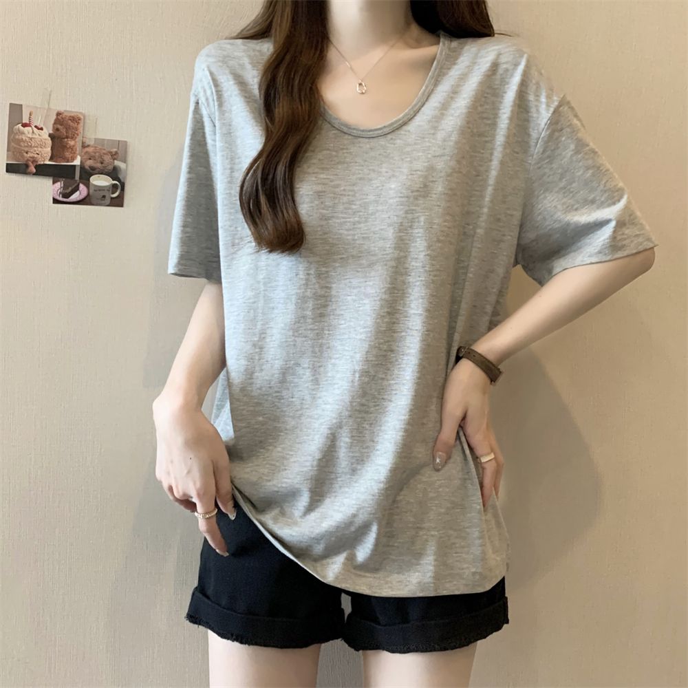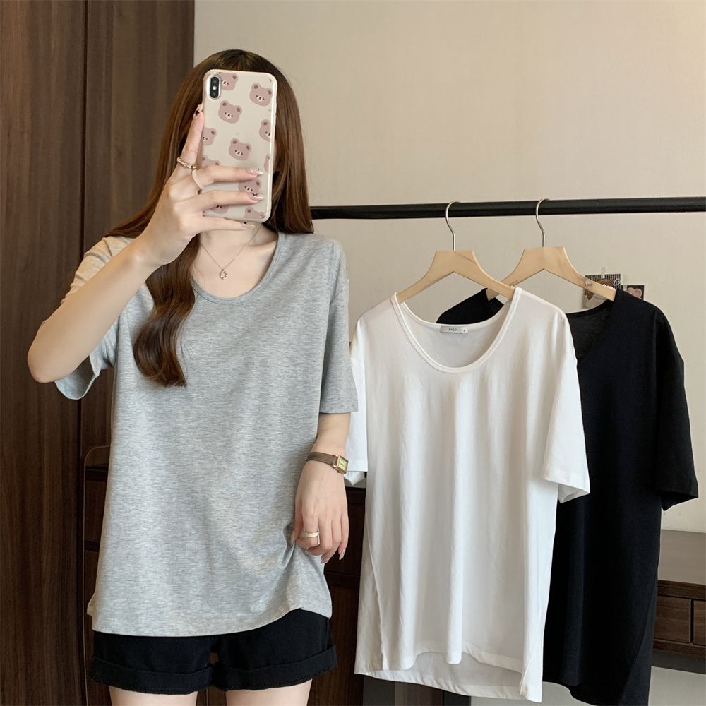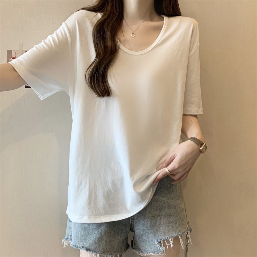 RY70158# 纯棉U领宽松短袖T恤女薄款