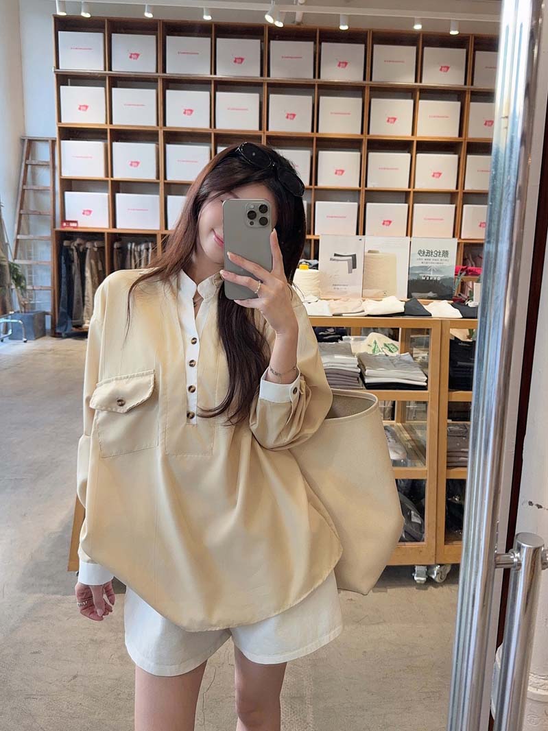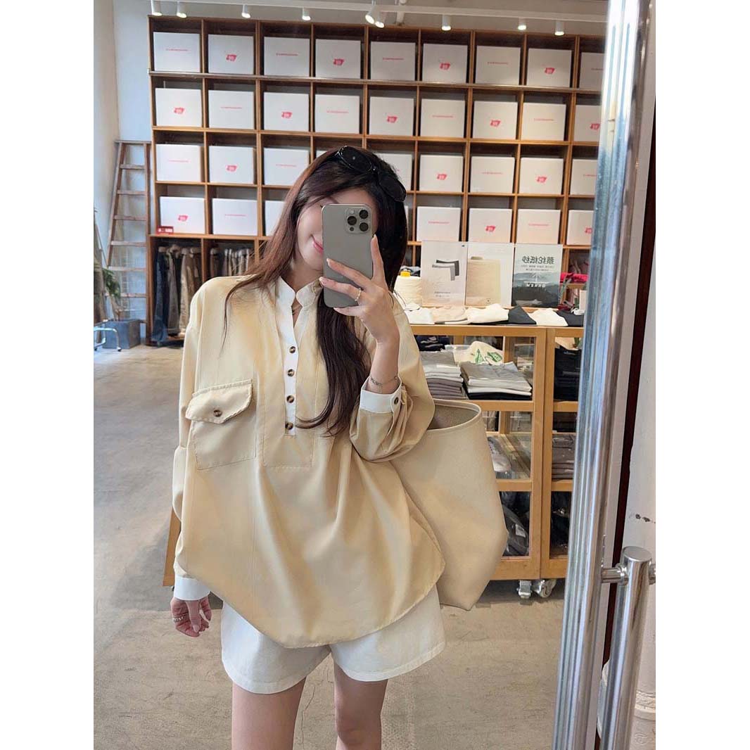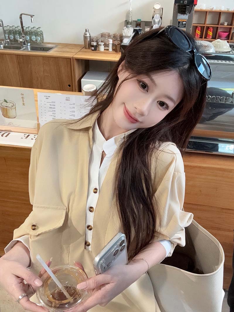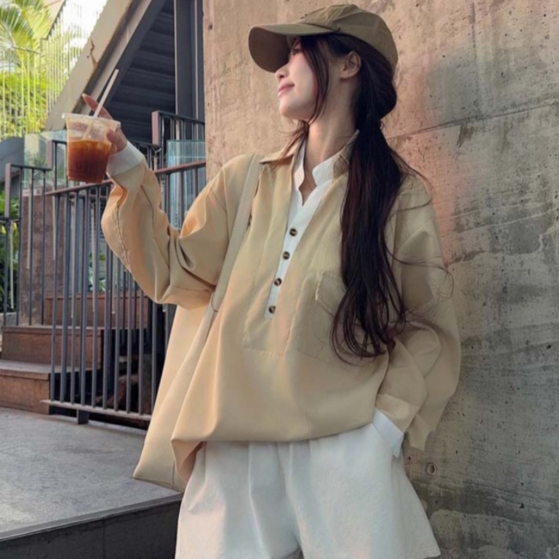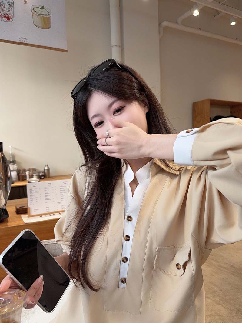 RY76# 实拍 休闲卡其色拼接撞色V领衬衫女2026春季新款长袖假两件上衣