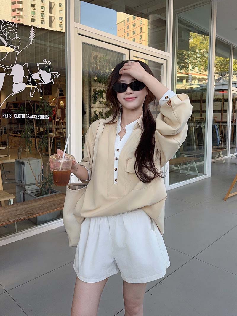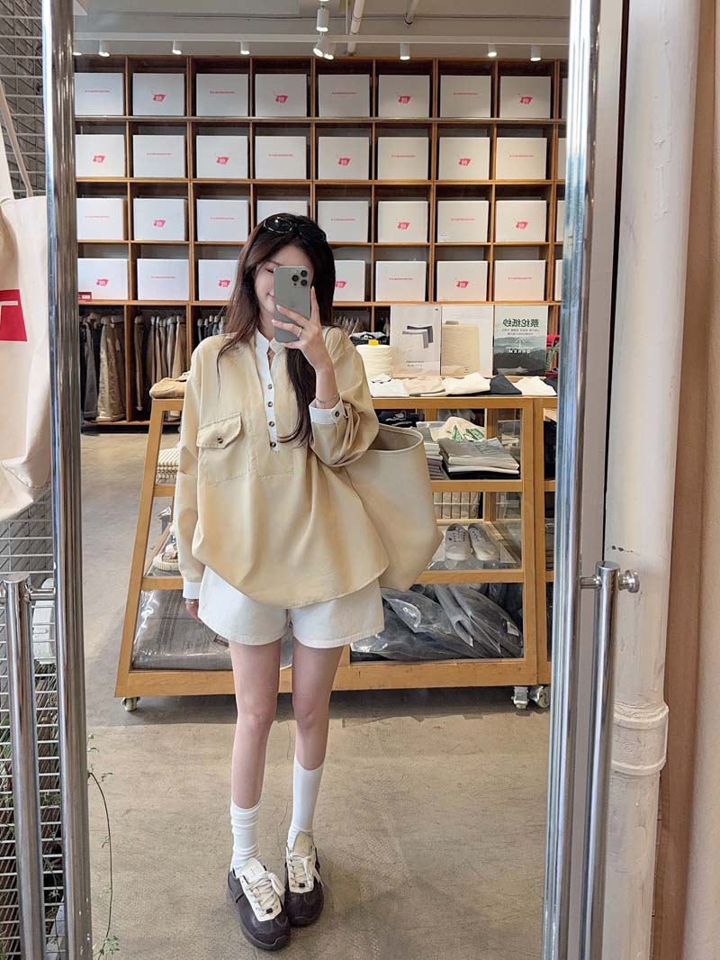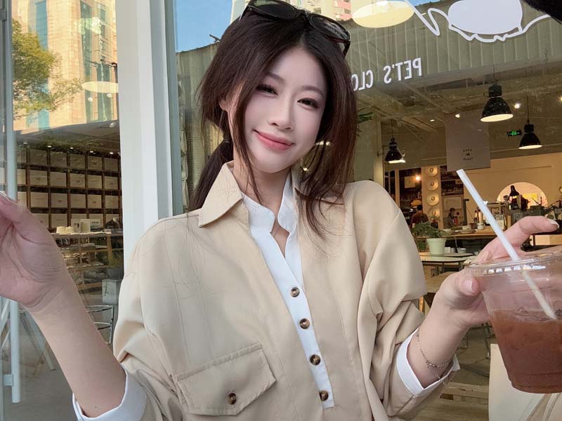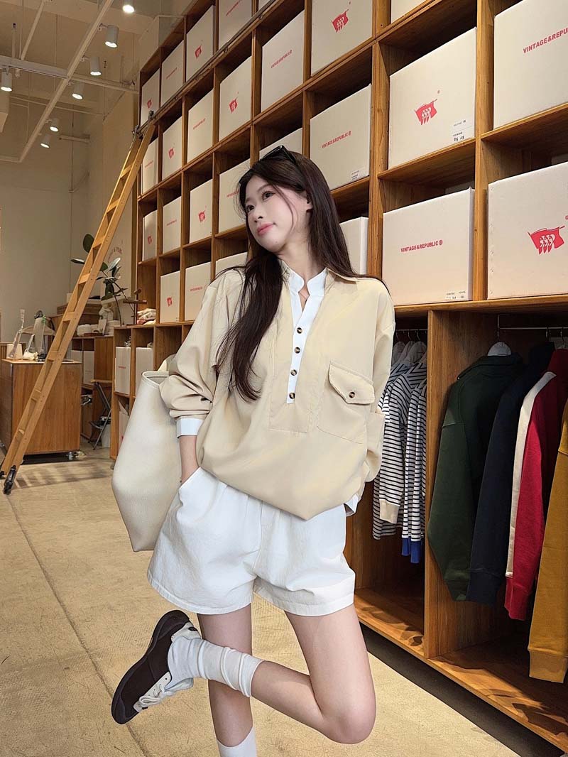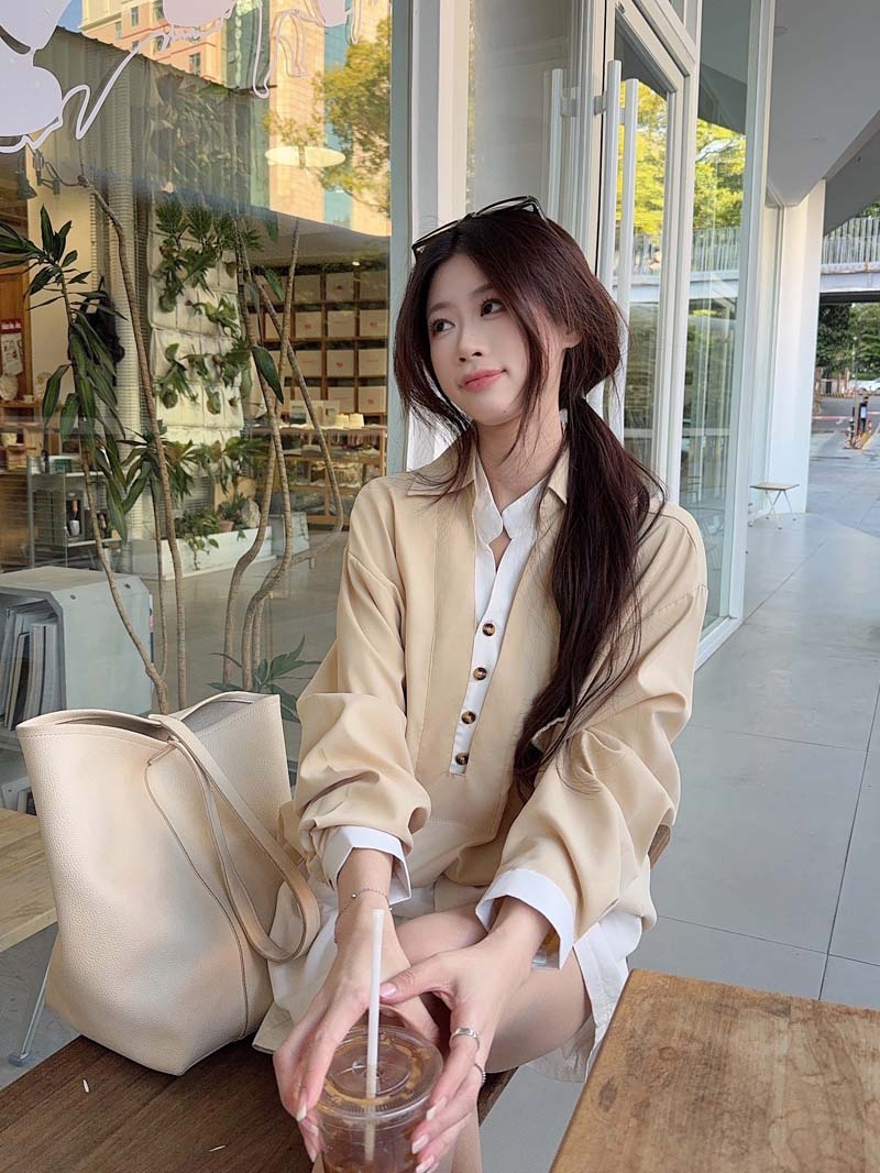 RY76# 实拍 休闲卡其色拼接撞色V领衬衫女2026春季新款长袖假两件上衣