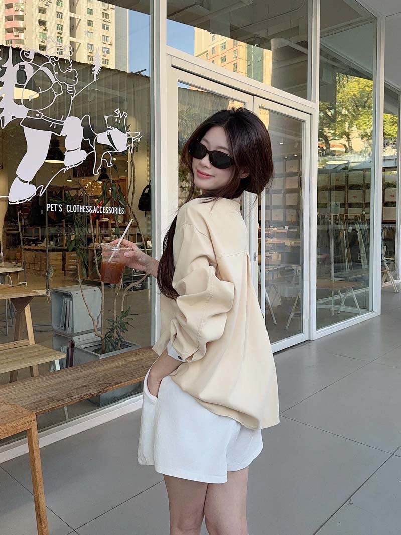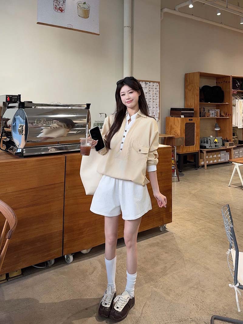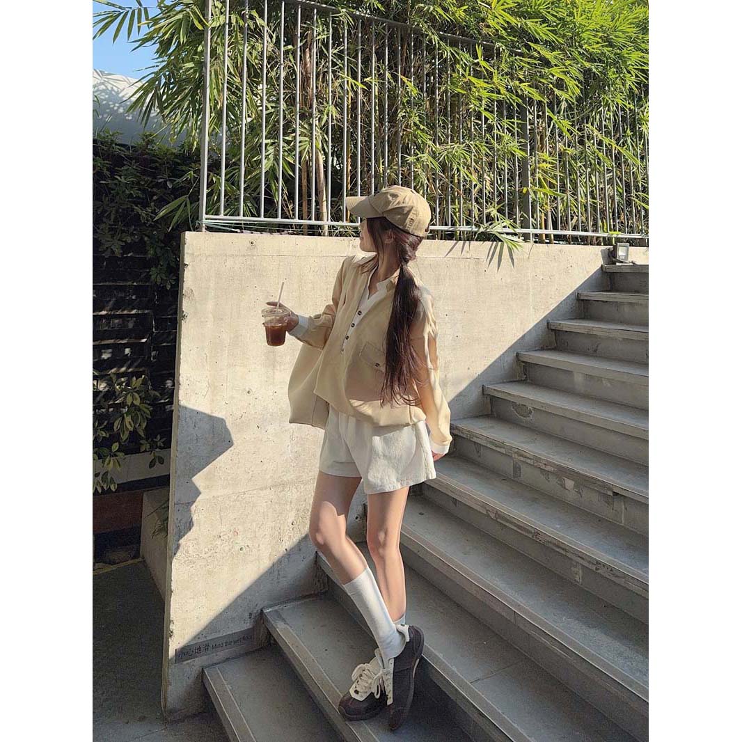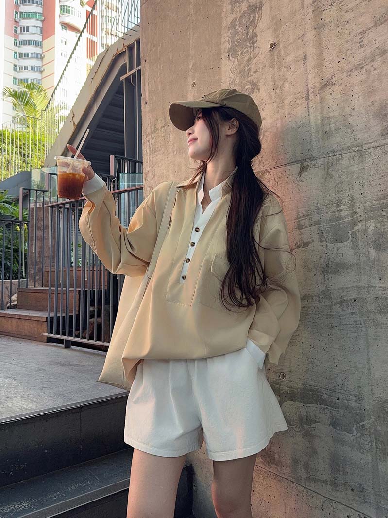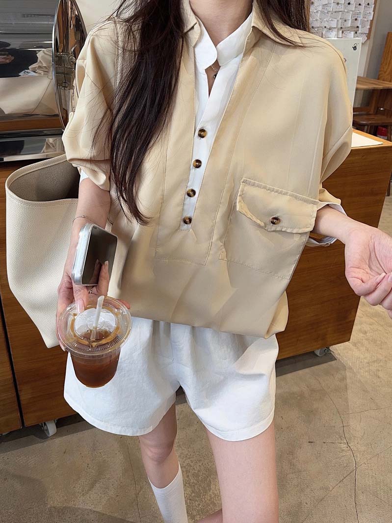 RY76# 实拍 休闲卡其色拼接撞色V领衬衫女2026春季新款长袖假两件上衣