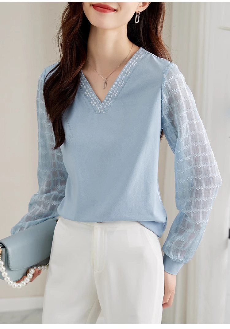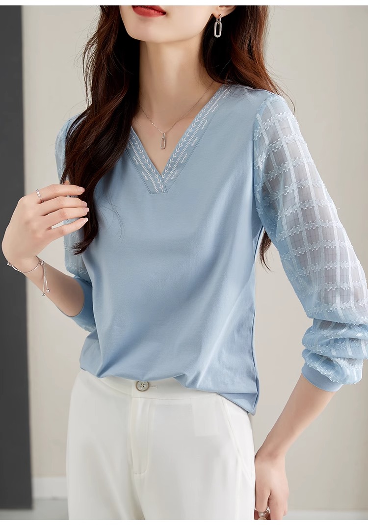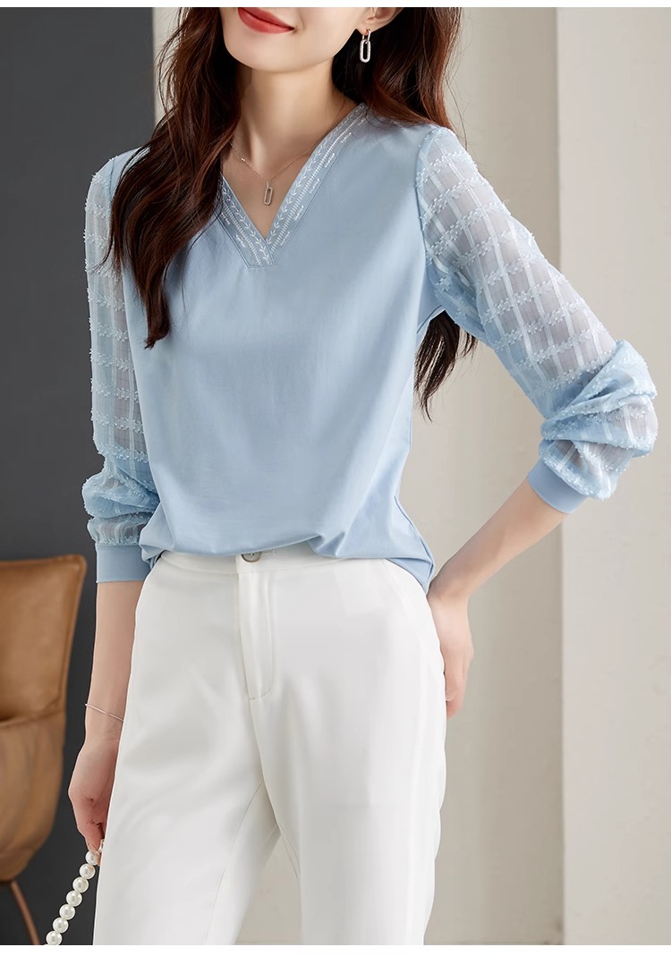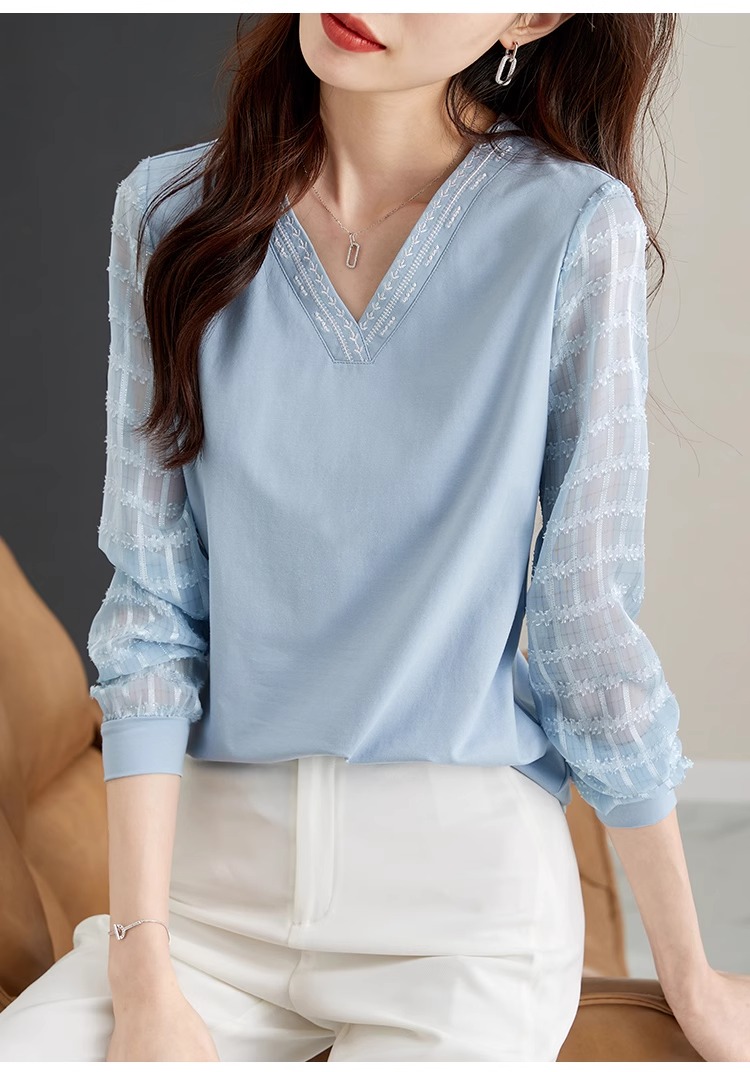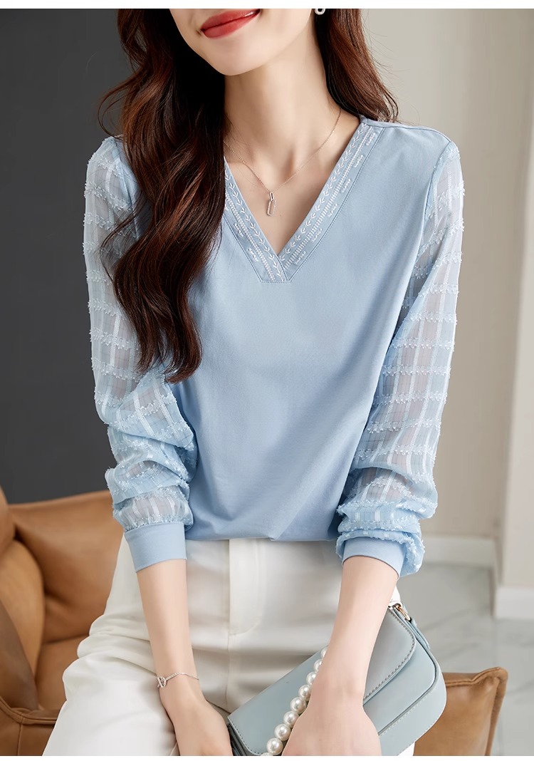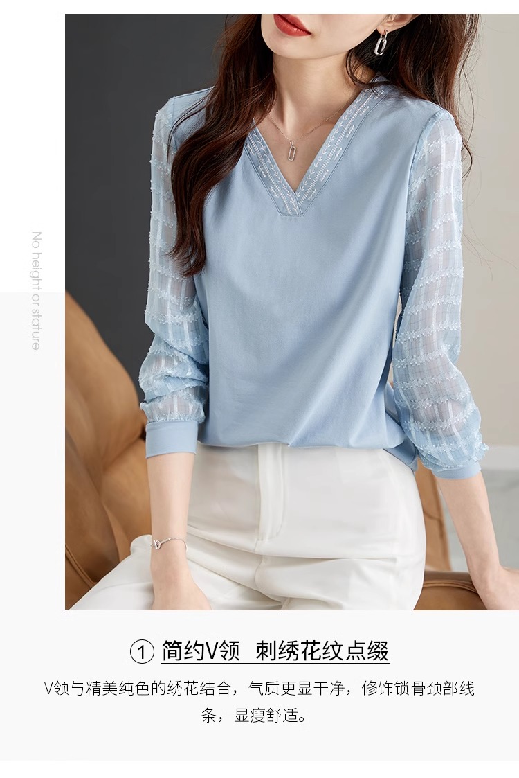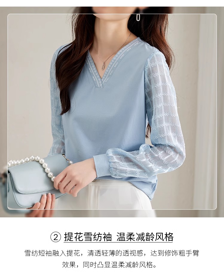 RY96# 2026春秋新款女装温柔风提花雪纺长袖拼接假两件V领T恤上衣