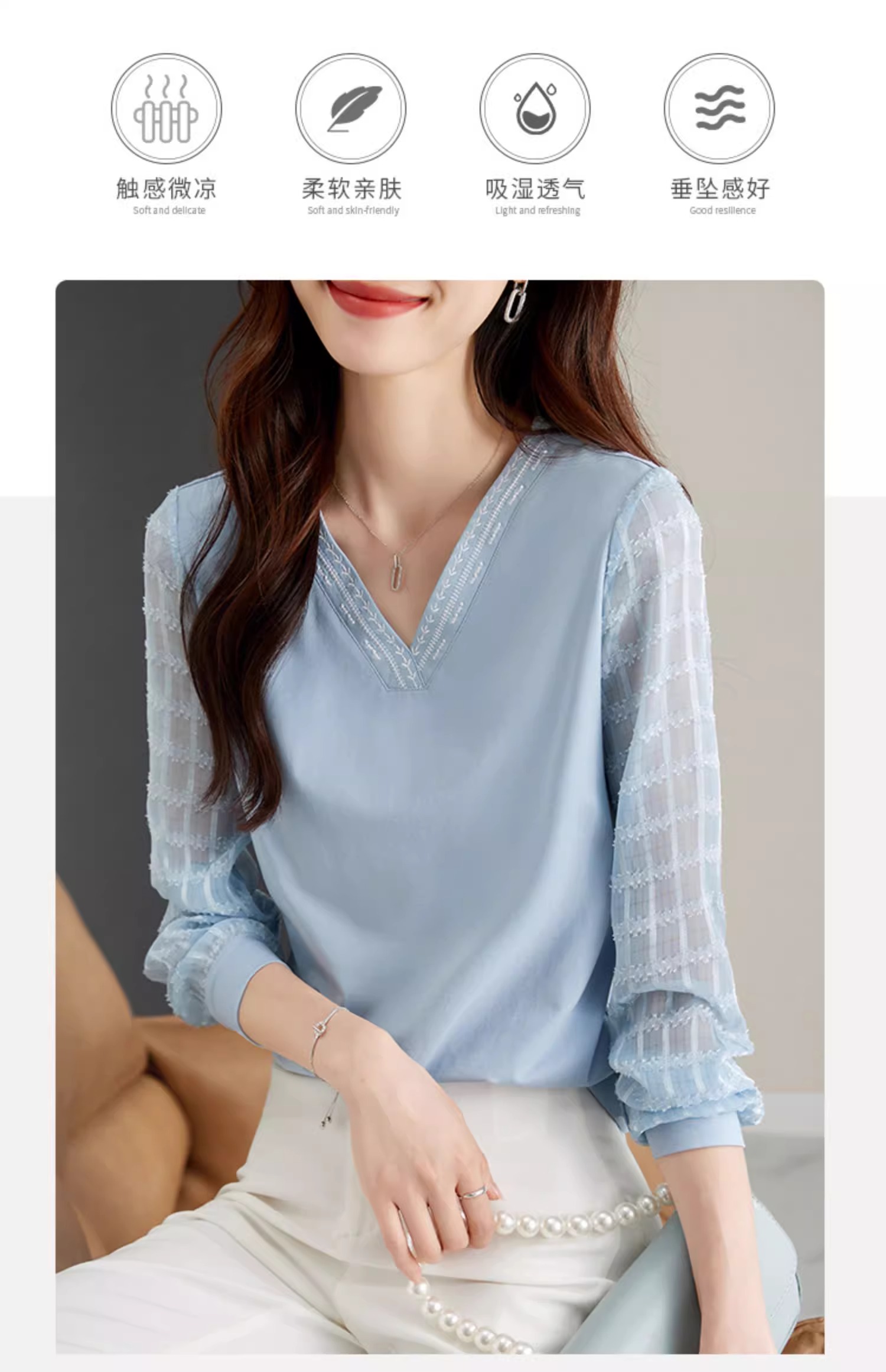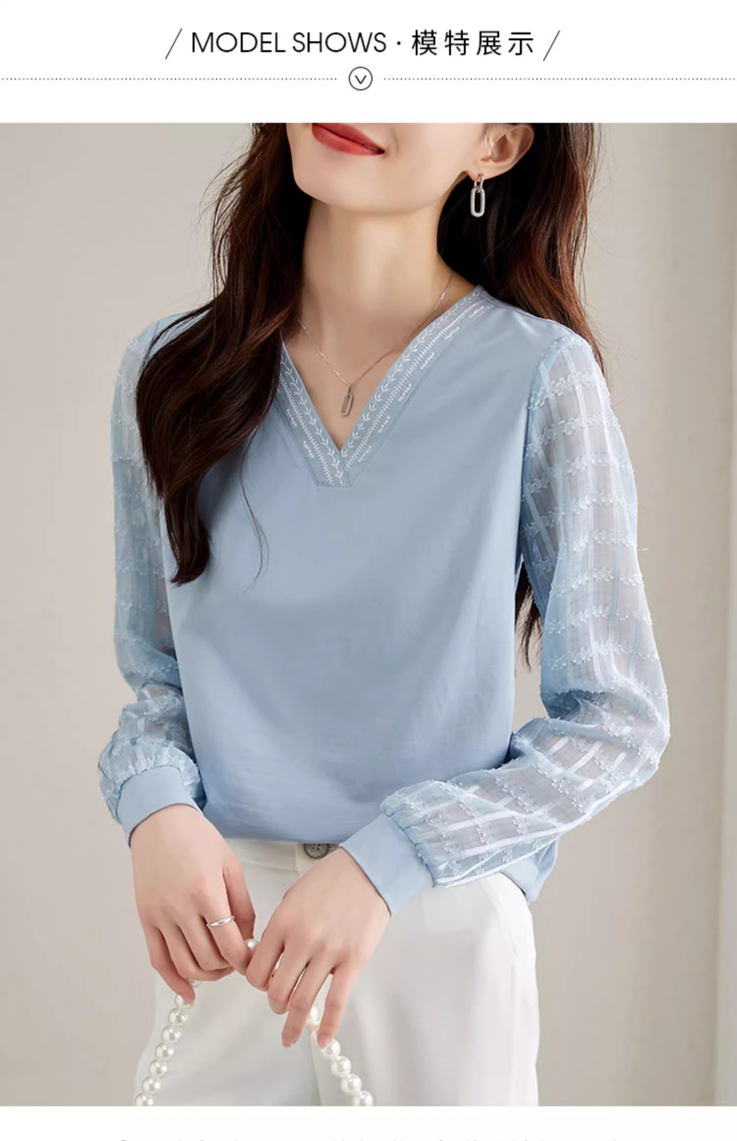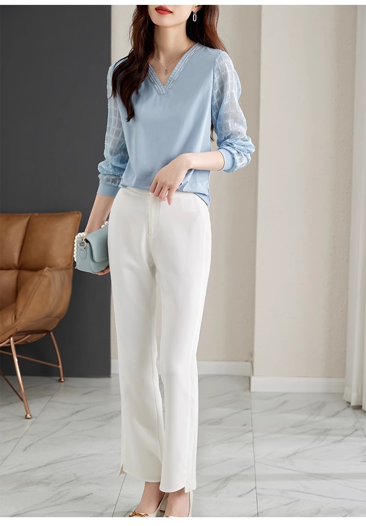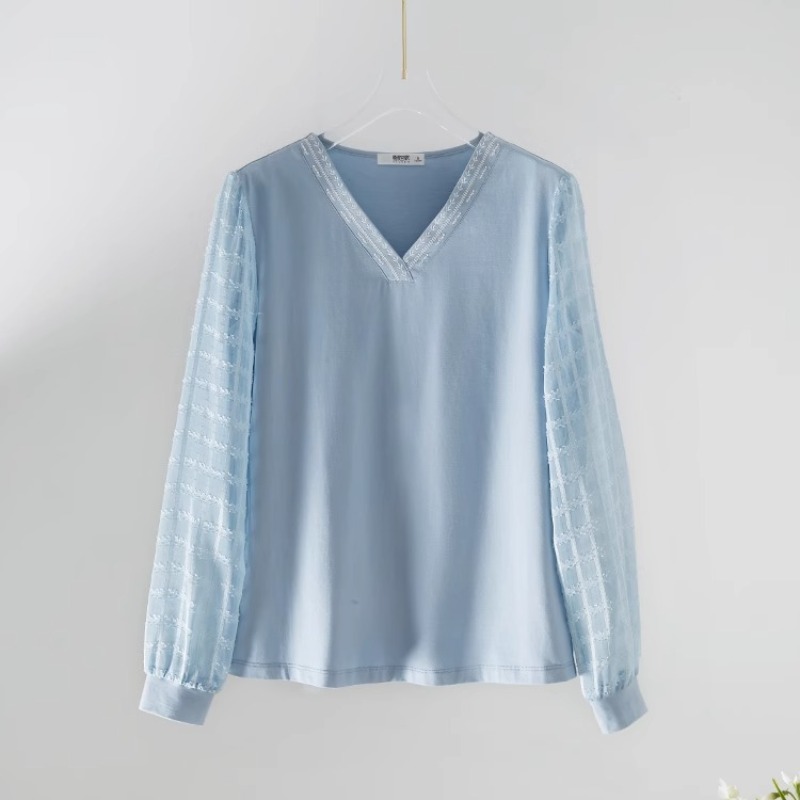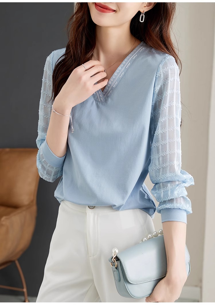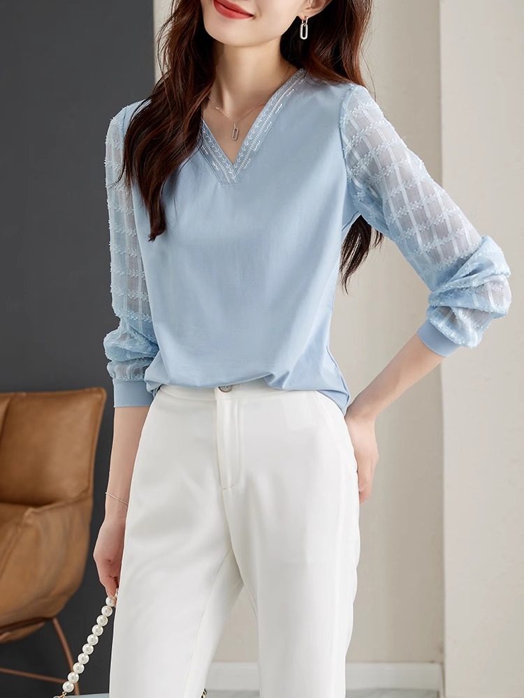RY96# 2026春秋新款女装温柔风提花雪纺长袖拼接假两件V领T恤上衣