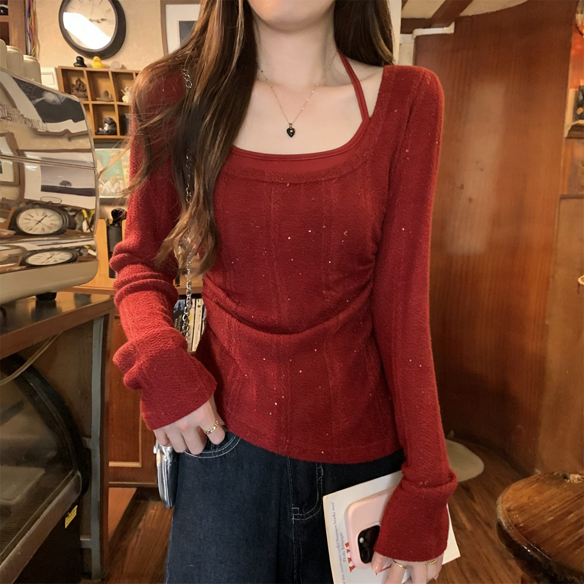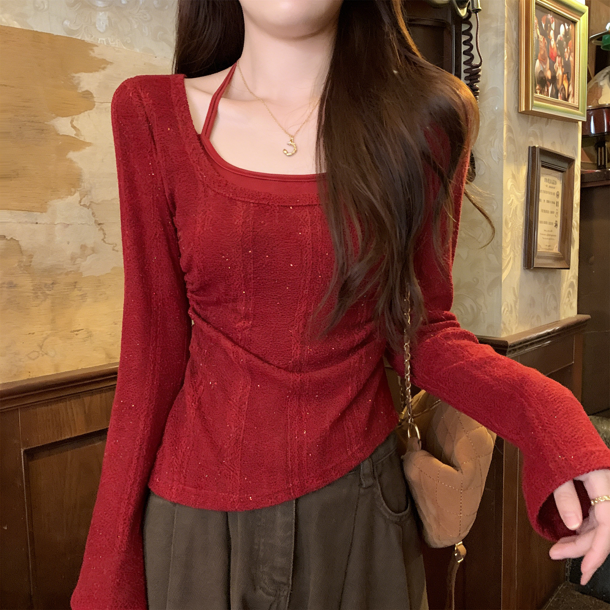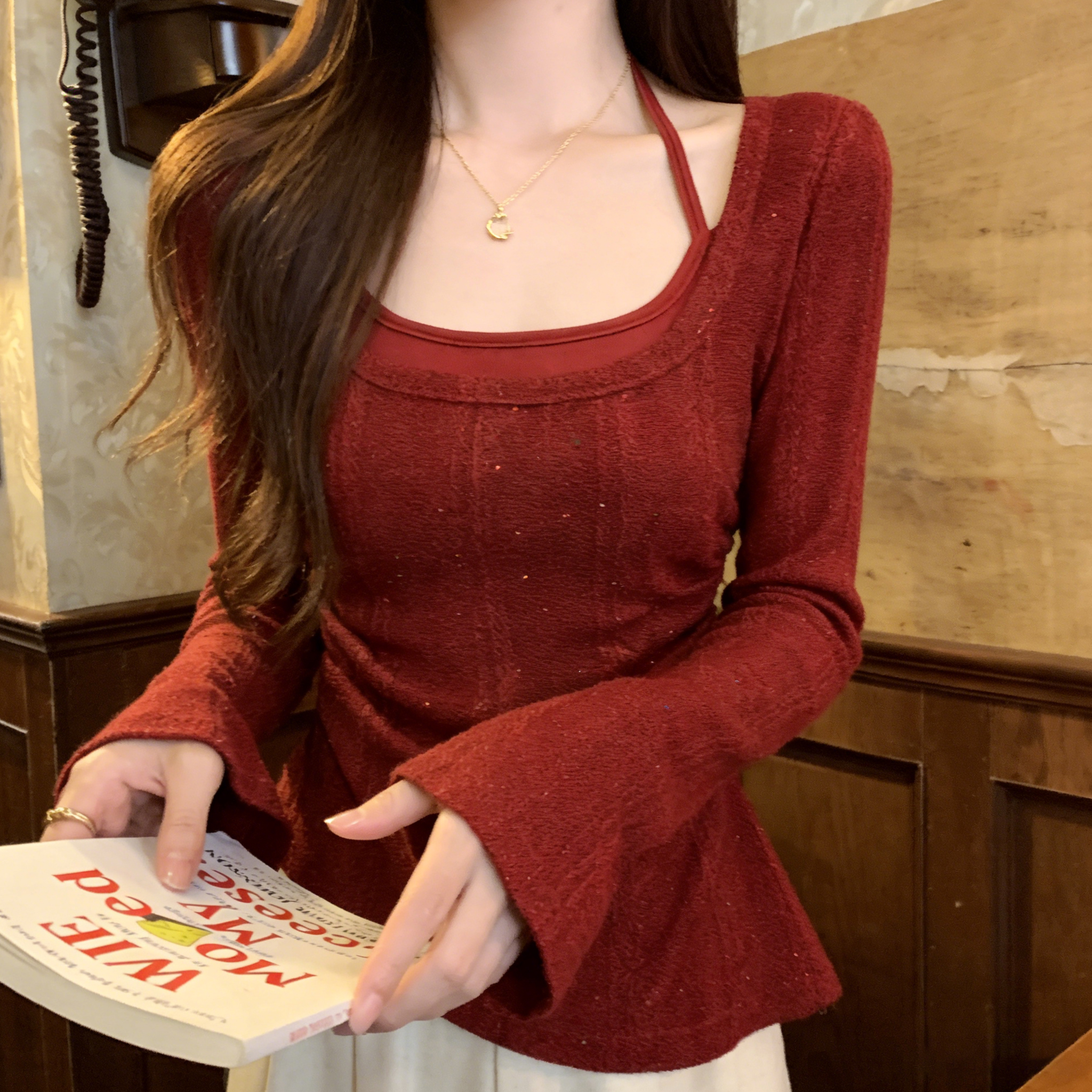 RY102# 实拍~假两件挂脖针织打底衫女大码胖M显瘦遮肉设计感收腰内搭上衣