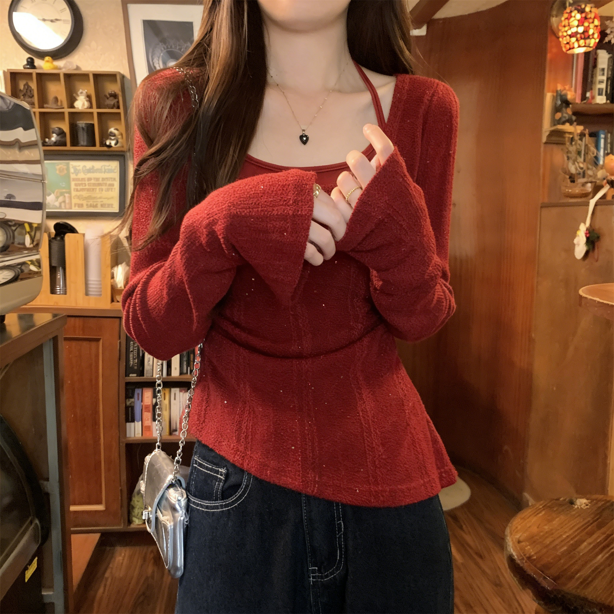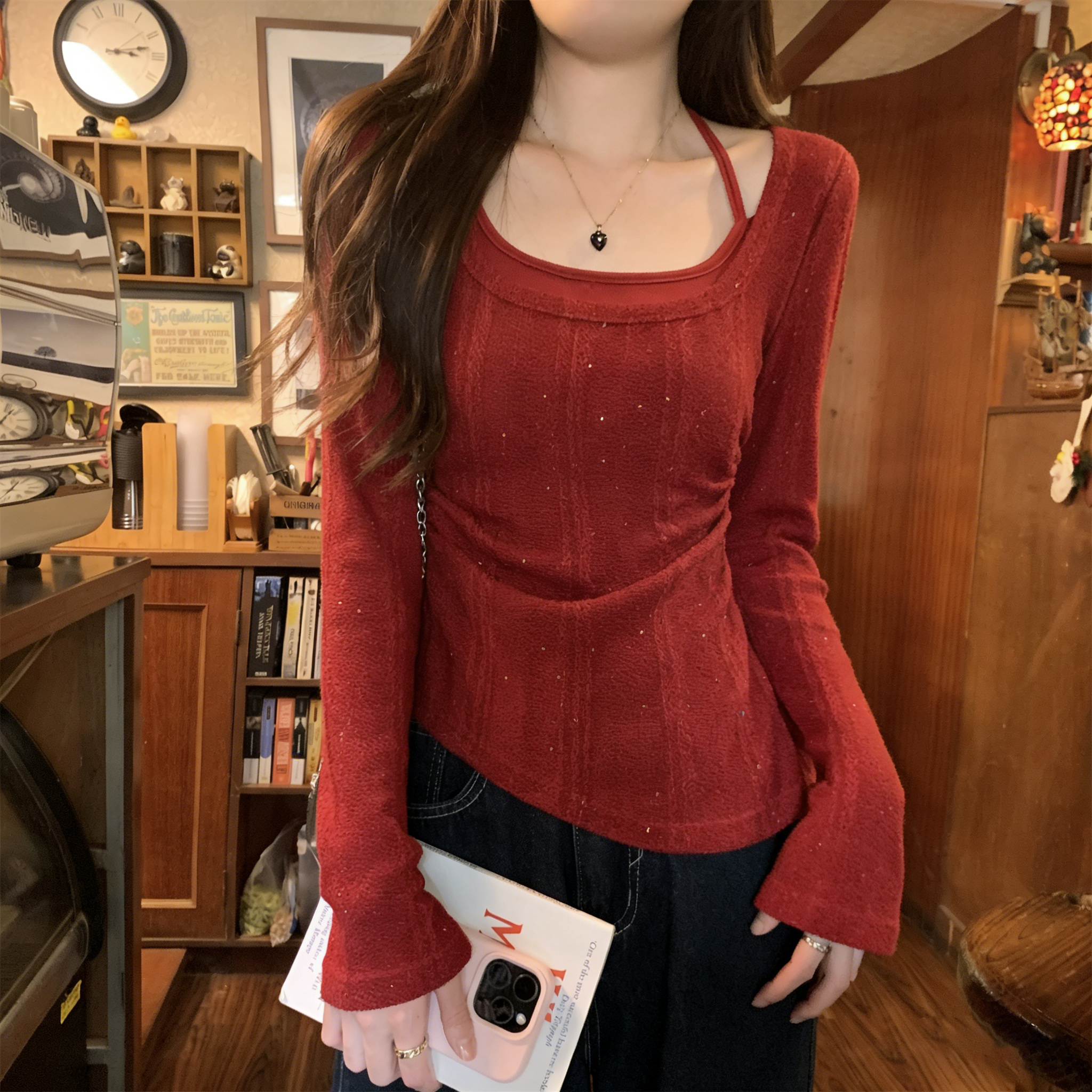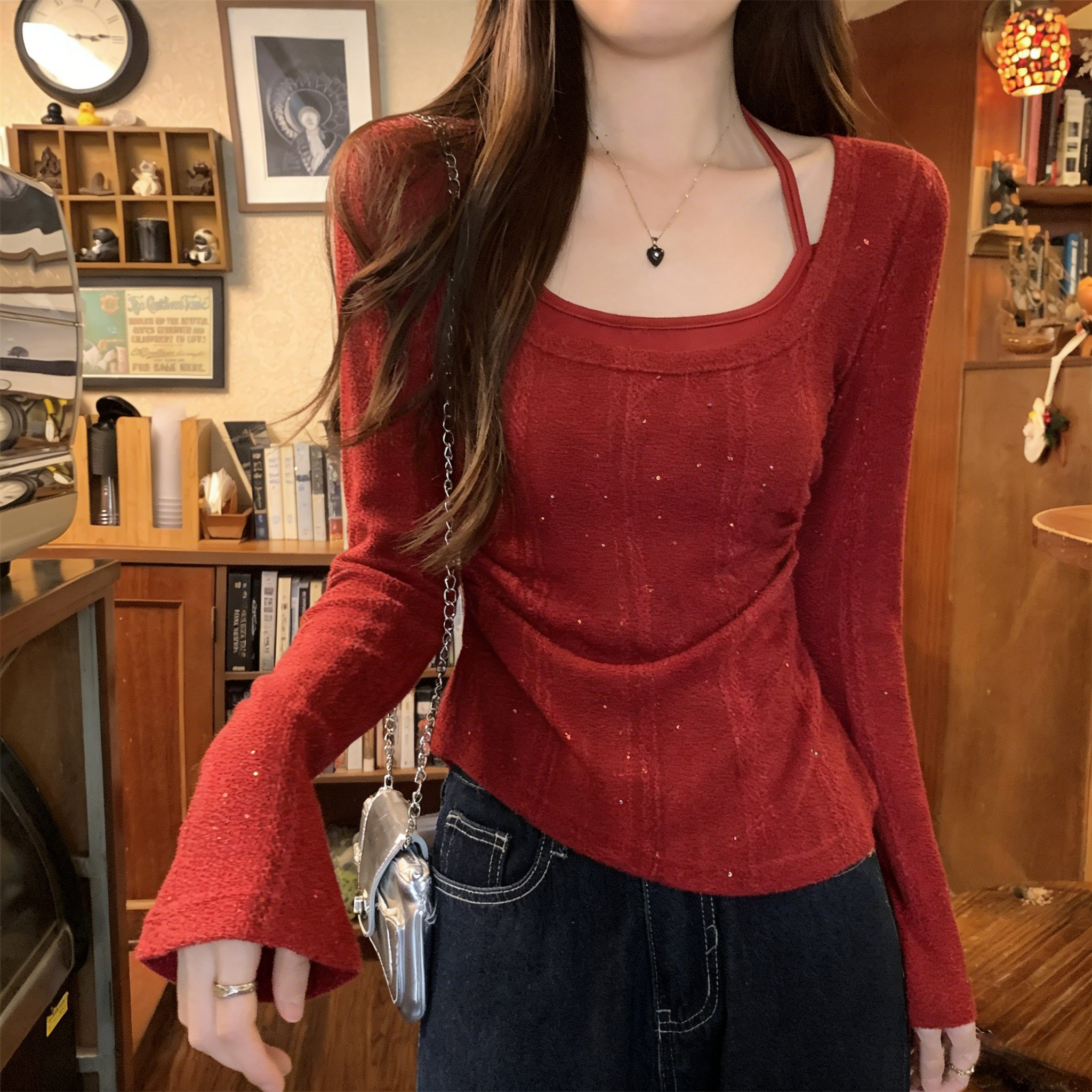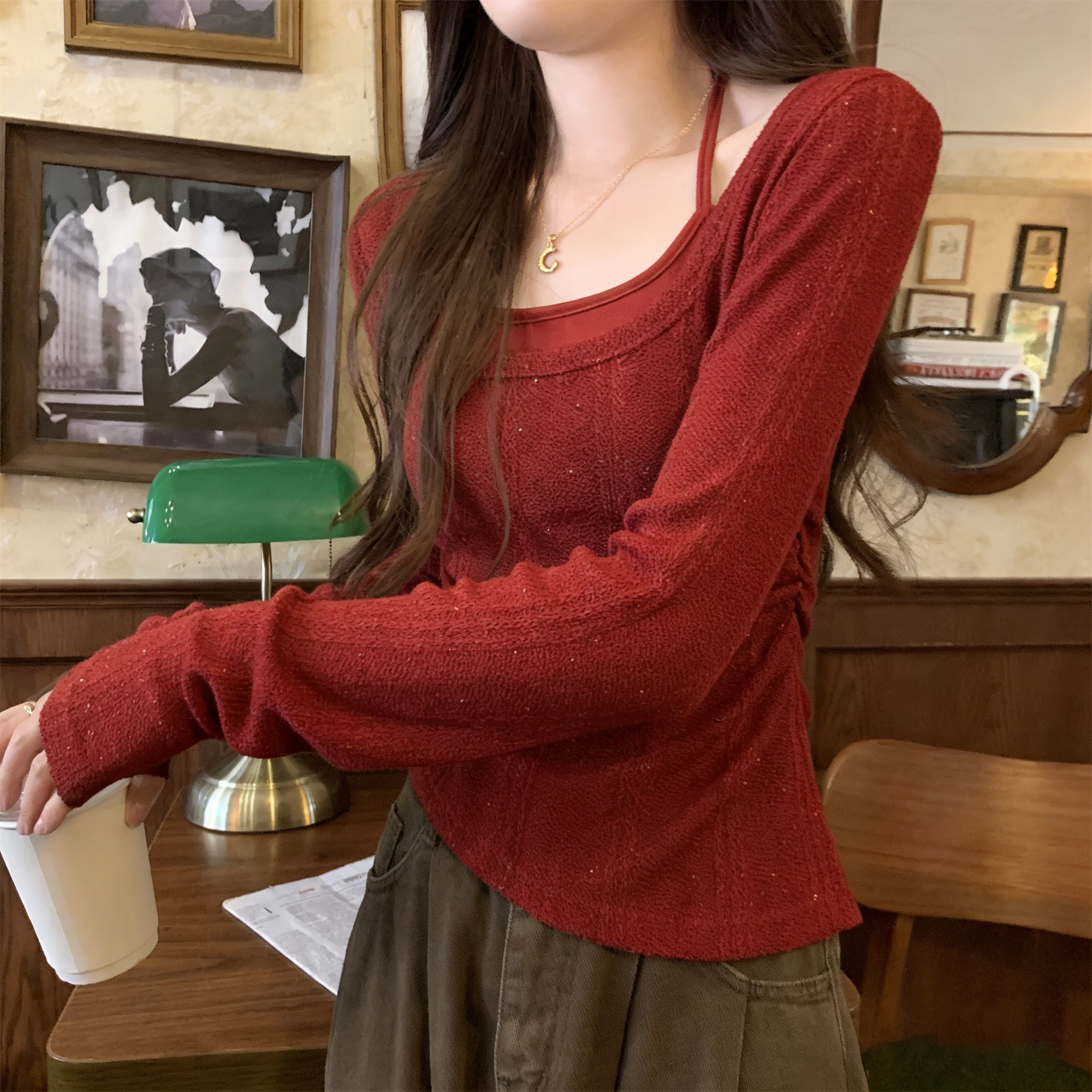 RY102# 实拍~假两件挂脖针织打底衫女大码胖M显瘦遮肉设计感收腰内搭上衣