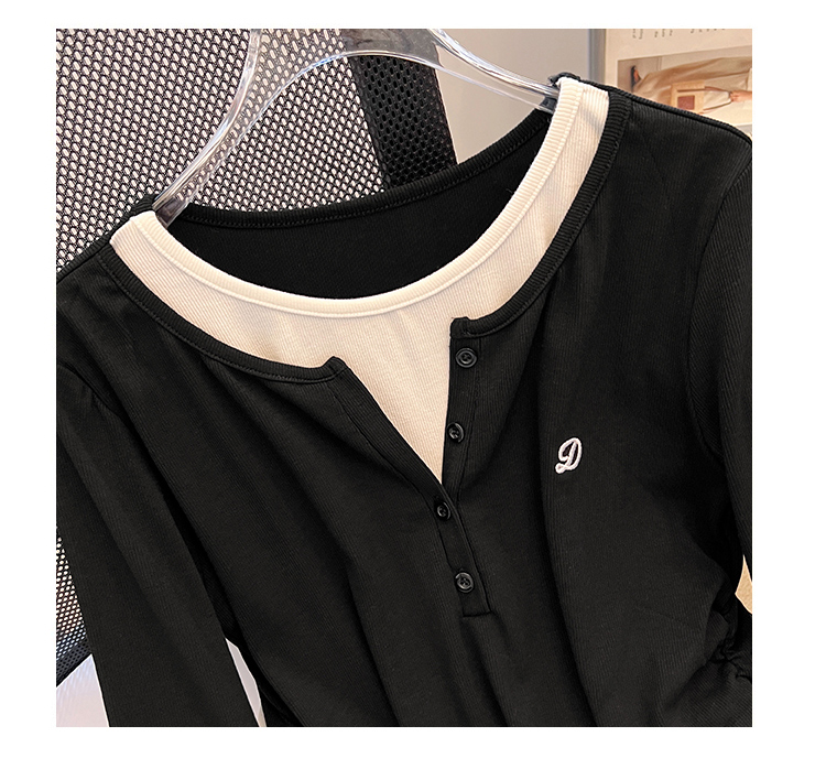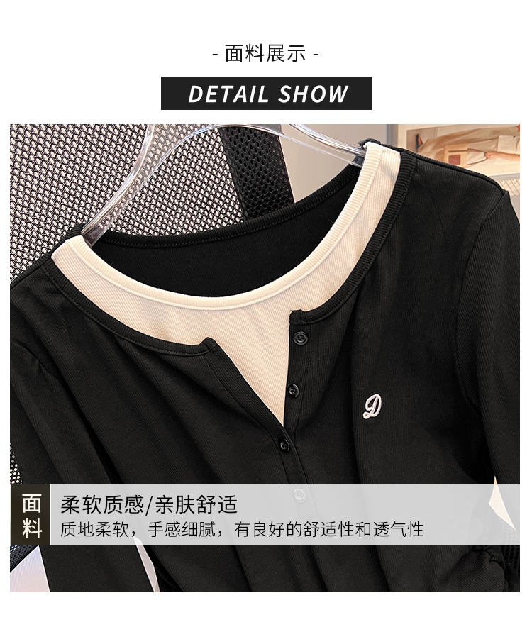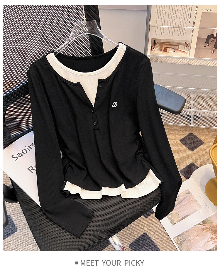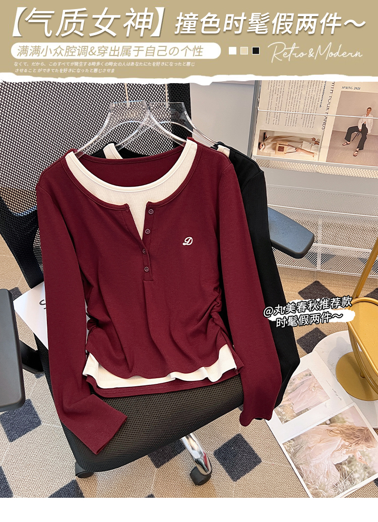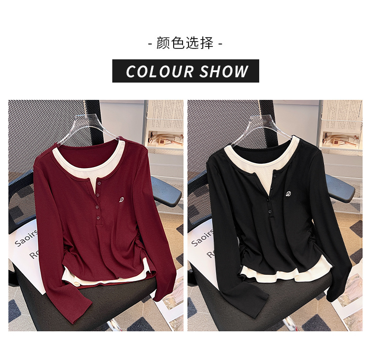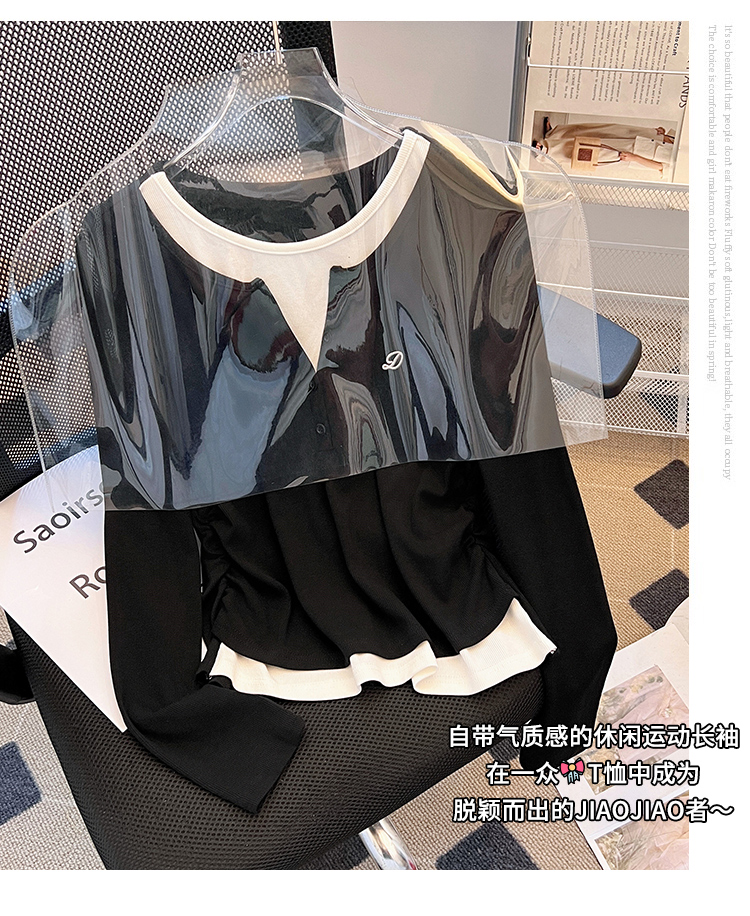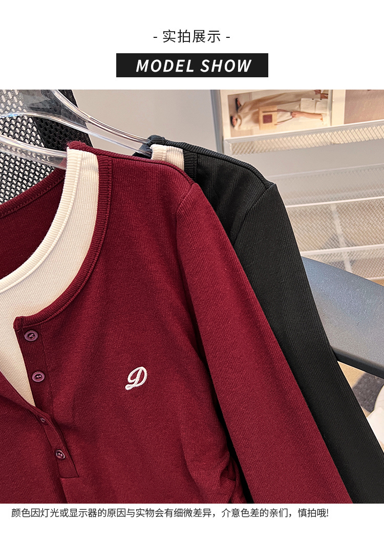 RY200# 实拍2026新款假两件撞色长袖T恤女收腰百搭圆领标准上衣