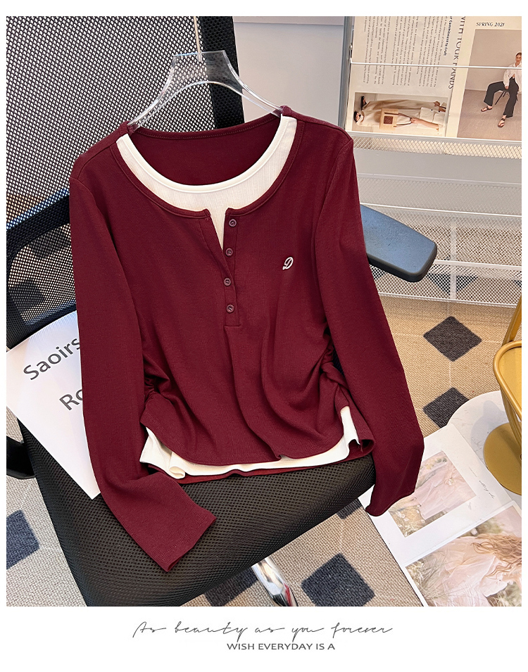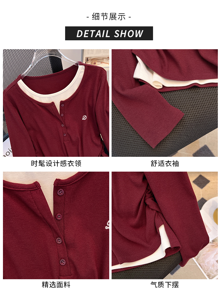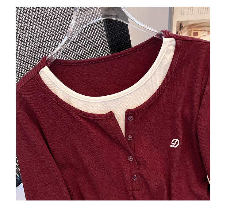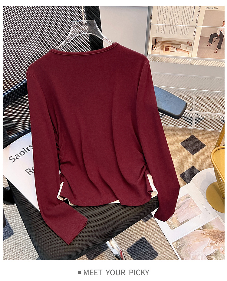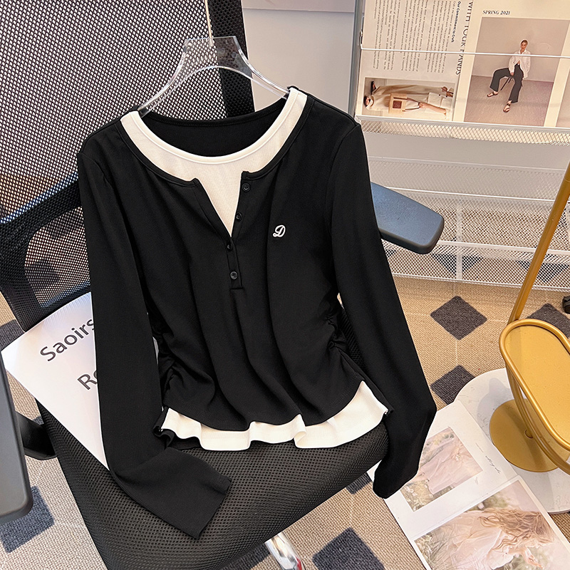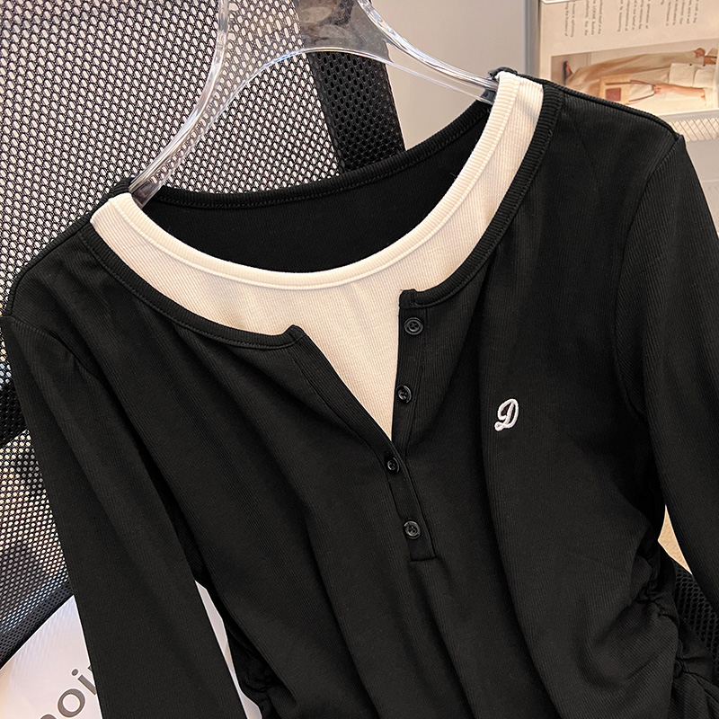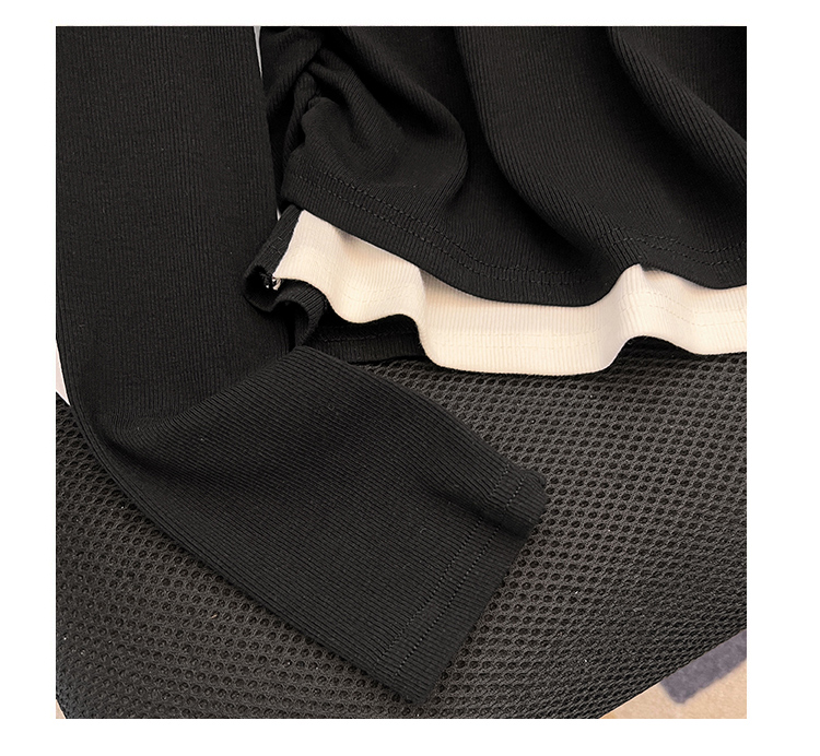 RY200# 实拍2026新款假两件撞色长袖T恤女收腰百搭圆领标准上衣