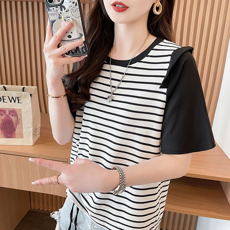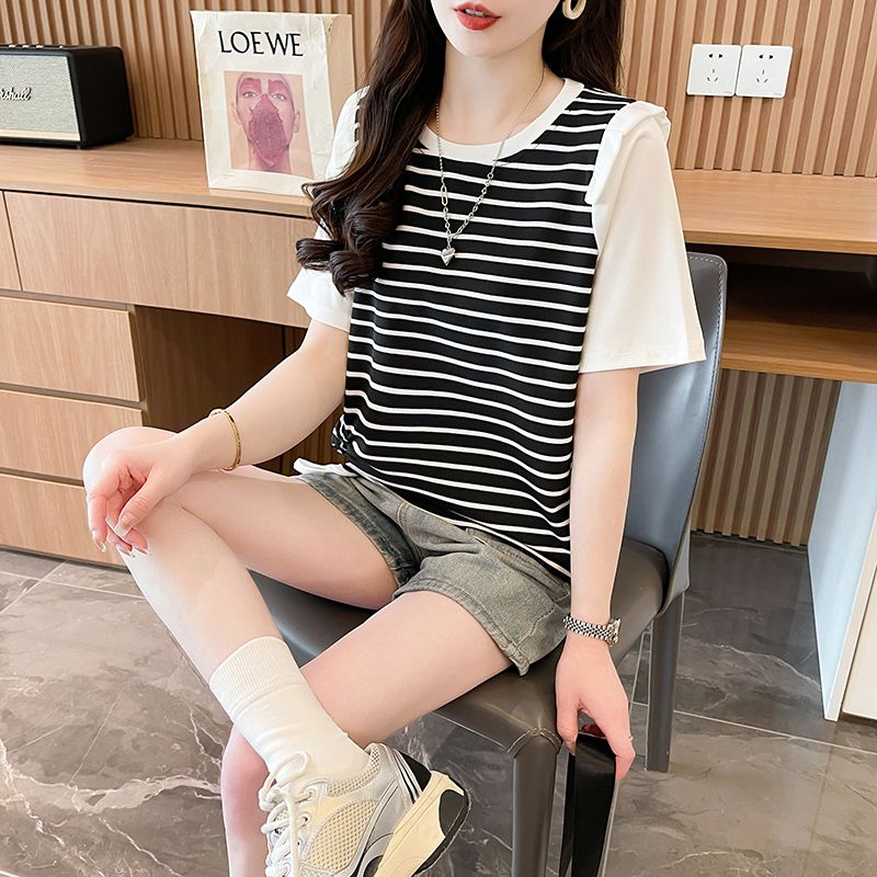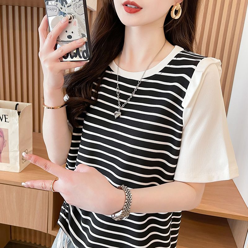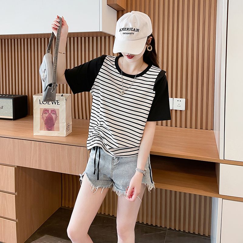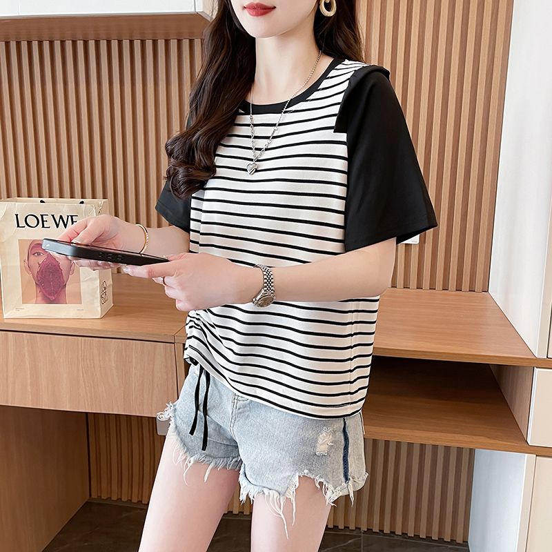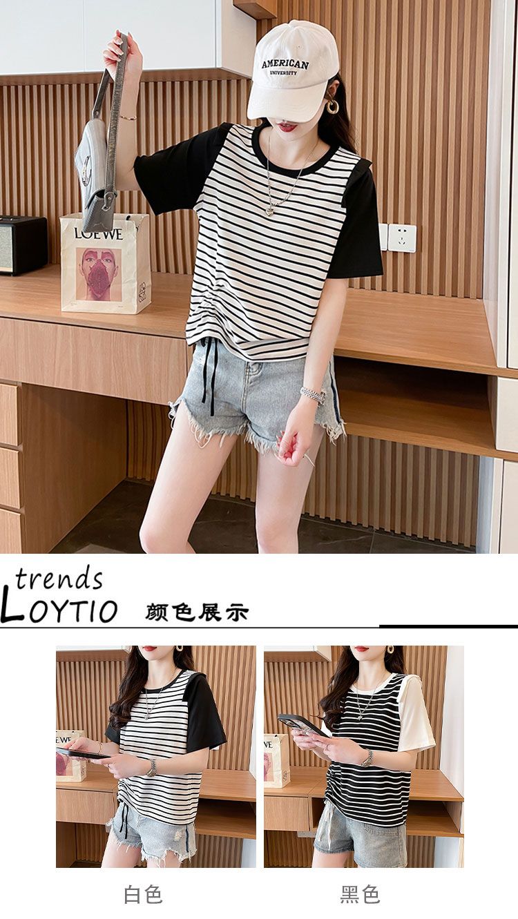 RY359# 实拍2026夏季韩版撞色圆领百搭时尚大码宽松条纹短袖T恤女