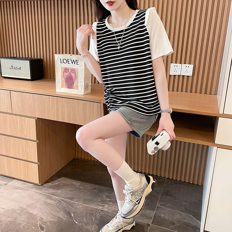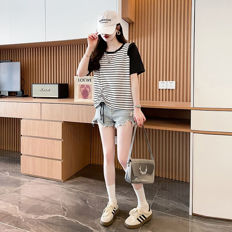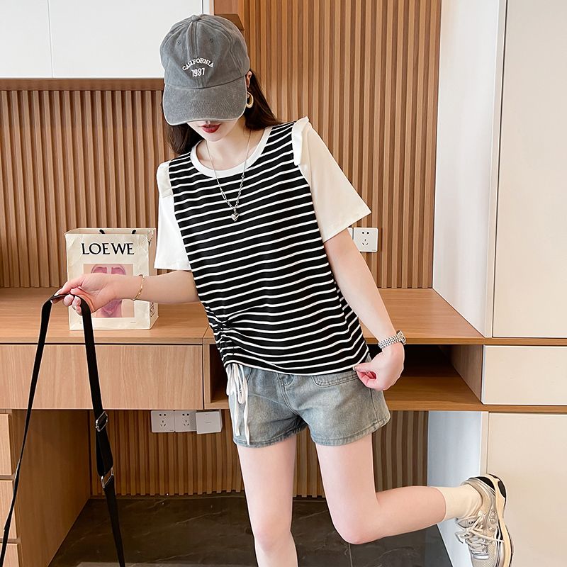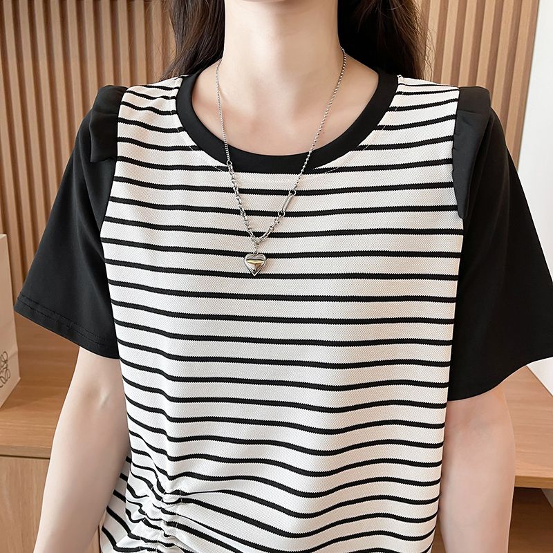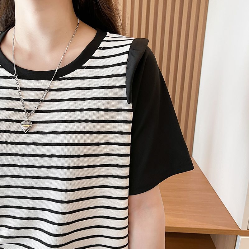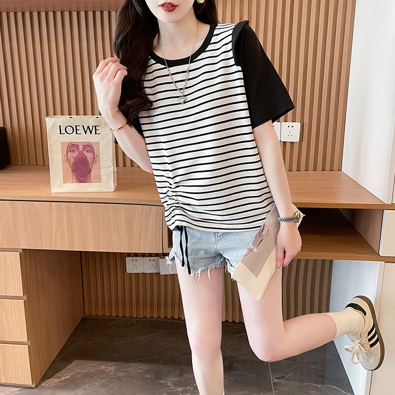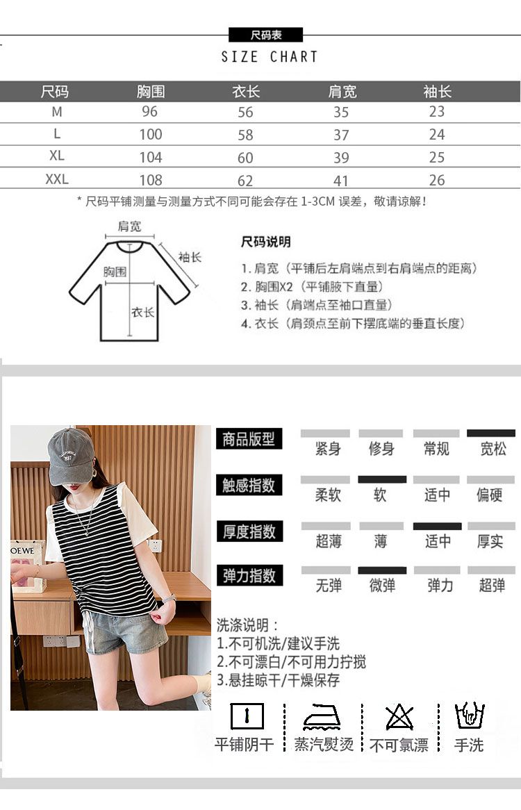 RY359# 实拍2026夏季韩版撞色圆领百搭时尚大码宽松条纹短袖T恤女