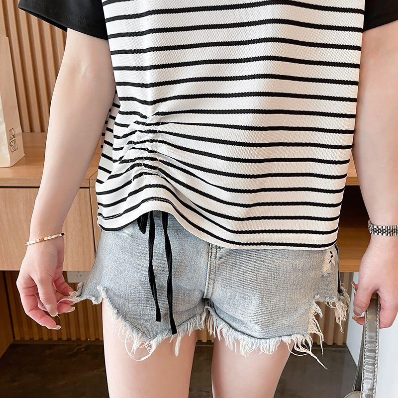 RY362# 实拍2026夏季时尚大码宽松胖mm显瘦v领打底衫条纹短袖T恤...