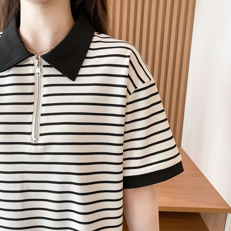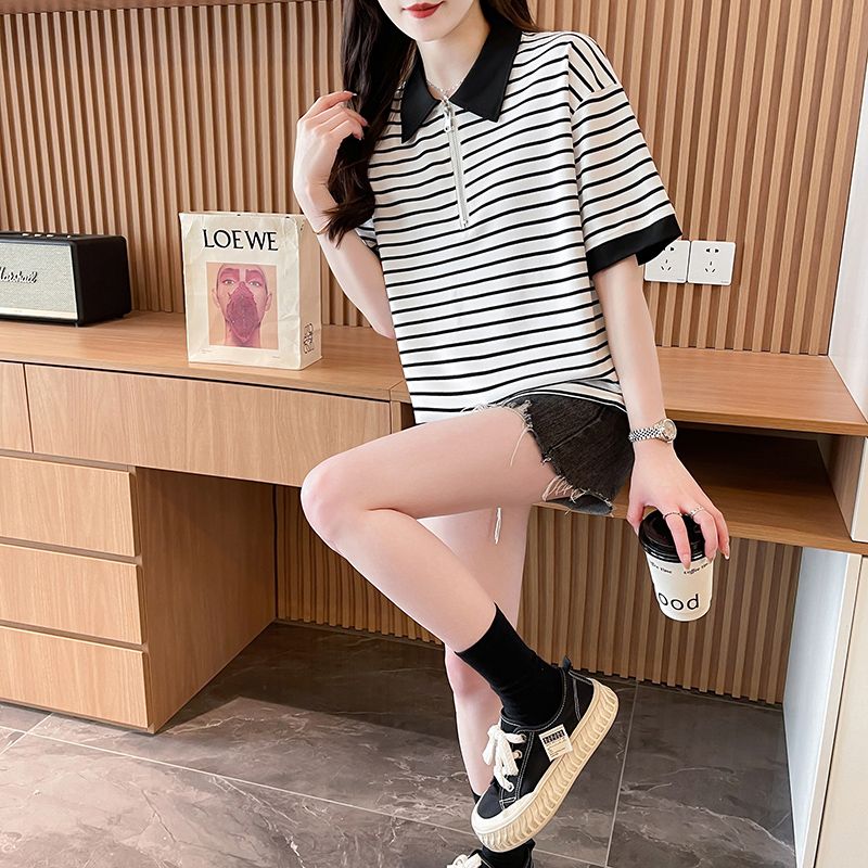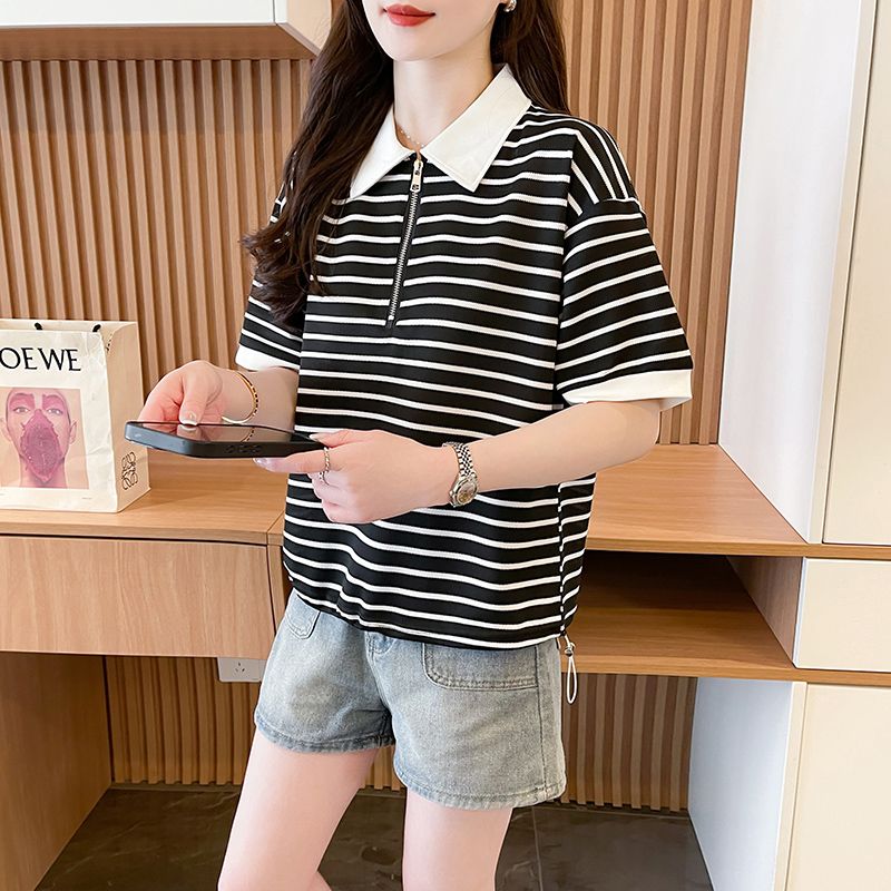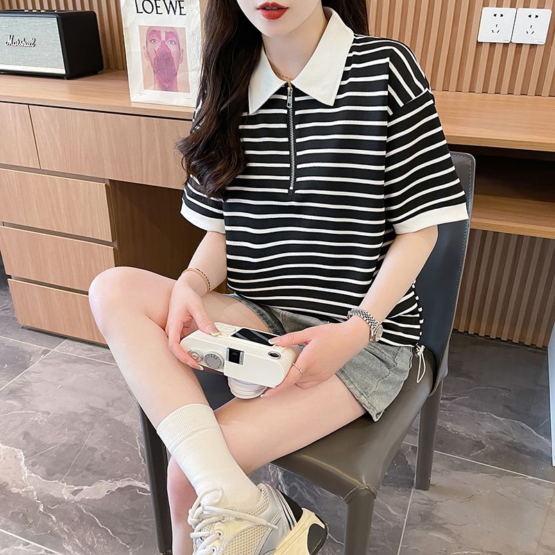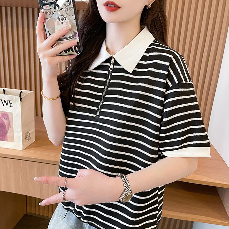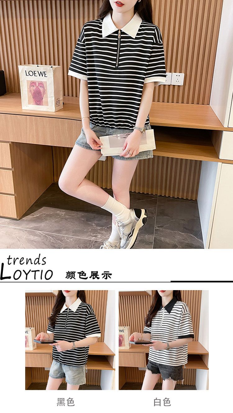 RY361# 实拍2026夏季polo领宽松显瘦百搭时尚半拉链条纹短袖T恤女