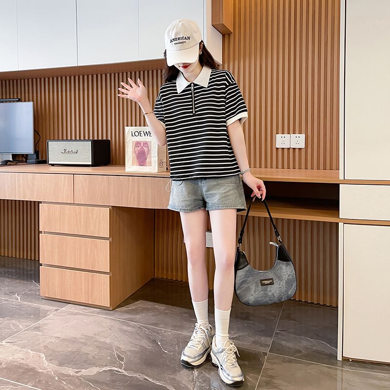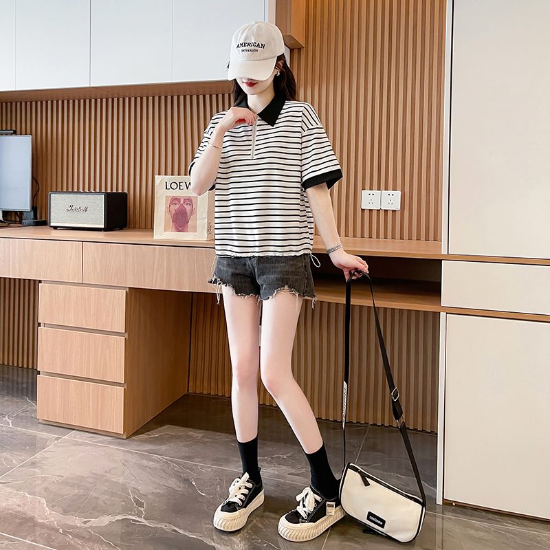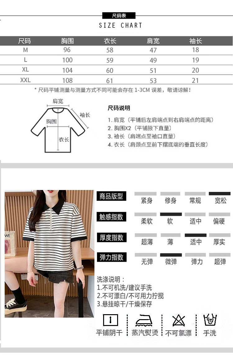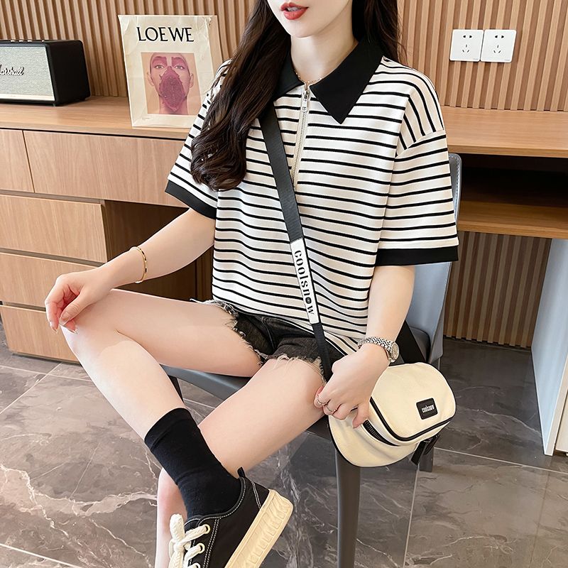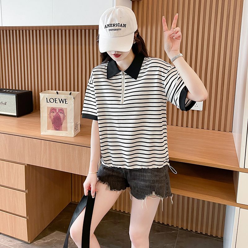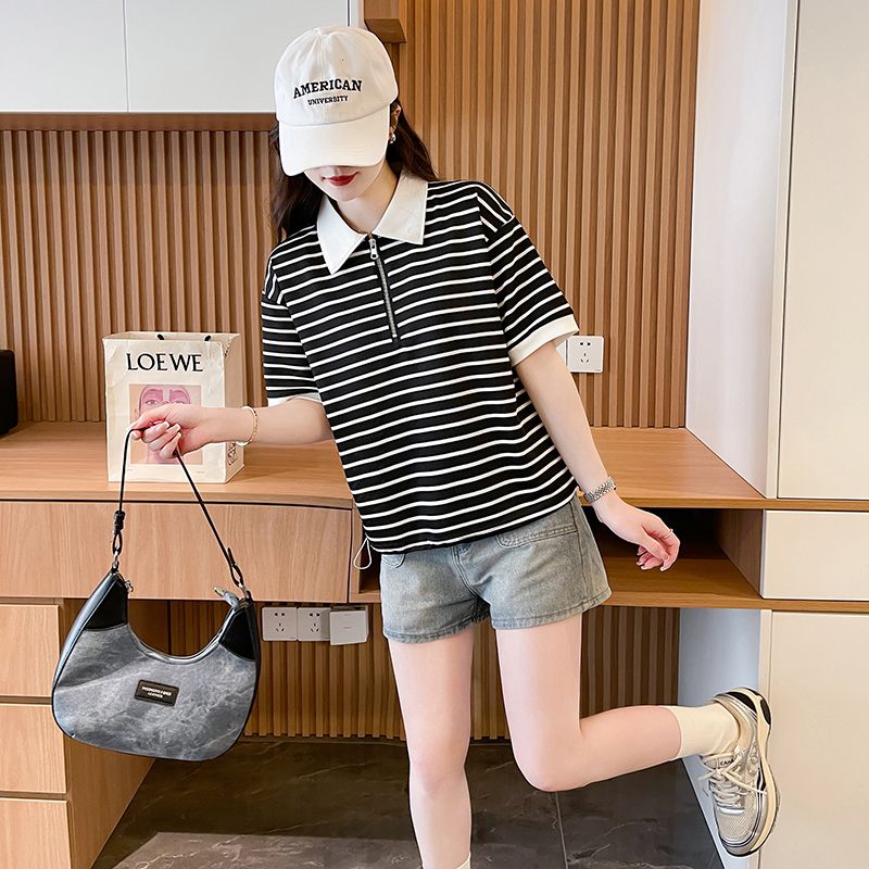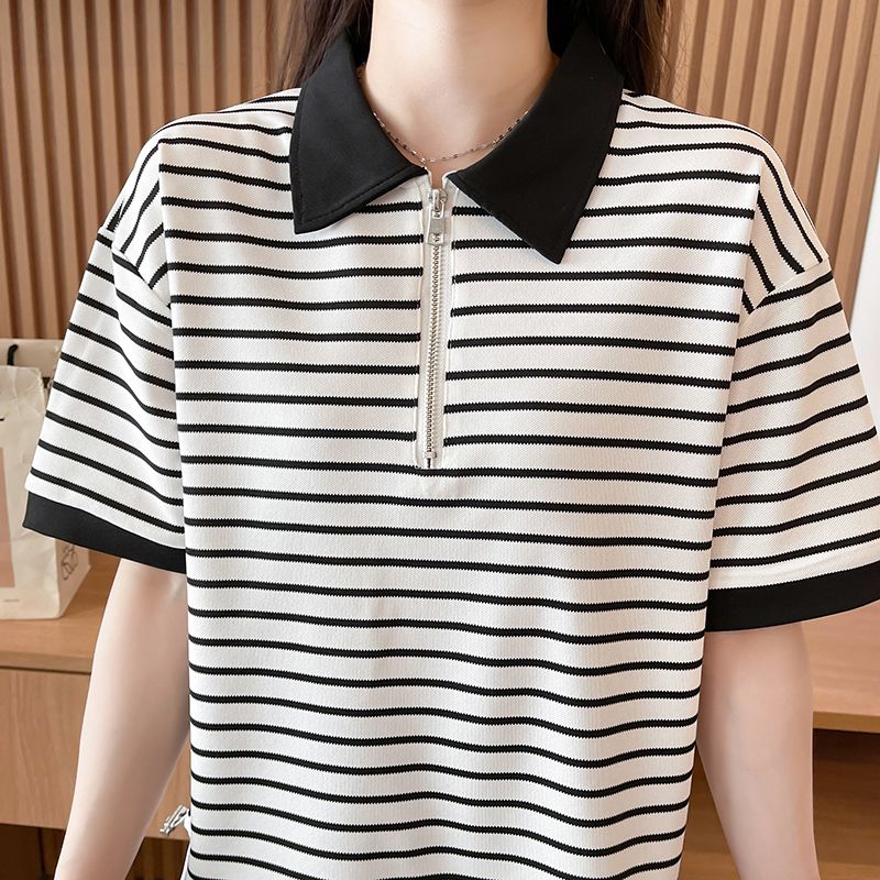 RY361# 实拍2026夏季polo领宽松显瘦百搭时尚半拉链条纹短袖T恤女