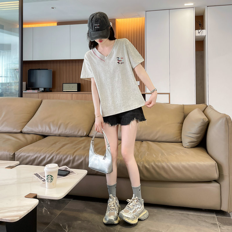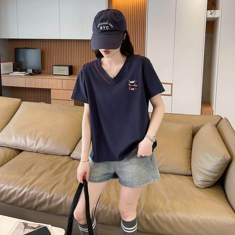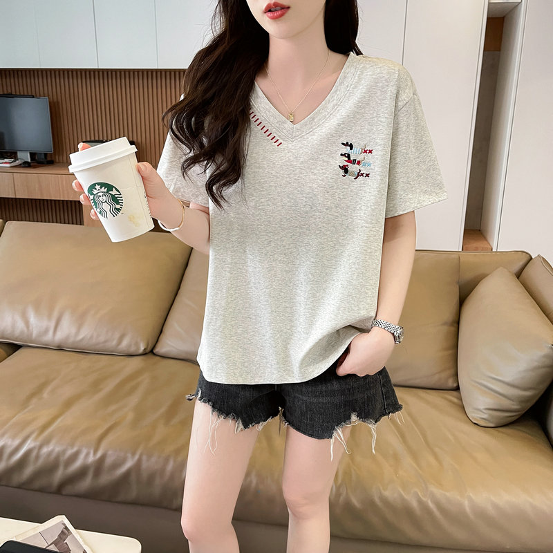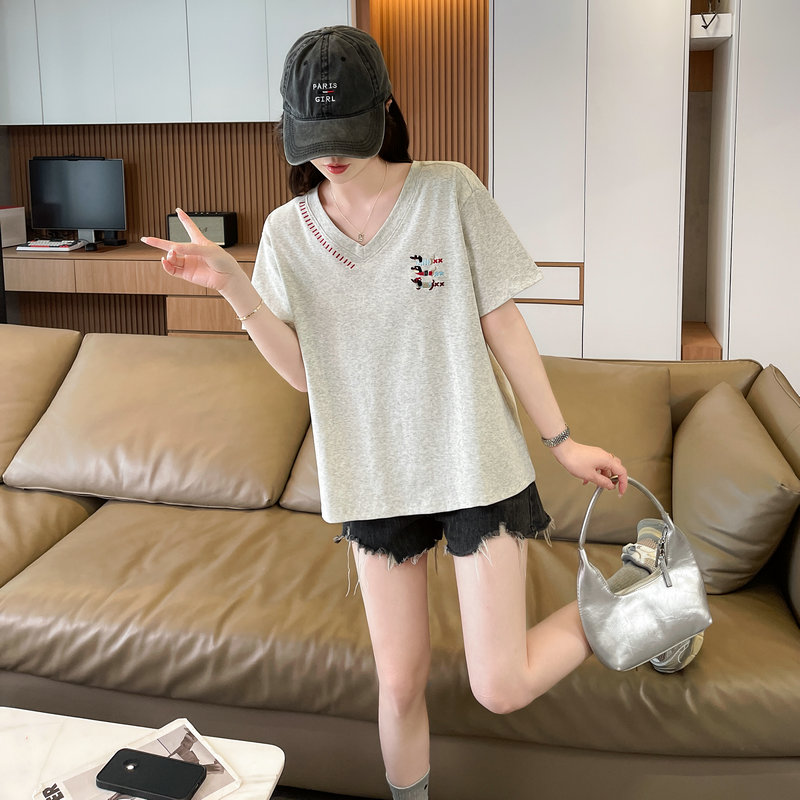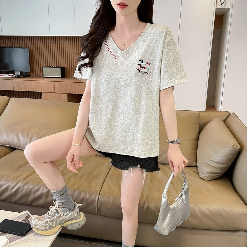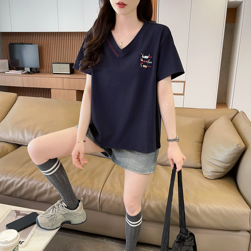 RY377# 实拍2026夏季新款V领短袖宽松型中长款大码T恤时尚透气显瘦...