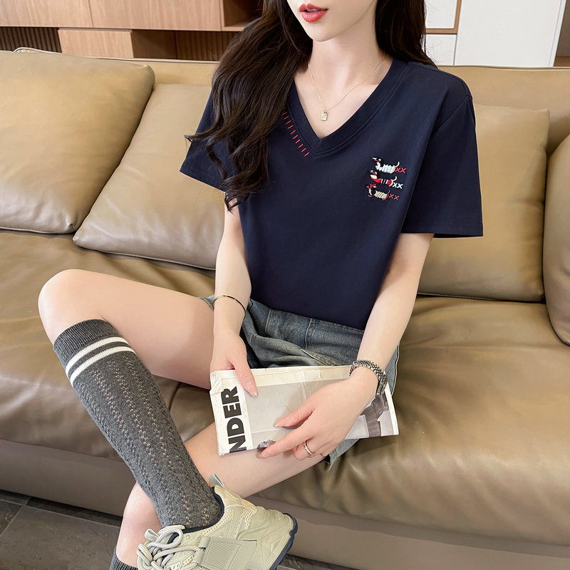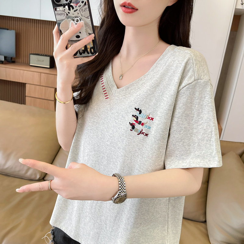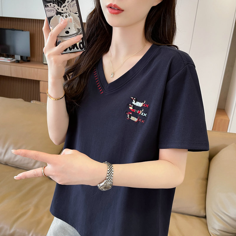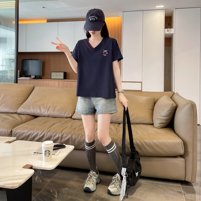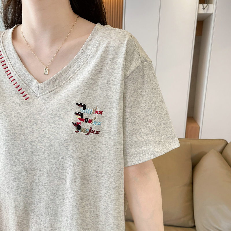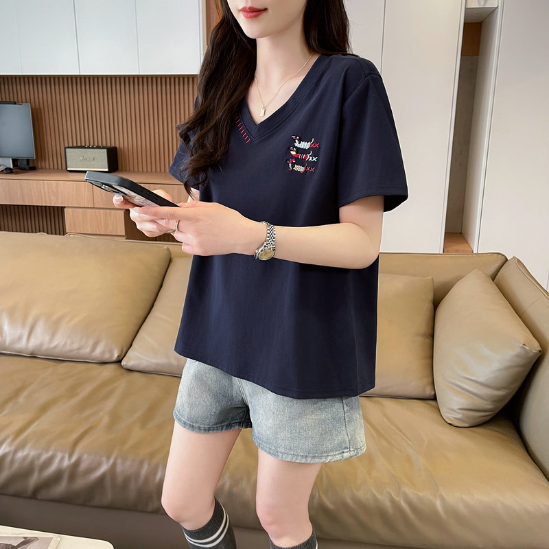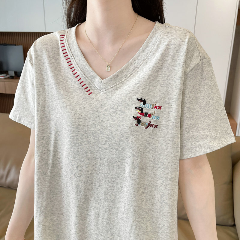 RY377# 实拍2026夏季新款V领短袖宽松型中长款大码T恤时尚透气显瘦...