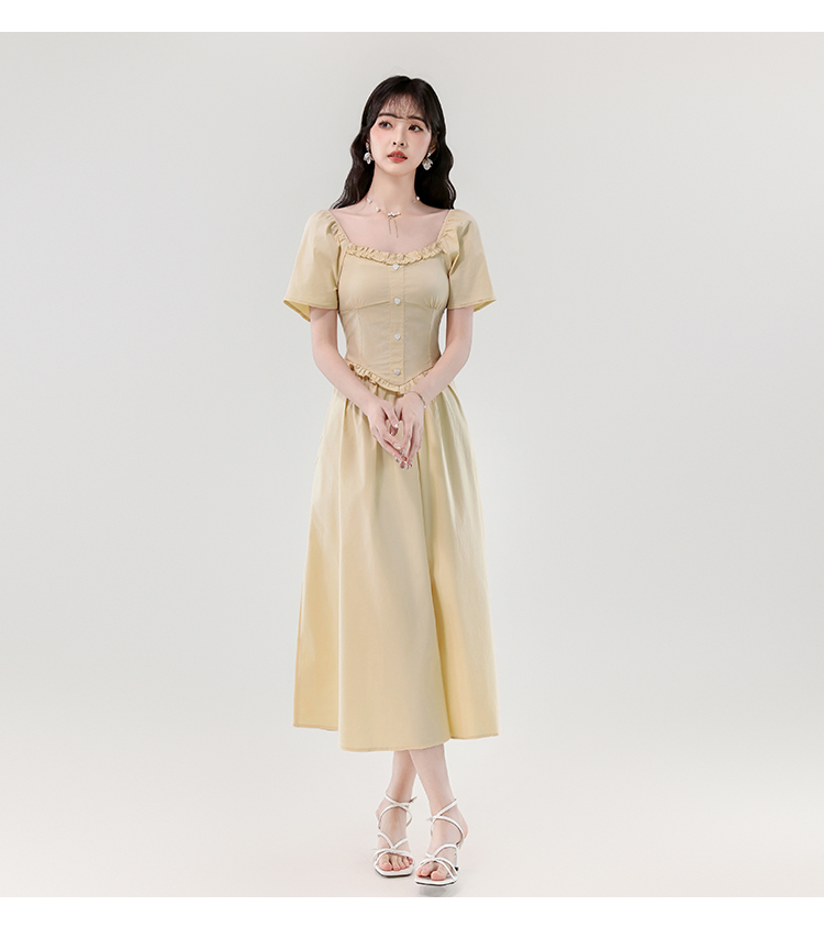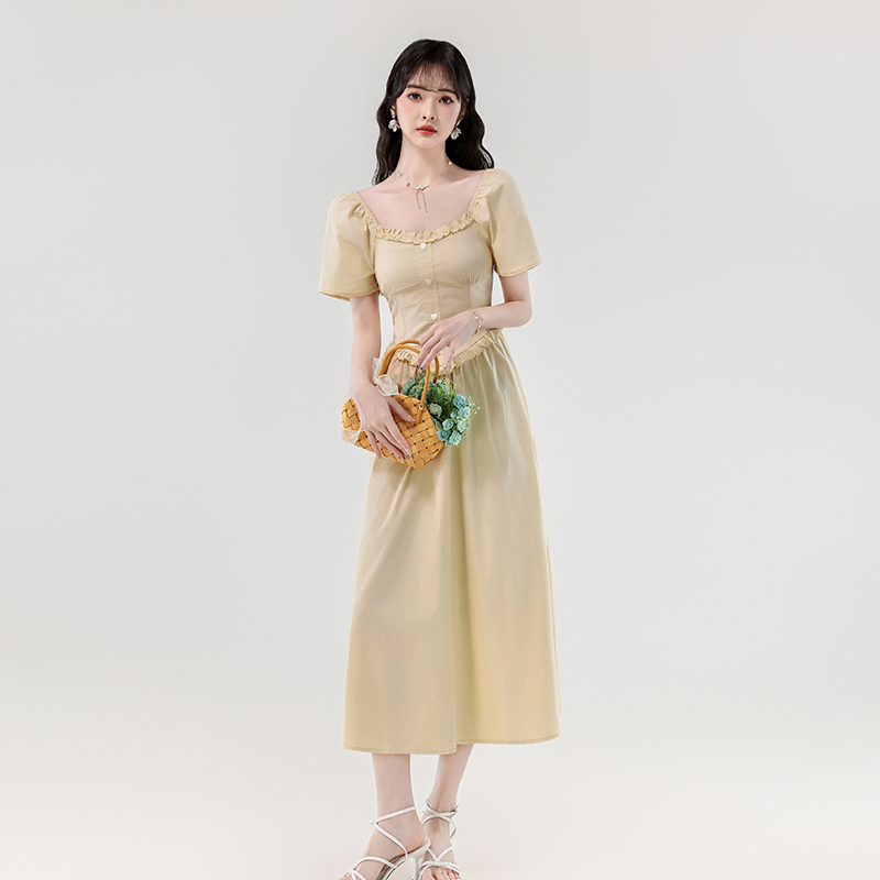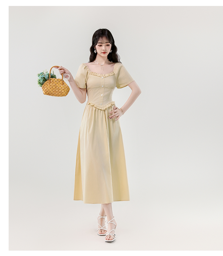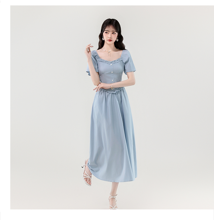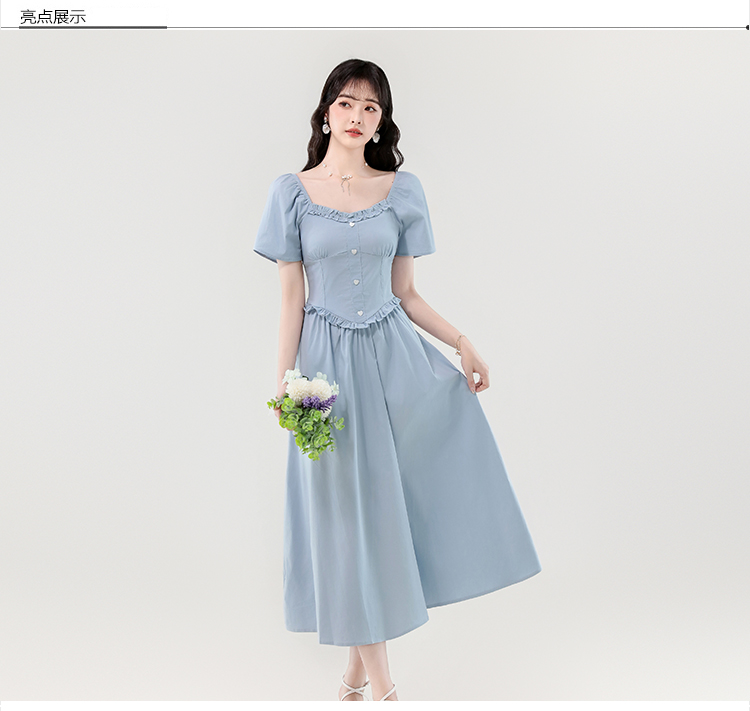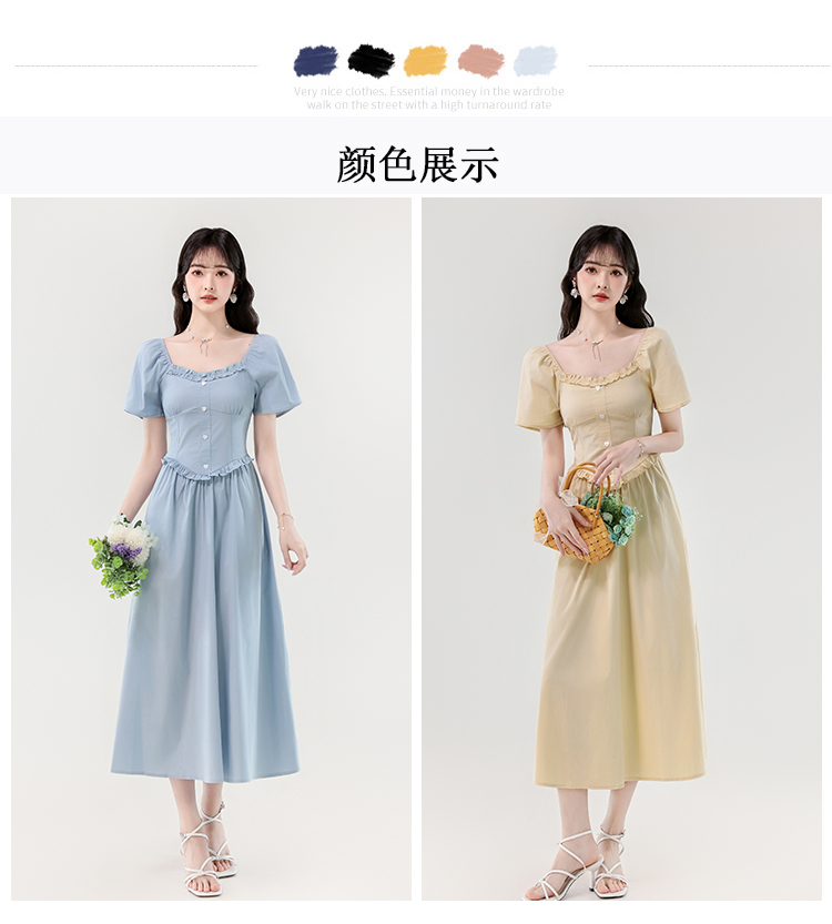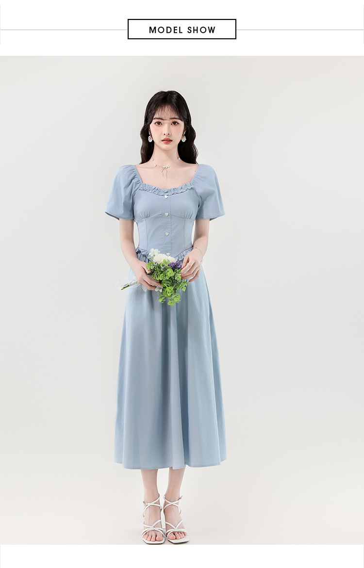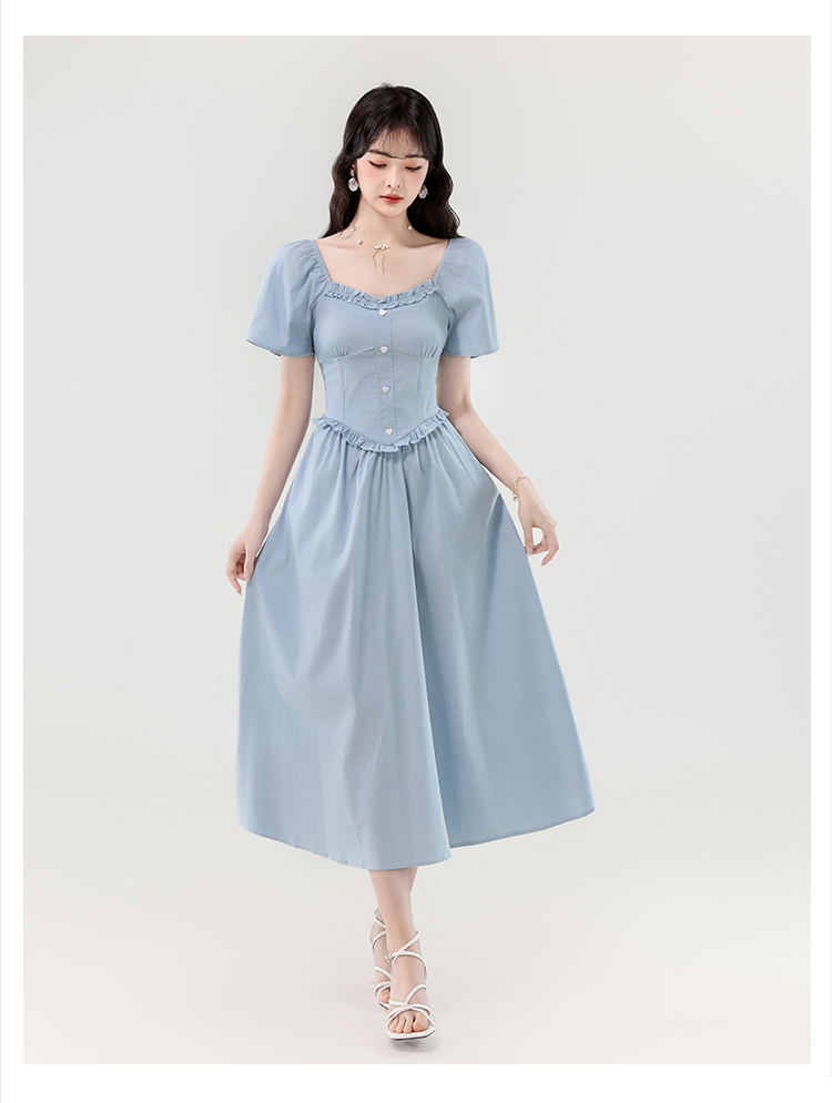 RY388# 实拍2026夏新款甜美减龄方领木耳边爱心扣弹力收腰显瘦长款连衣裙
