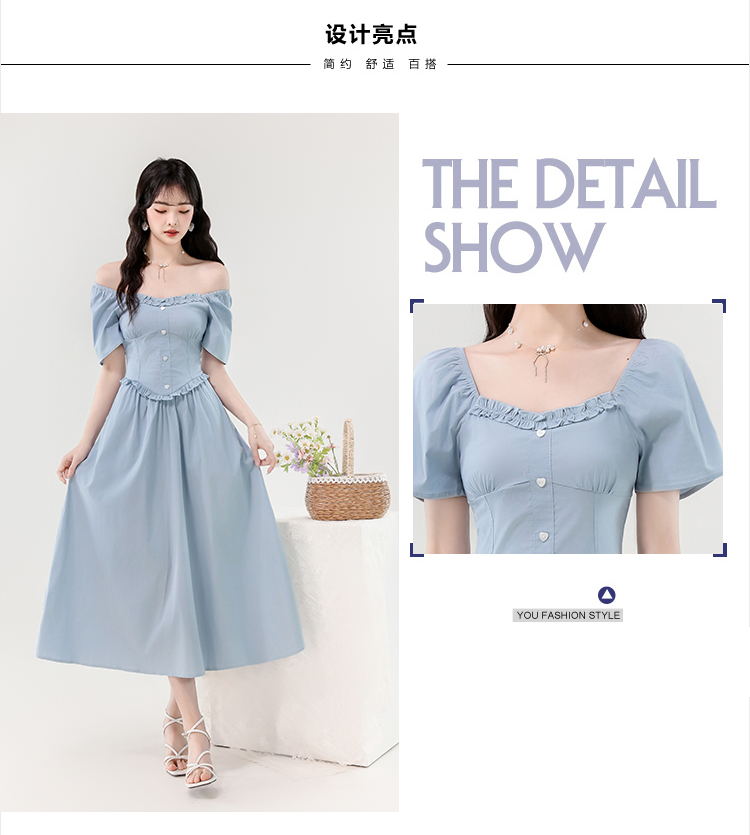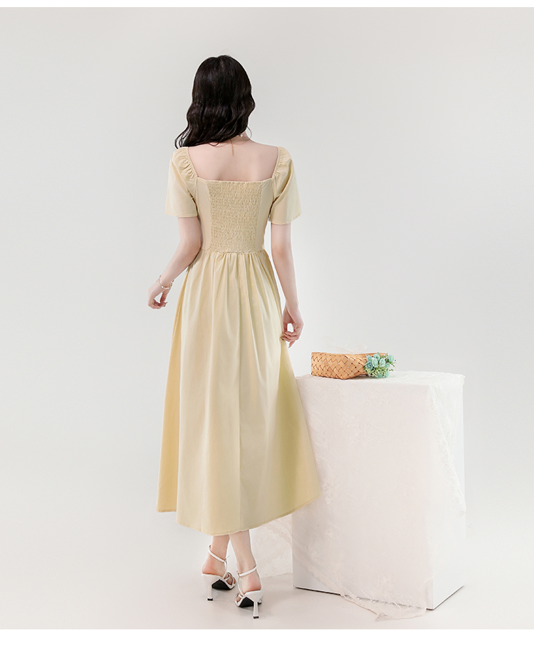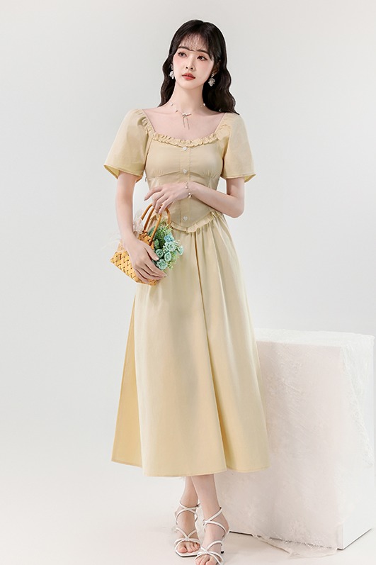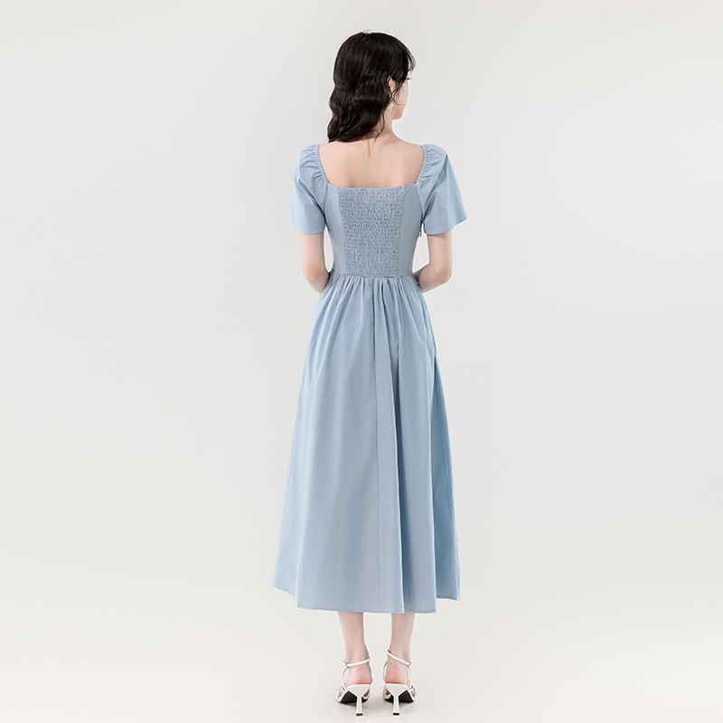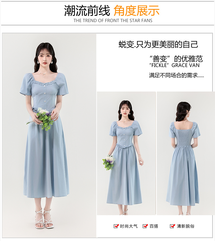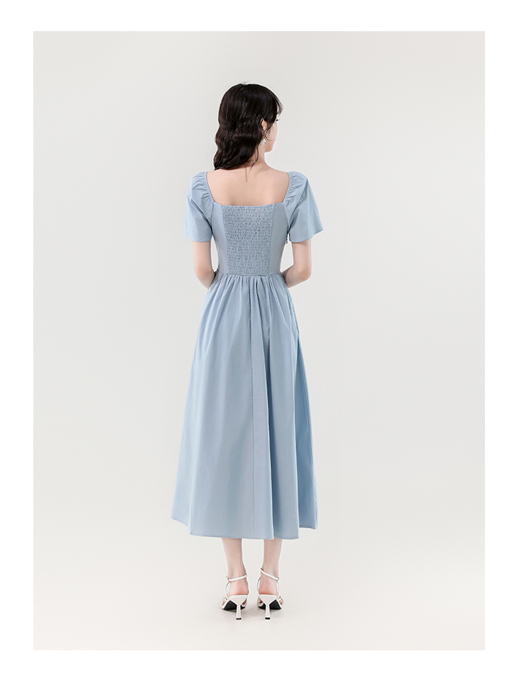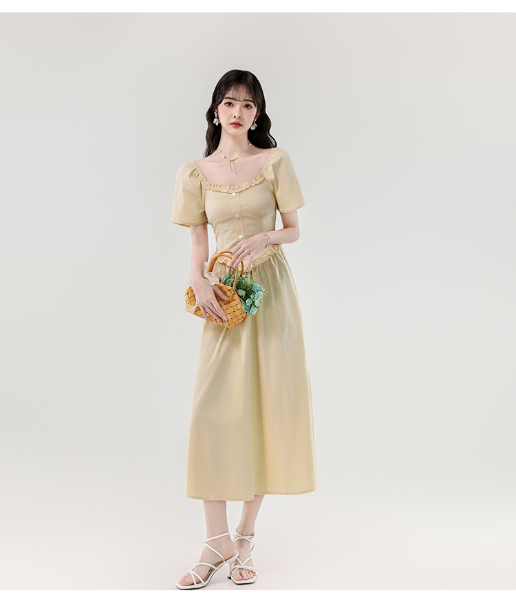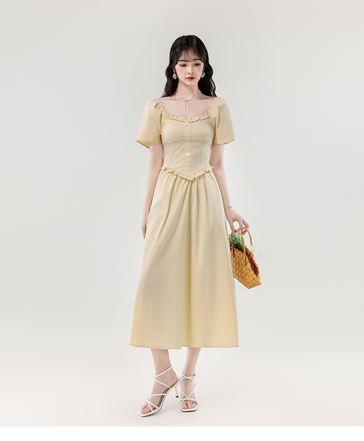 RY388# 实拍2026夏新款甜美减龄方领木耳边爱心扣弹力收腰显瘦长款连衣裙