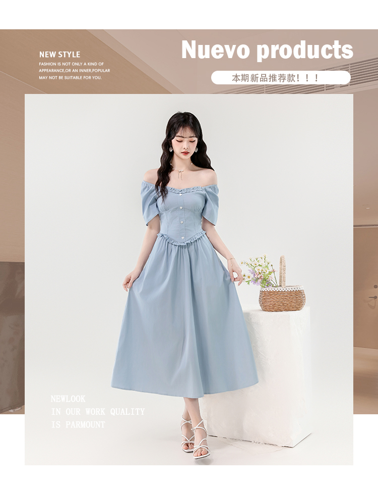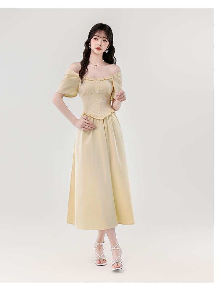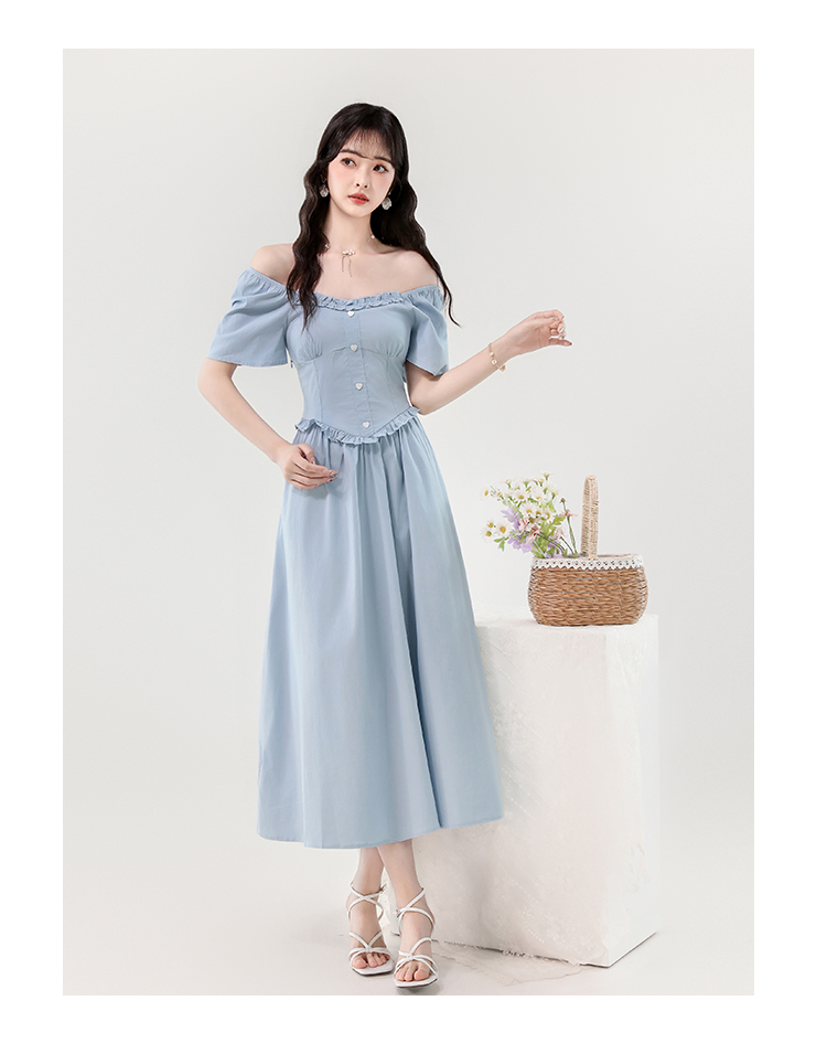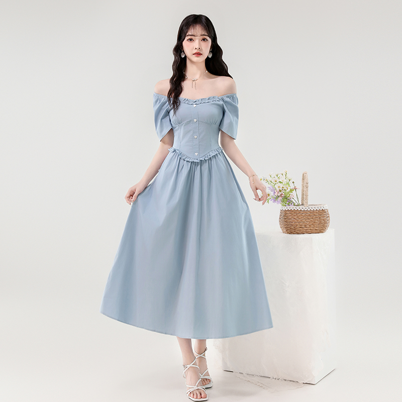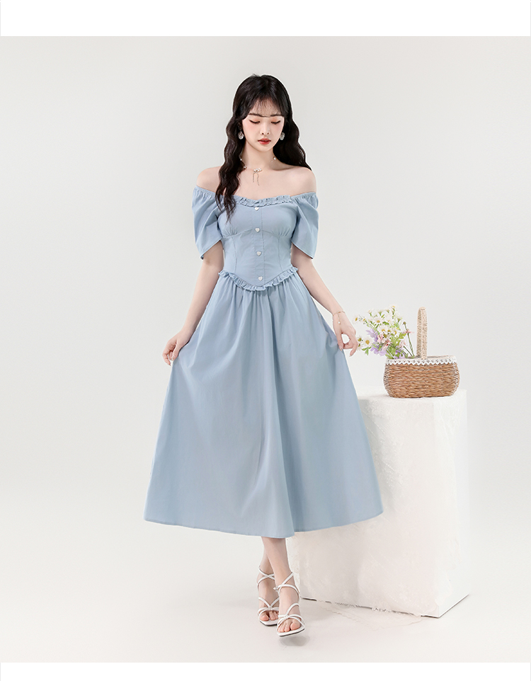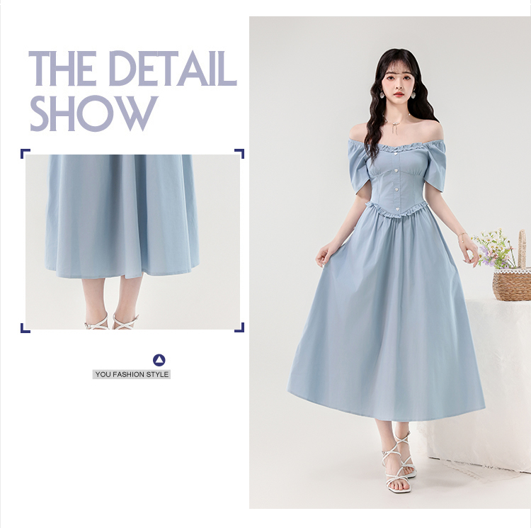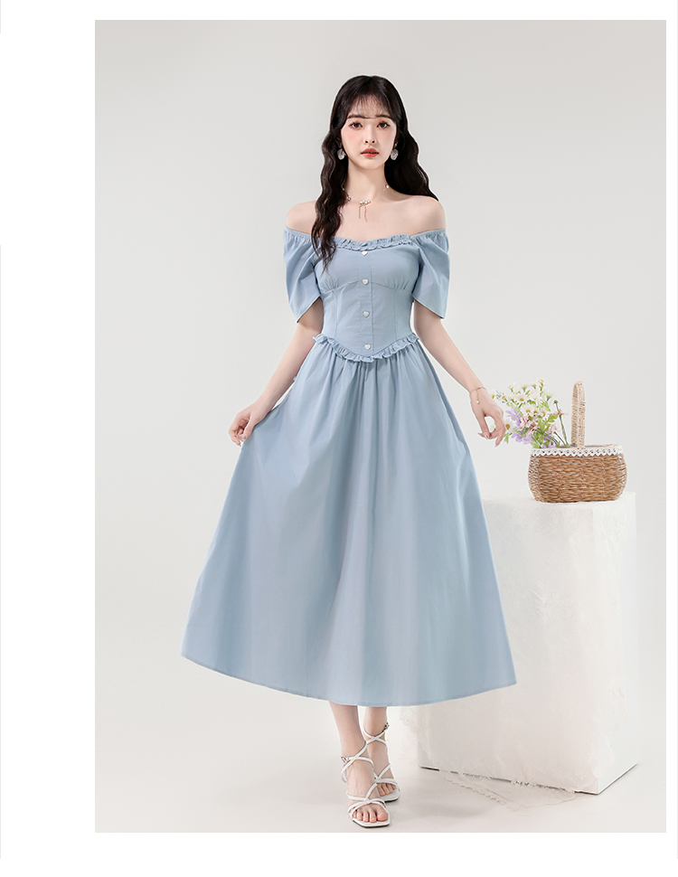 RY388# 实拍2026夏新款甜美减龄方领木耳边爱心扣弹力收腰显瘦长款连衣裙